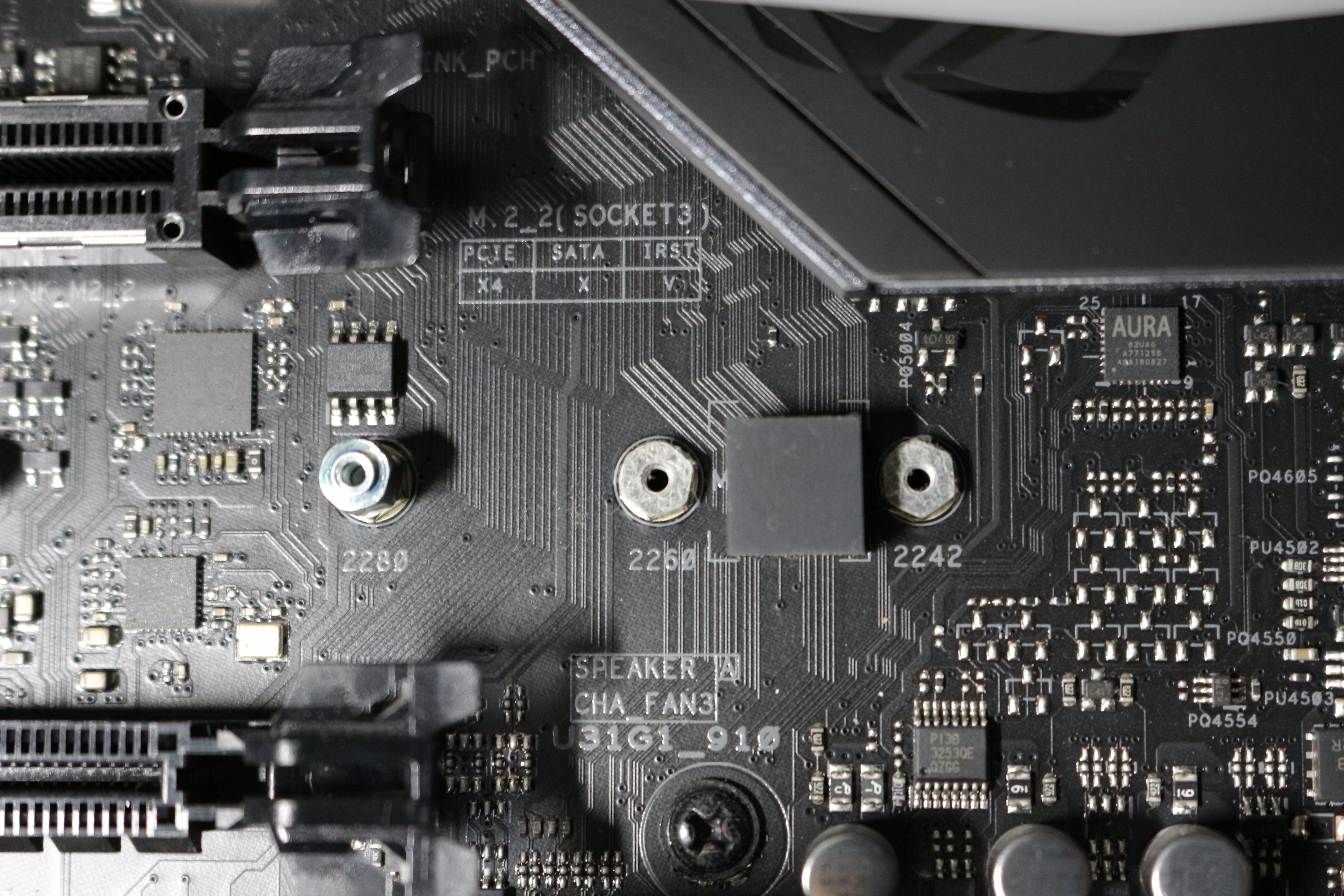 일단 스탠드오프처럼 생긴 나사를 장착할 제품 규격에 맞는 위치에 끼워줍니다. 규격은 제품 스펙에서 확인 가능하고, 각 나사 구멍 아래에 규격이 적혀있습니다. 사진을 보시면 2280, 2260, 2242라고 적혀있는게 보이실겁니다(메인보드마다 지원하는 규격이 상이하기에 확인하시길 바랍니다.) 요즘 데스크탑용으로 나오는 제품들은 대부분 2280이기에 웬만하면 2280일겁니다.