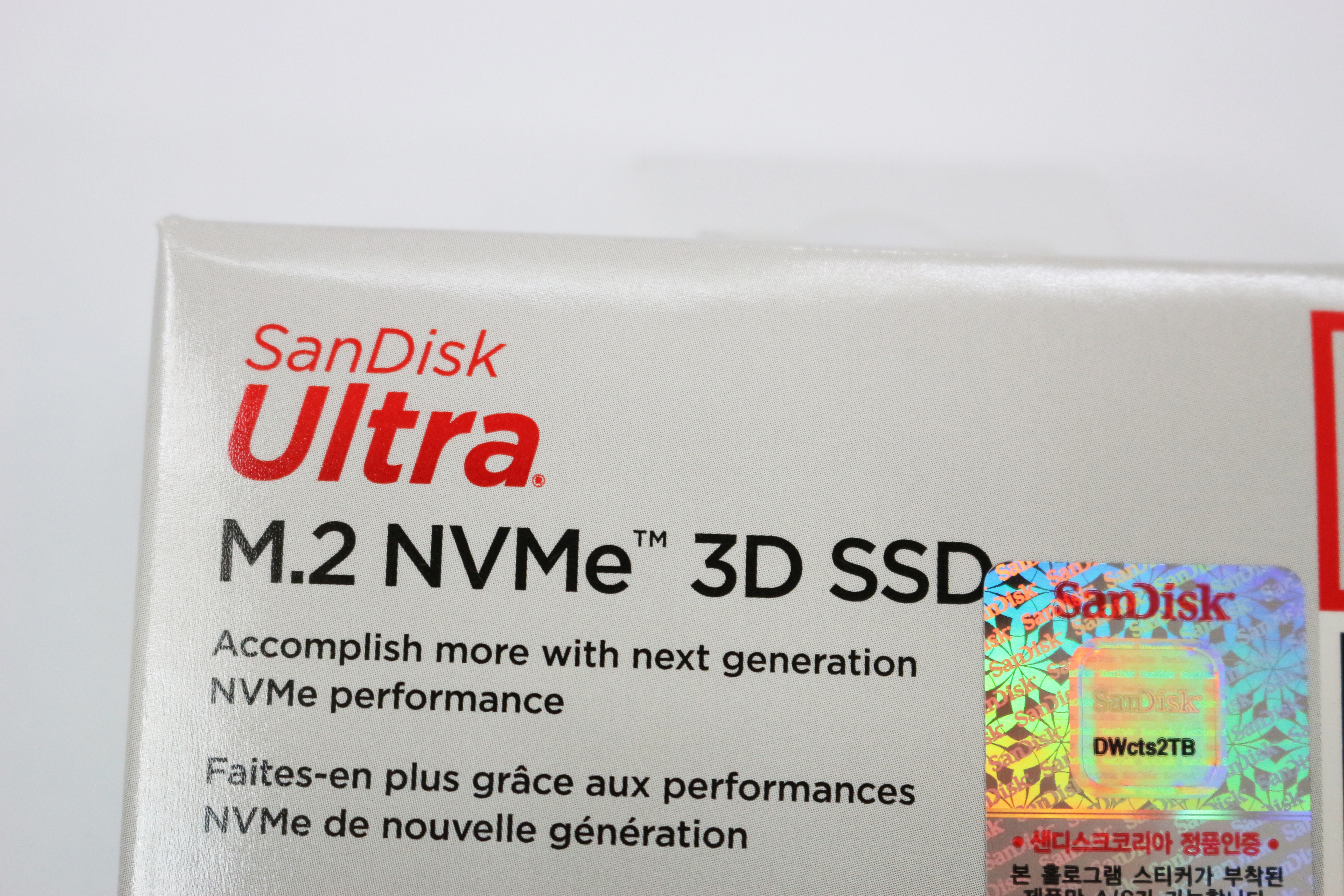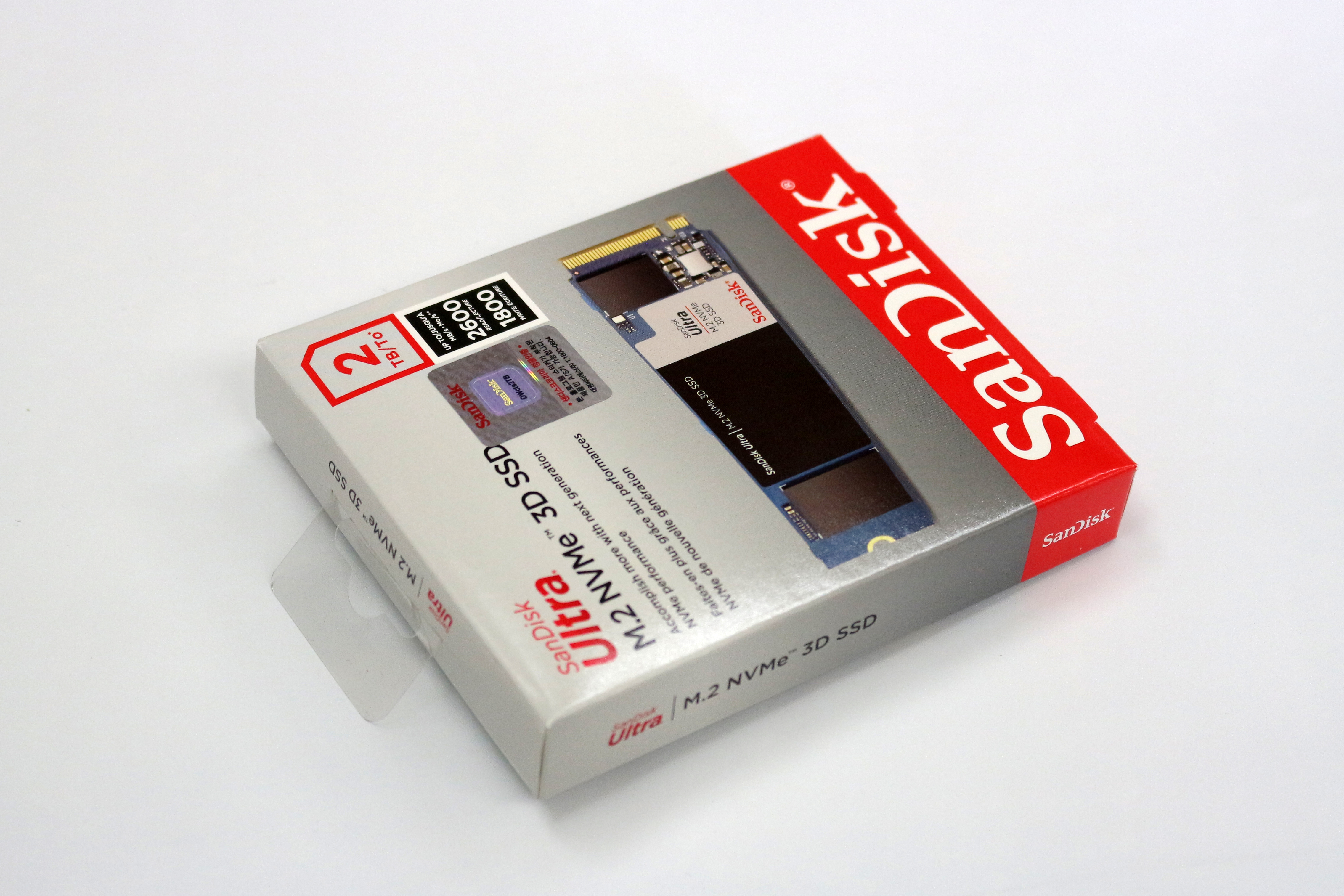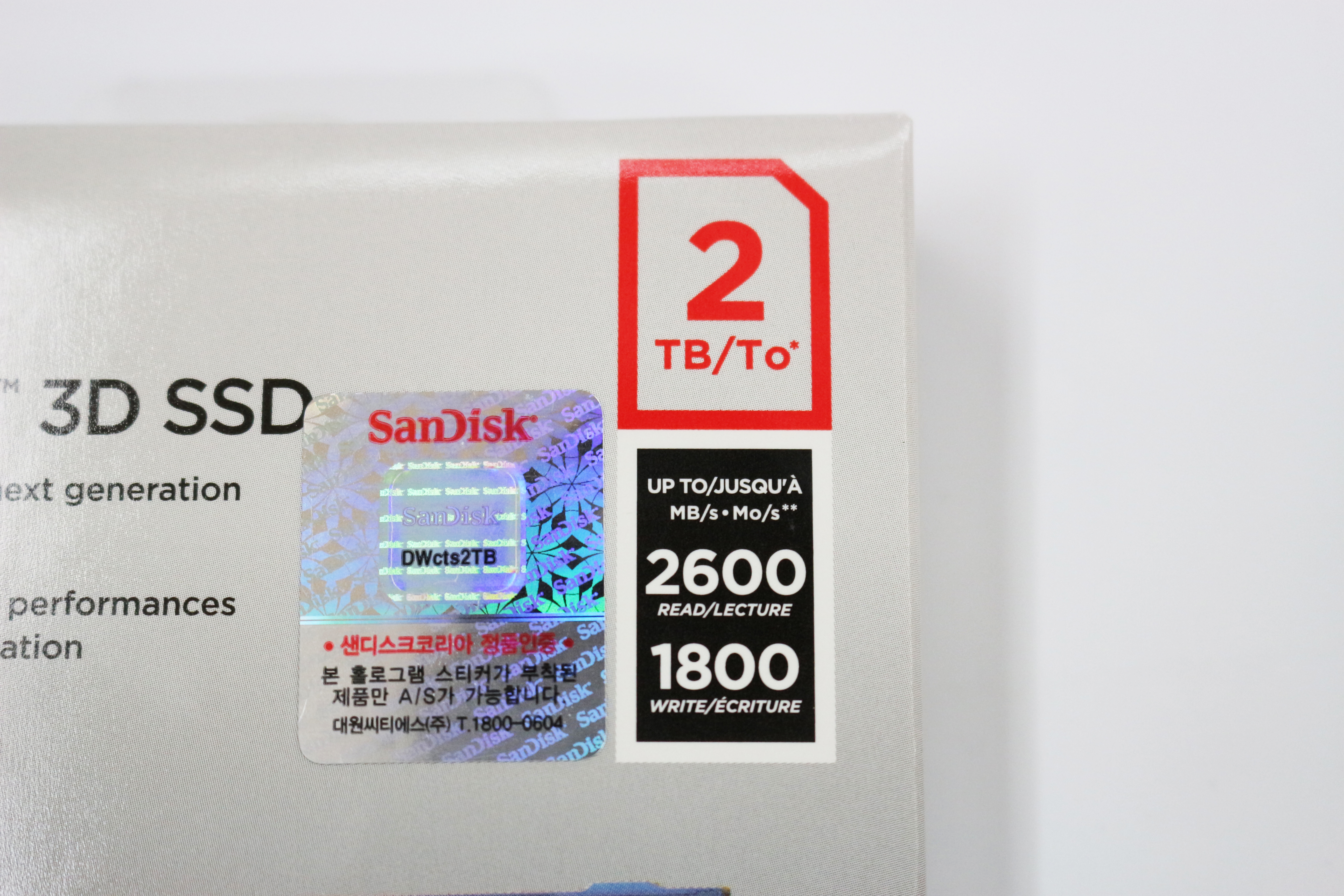 그 오른쪽에는 2TB라고 적혀있고, 바로아래에 이 제품의 속도가 표기되어있습니다. 최대 속도는 읽기 2600MB/s, 쓰기는 1800MB/s라고 적혀있네요. 다시 왼쪽에 샌디스크 정품이라는 스티커가 붙어있고, 대원CTS 제품 보증을 해줍니다.