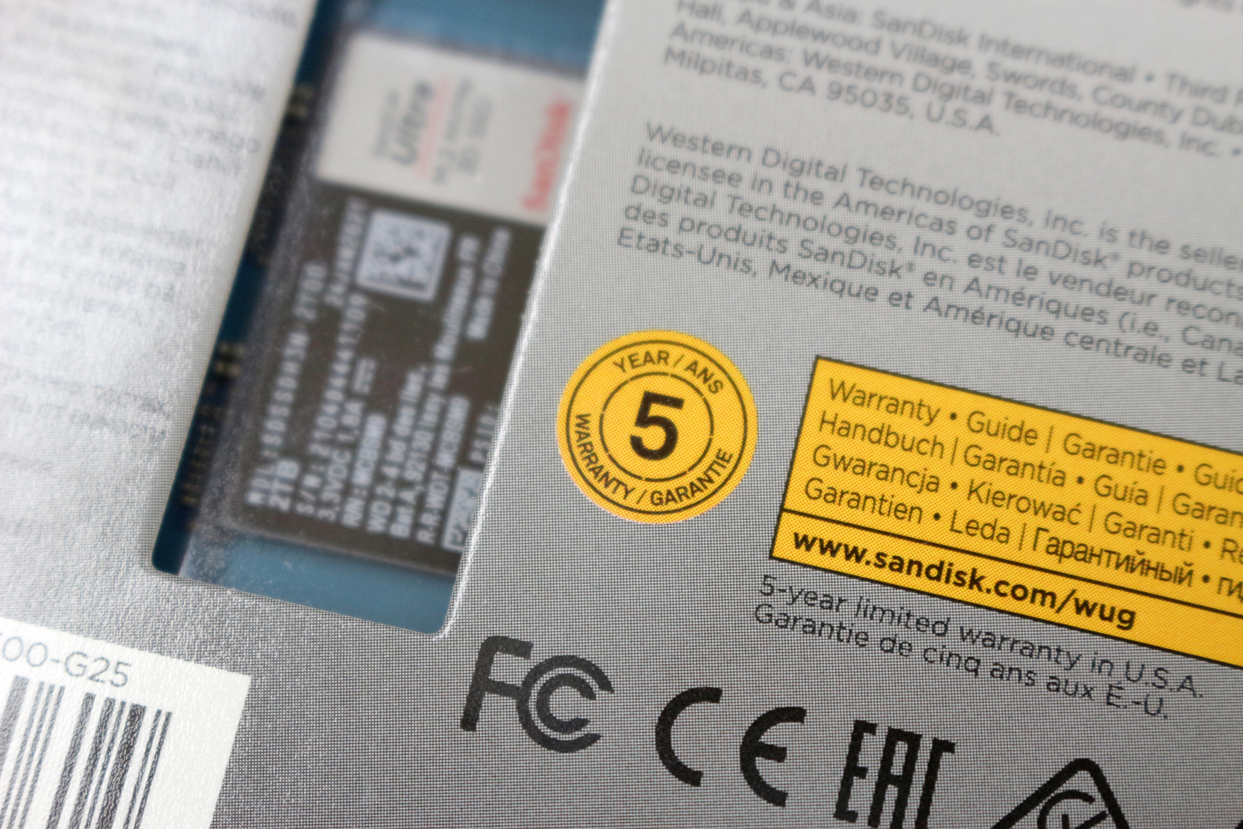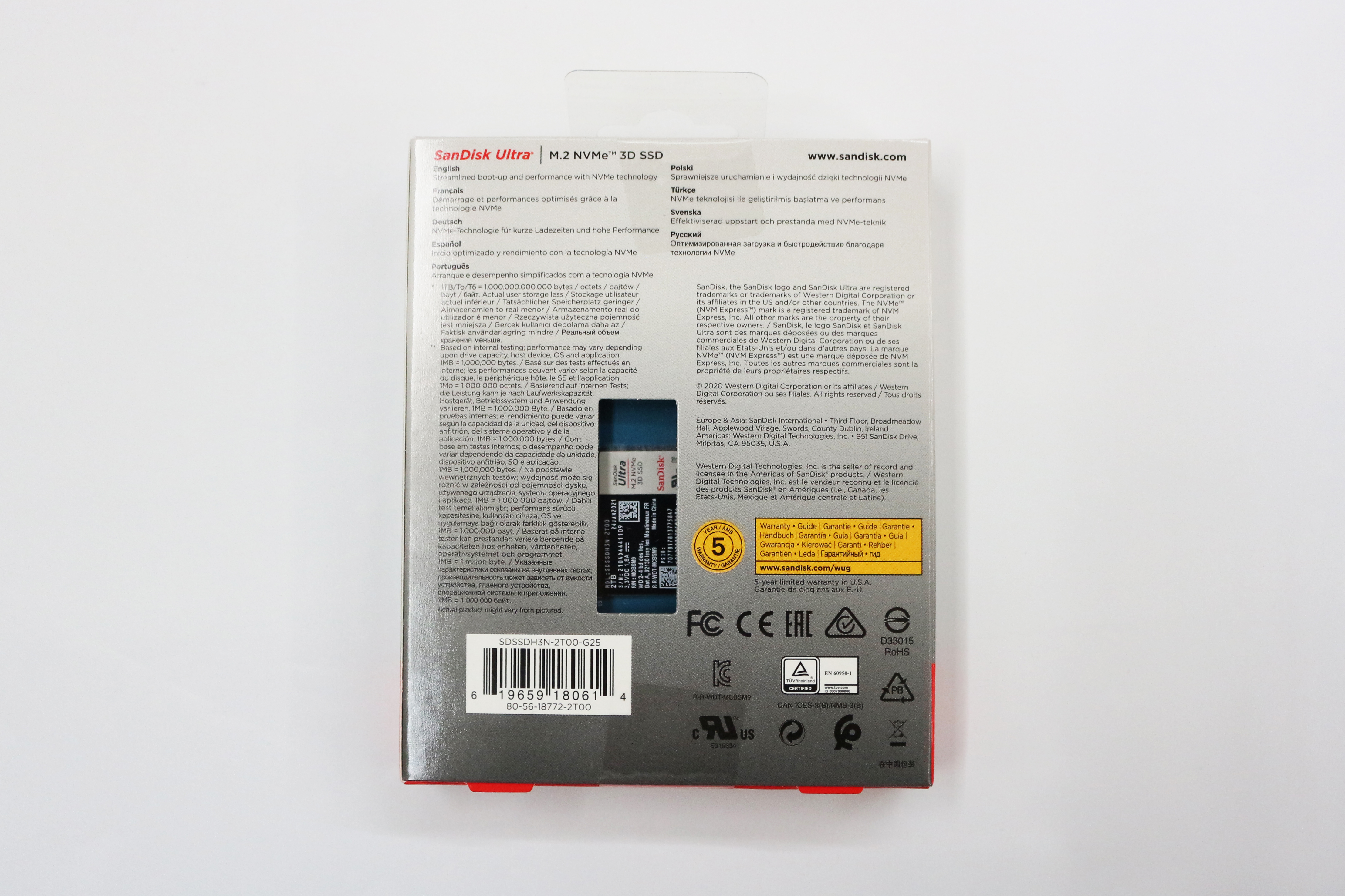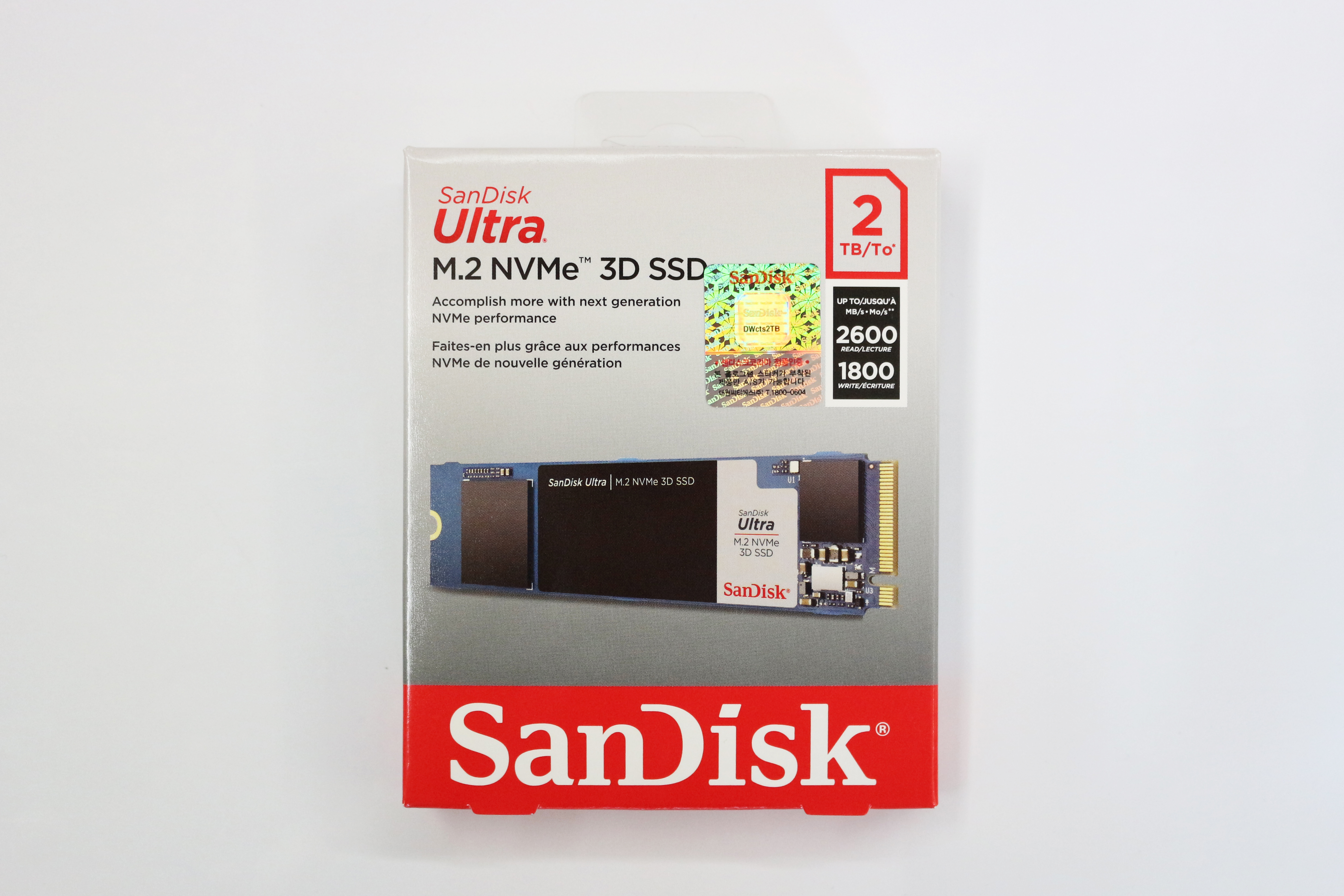 그 오른쪽에는 2TB라고 적혀있고, 바로아래에 이 제품의 속도가 표기되어있습니다. 최대 속도는 읽기 2600MB/s, 쓰기는 1800MB/s라고 적혀있네요. 다시 왼쪽에 샌디스크 정품이라는 스티커가 붙어있고, 대원CTS 제품 보증을 해줍니다.