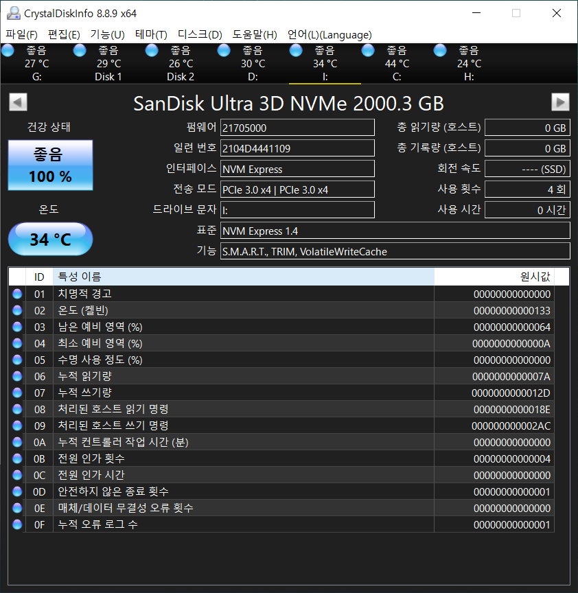 크리스탈 디스크 인포로 정보를 확인합니다. 하드를 떼기 전이라 디스크가 많네요.
