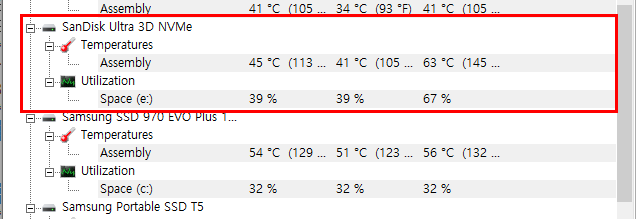 최대 63도로 심한 부하 직후인데도 낮은 온도를 보여주네요. 아래 970 EVO Plus는 별거 안하는데도 56도...