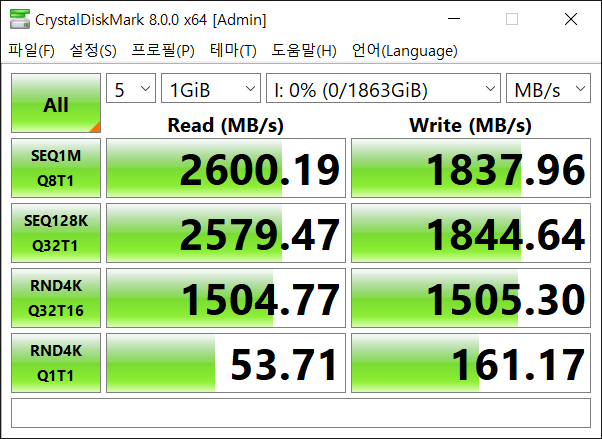 표기된 스펙처럼 최대 읽기 2600MB/s, 최대 쓰기는 표기스펙보다 조금 더 높은 1838MB/s이 나왔네요. 최대 속도는 만족스럽군요.
