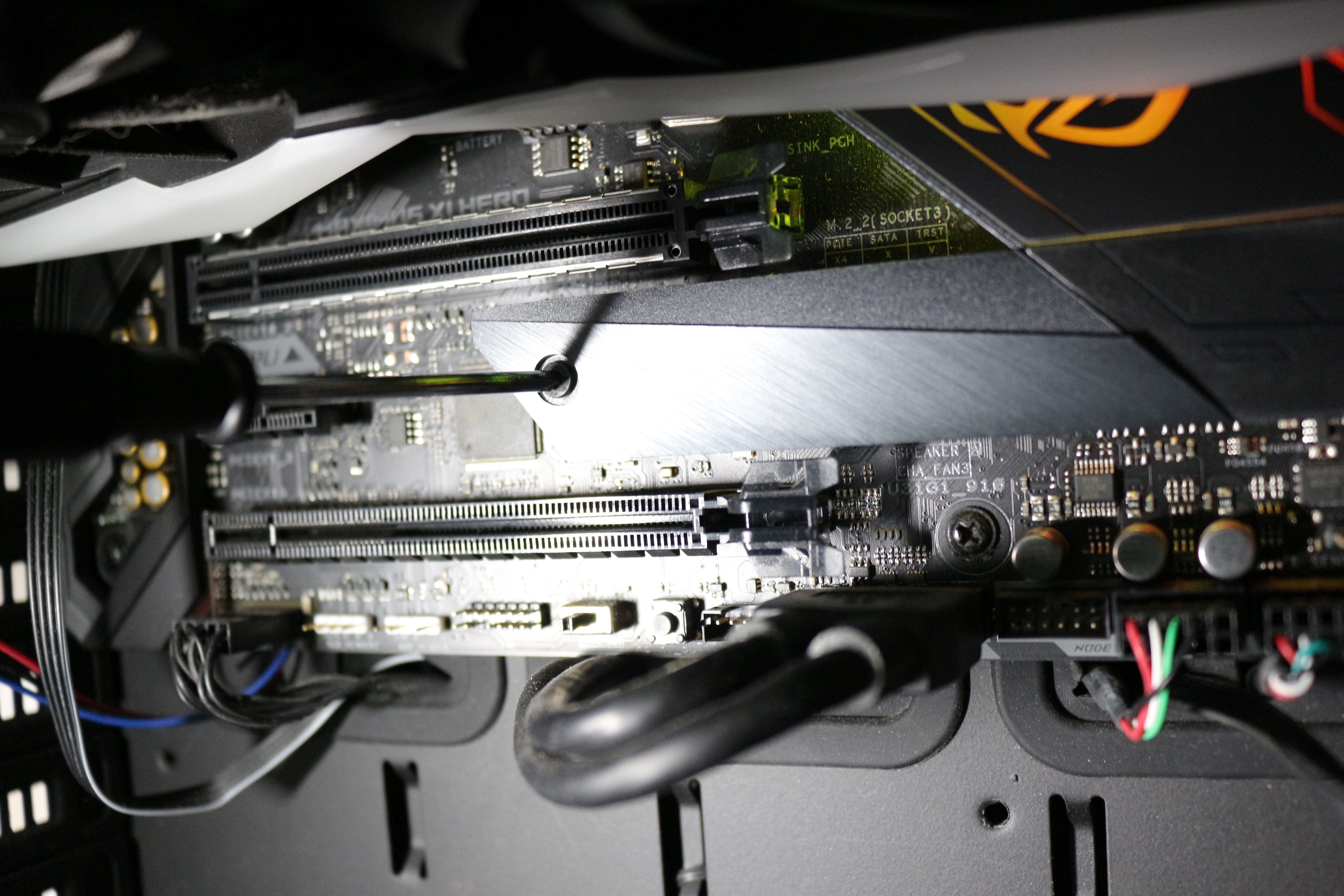 첫번째 M.2 슬롯에는 삼성전자 970 EVO Plus 1TB가 들어있기에 아래쪽 M.2 슬롯에 장착했습니다. 메인보드는 ASUS MAXIMUS XI HERO입니다. 너무 귀찮아서 그래픽카드를 빼지 않고 장착했기 때문에 사진이 갑갑해 보이는점 양해 바랍니다.