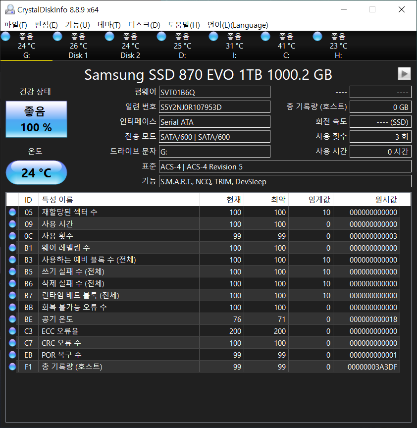 크리스탈 디스크 인포로 870 EVO의 정보를 확인!