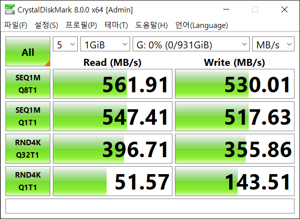 크리스탈 디스크 마크로 간단하게 속도 측정을 해보았습니다. 스펙대로 읽기는 562MB/s, 쓰기는 530MB/s 정도 나오네요.