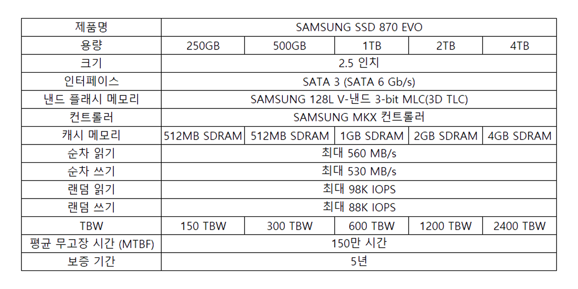최근에는 더 빠른 NVMe 방식을 사용하는 추세이지만, NVMe 제품을 장착할 수 있는 M.2 슬롯이 많지 않아 아직까지는 2.5인치 SATA 방식이 더 대중화되어 있습니다. 저도 NVMe를 더 장착하고 싶었는데, M.2 슬롯이 부족해서 2.5인치 SATA 제품을 구매할 수 밖에 없었는데요, 이런 SATA 방식 중 가장 정점에 있는 제품이 바로 이번에 리뷰할 삼성전자 870 EVO입니다.