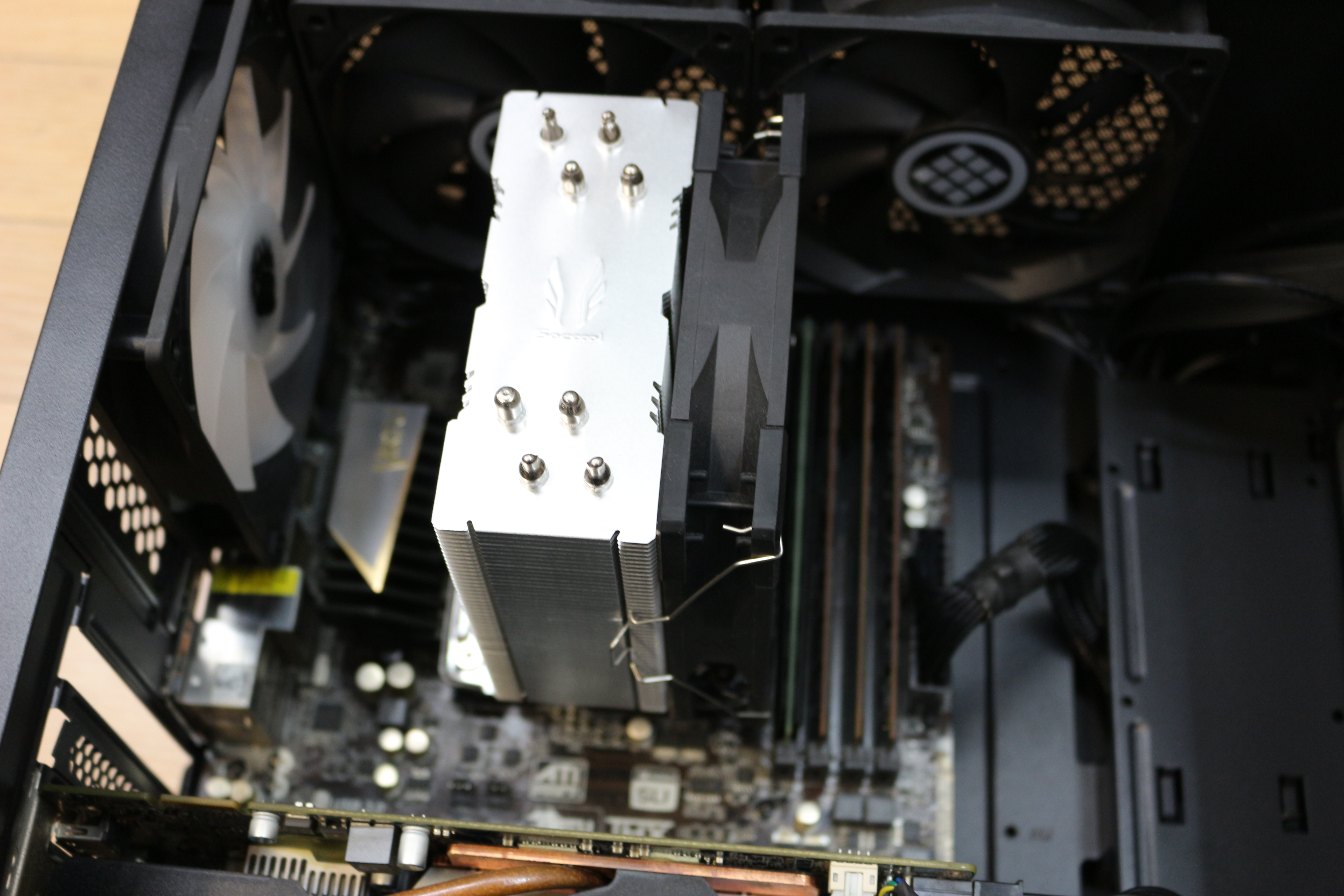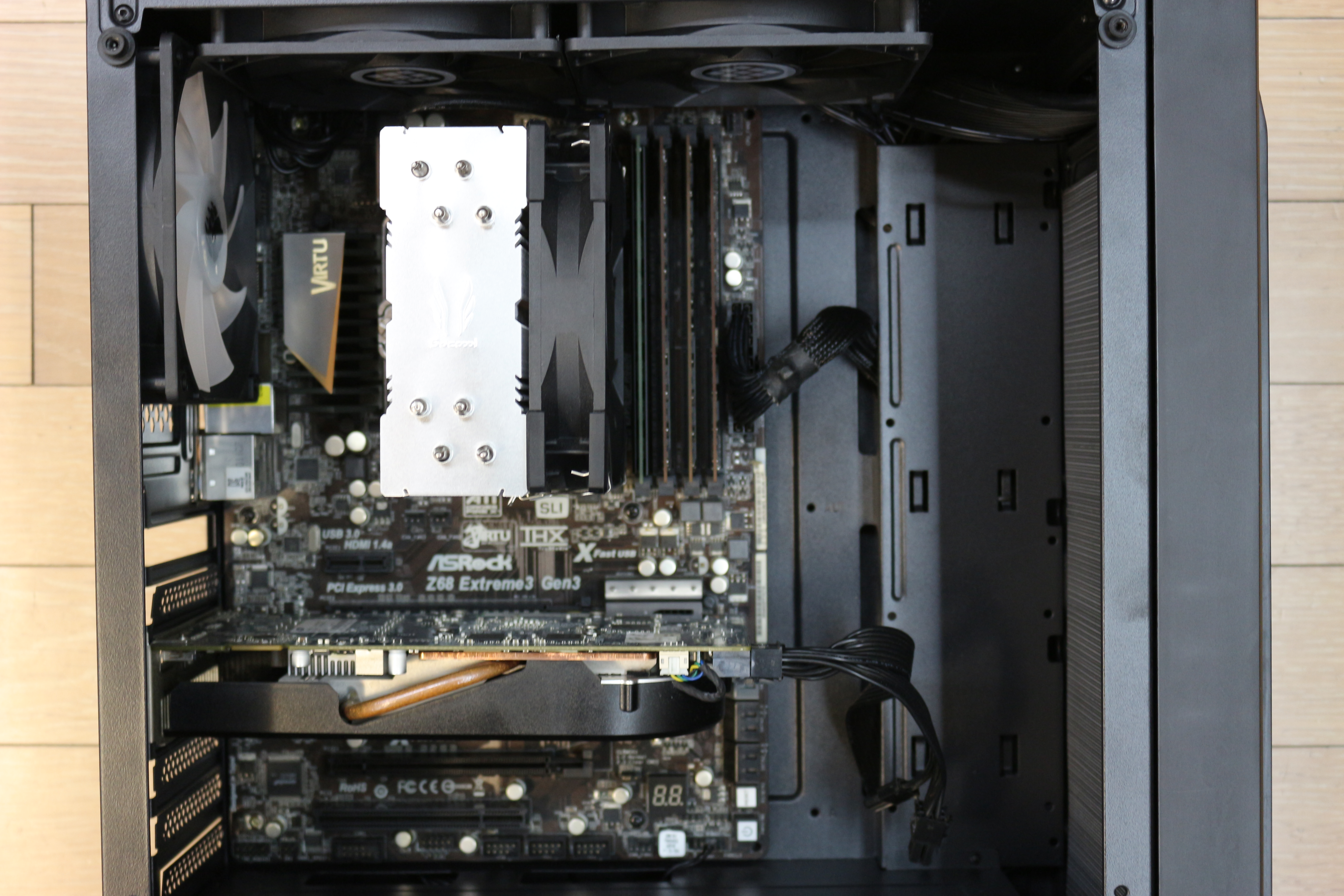 ATX 메인보드는 사진처럼 간신히 들어갑니다. 실제 조립할 때는 살짝 비스듬히 넣어야 들어가는데, 조금만 틀어져도 안들어가거나 팬 혹은 하단을 보드가 긁으면서 들어갑니다. 반대로 탈거는 훨씬 어려운데, CPU 보조전원을 빼는것부터 큰 일입니다. 리뷰 준비하면서 두번을 탈착을 했는데, 처음 탈거하는데 15분정도 씨름을 한듯 하네요.