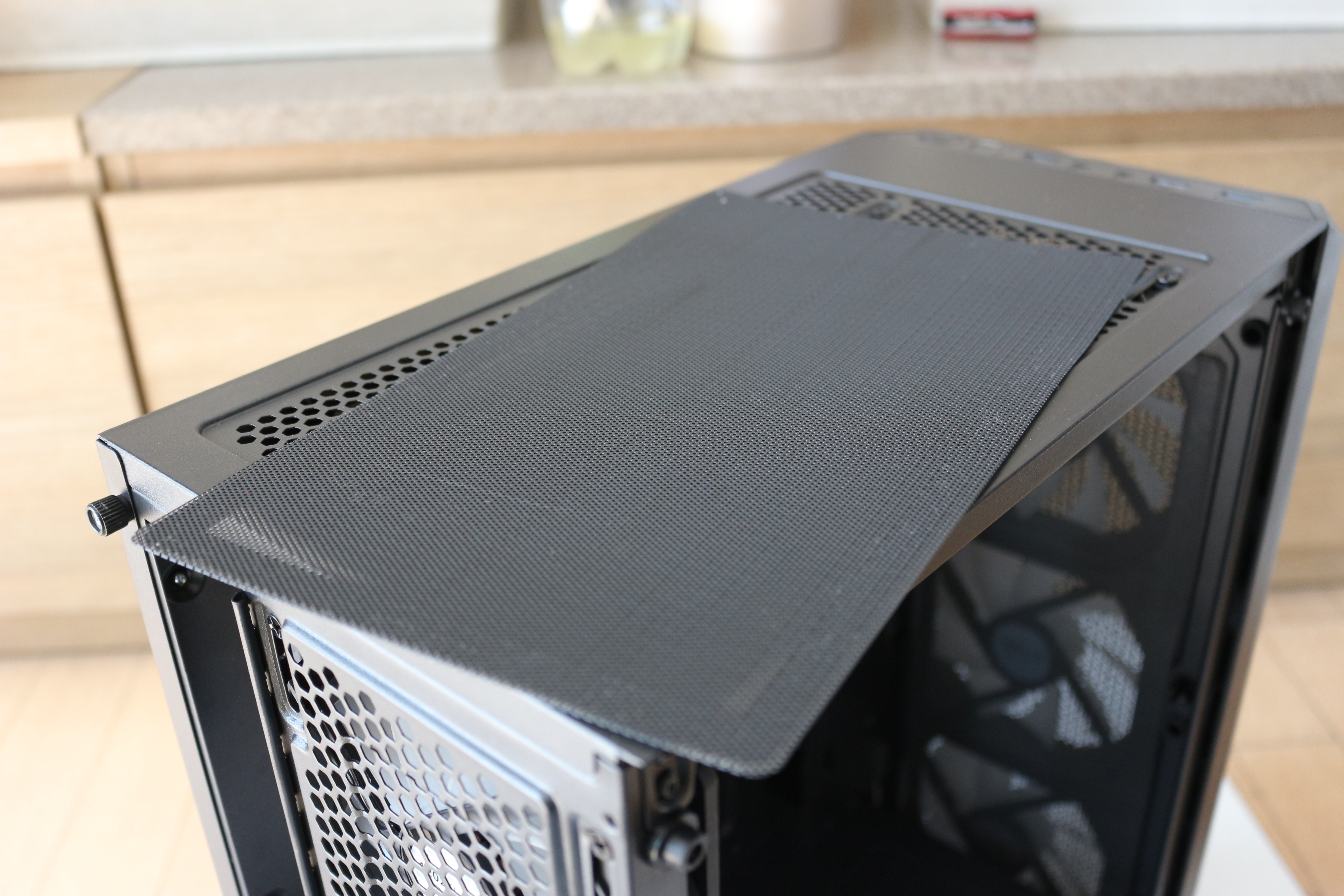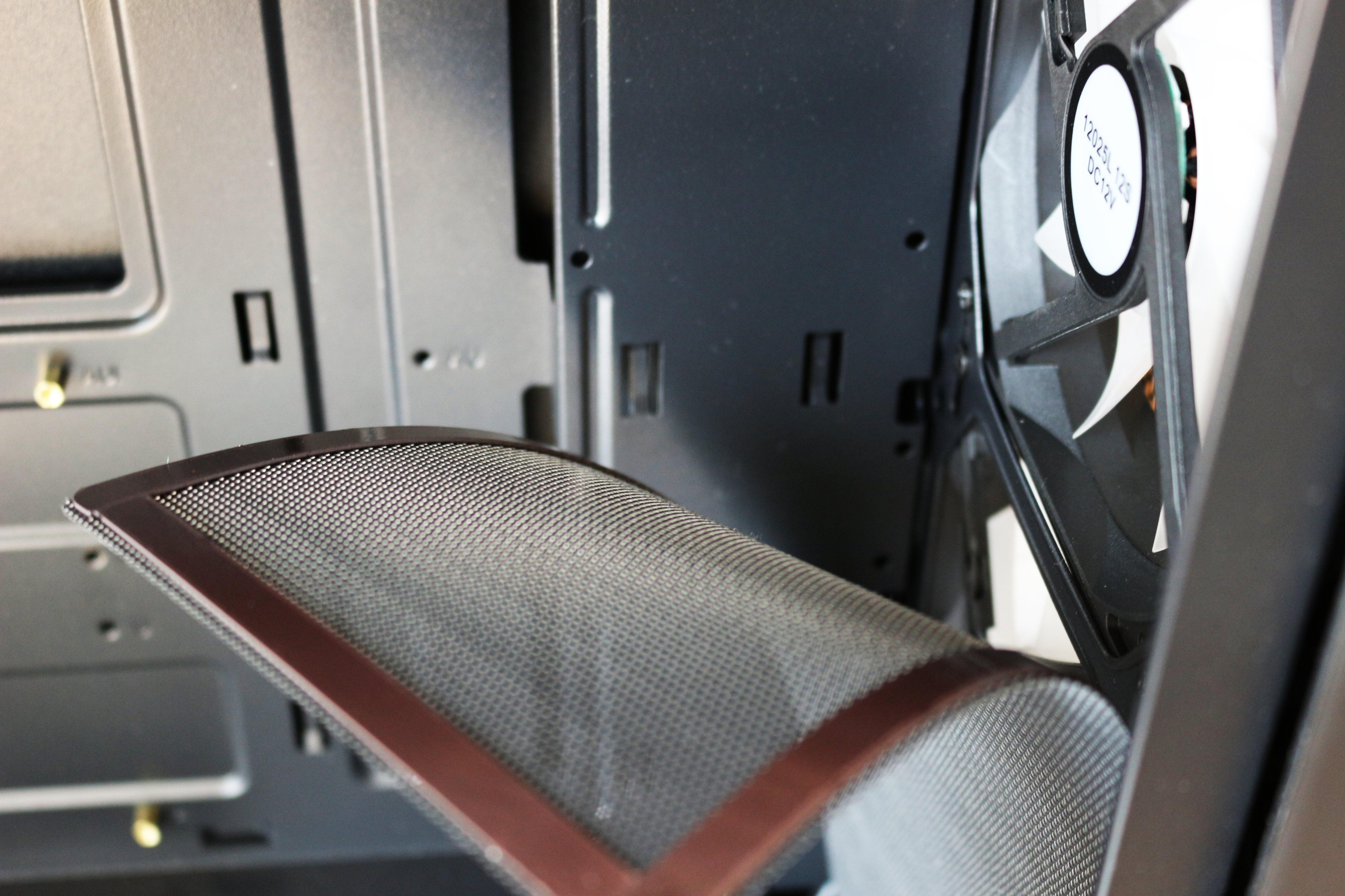 전면 패널은 탈착이 가능하며 3개의 120mm 쿨링팬이 있는 것을 확인할 수 있습니다. 또한 내부에 자석으로 탈착 가능한 먼지필터를 하나 더 넣어 먼지 유입을 최소한으로 만들었습니다. 가성비 제품이지만 이런 것들을 세세하게 신경쓴 점은 맘에 드네요.