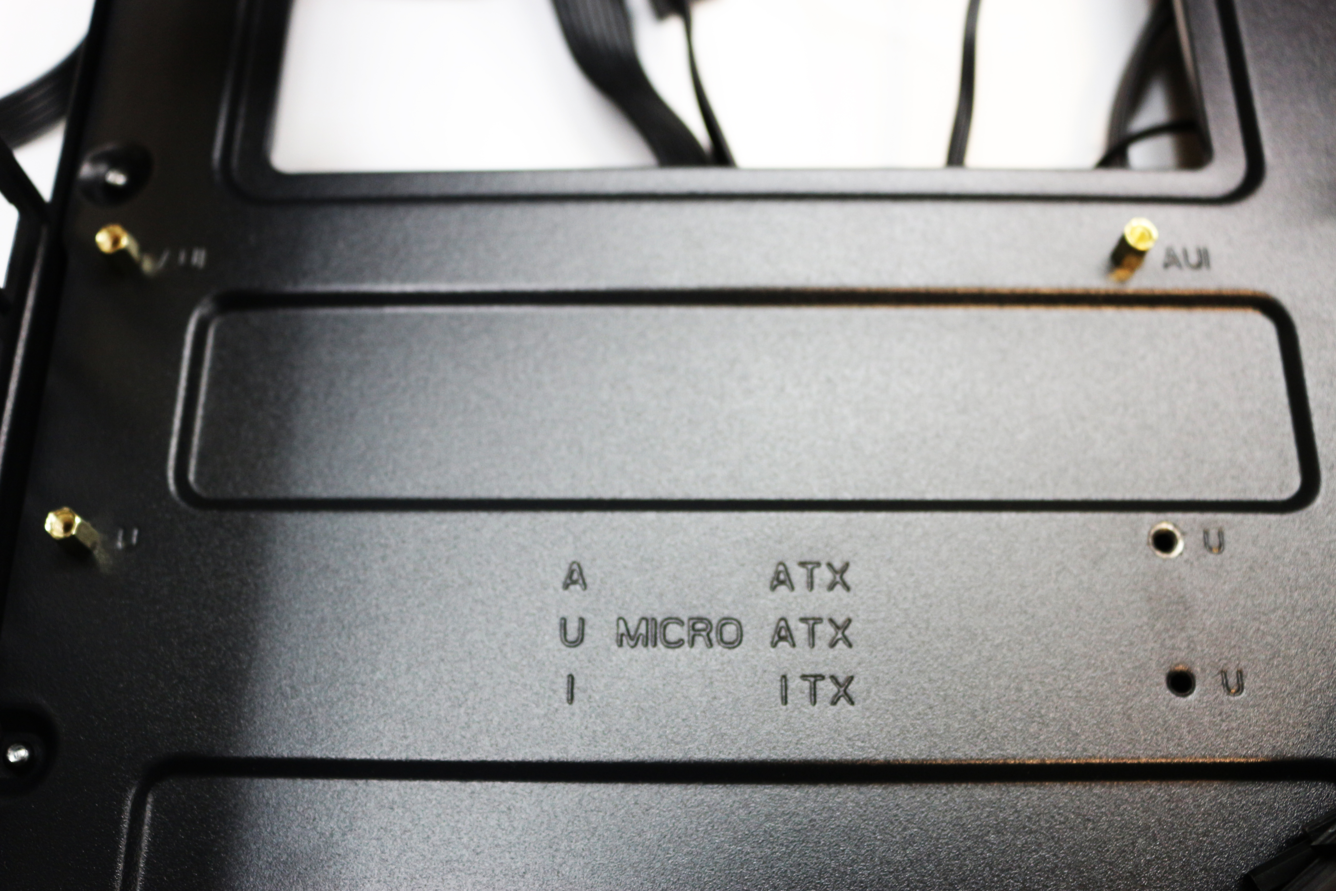 선을 정리하기 전인데요, 케이스 내부에 ATX, M-ATX, ITX를 위한 스탠드오프 자리가 A, U, I라는 이니셜로 각 구멍에 표시되어있습니다. 굉장히 인상적인 부분입니다. 스탠드오프 구멍을 메인보드와 대조해가며 찾아야하는 수고를 덜어주는 친절한 케이스인듯 하네요.