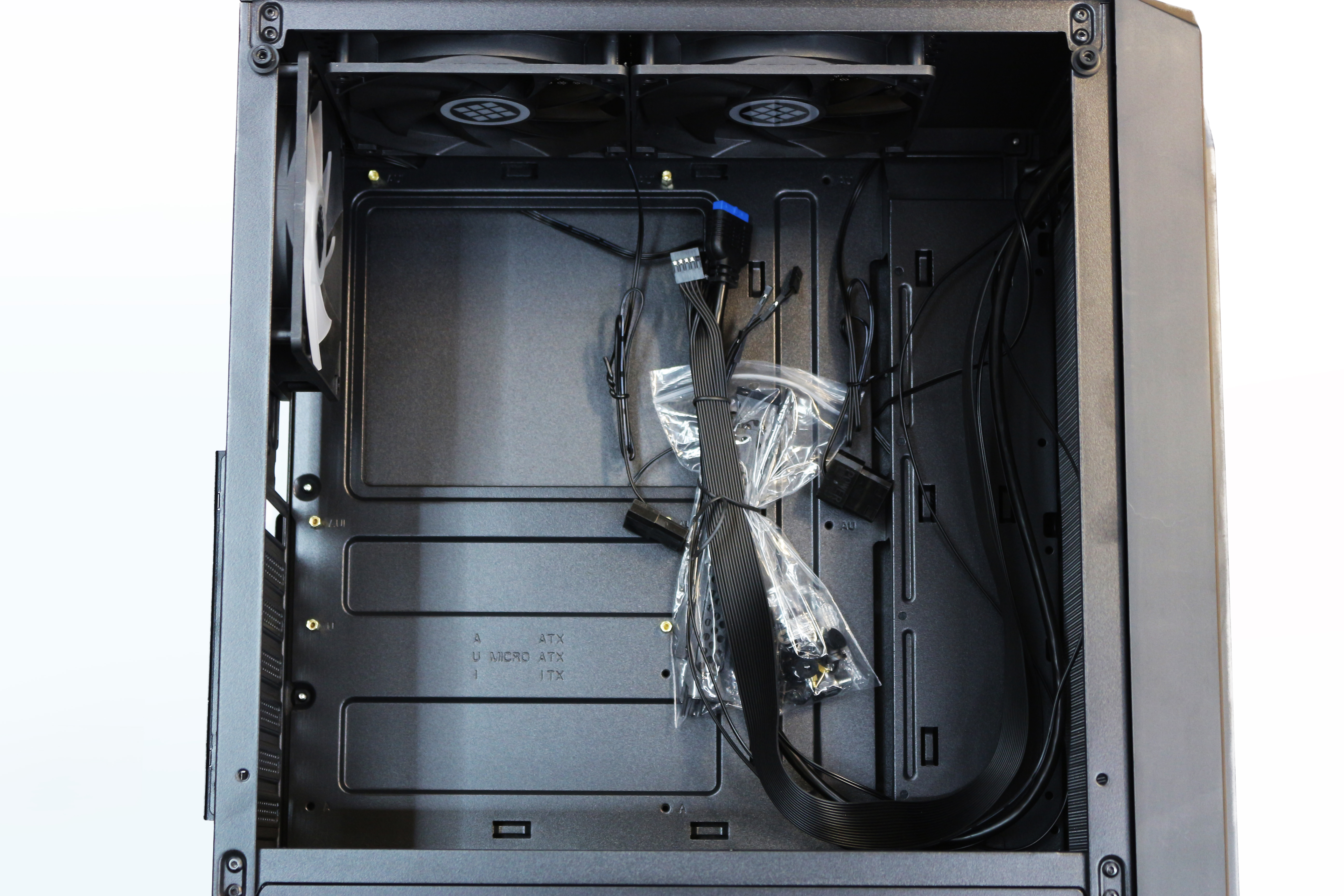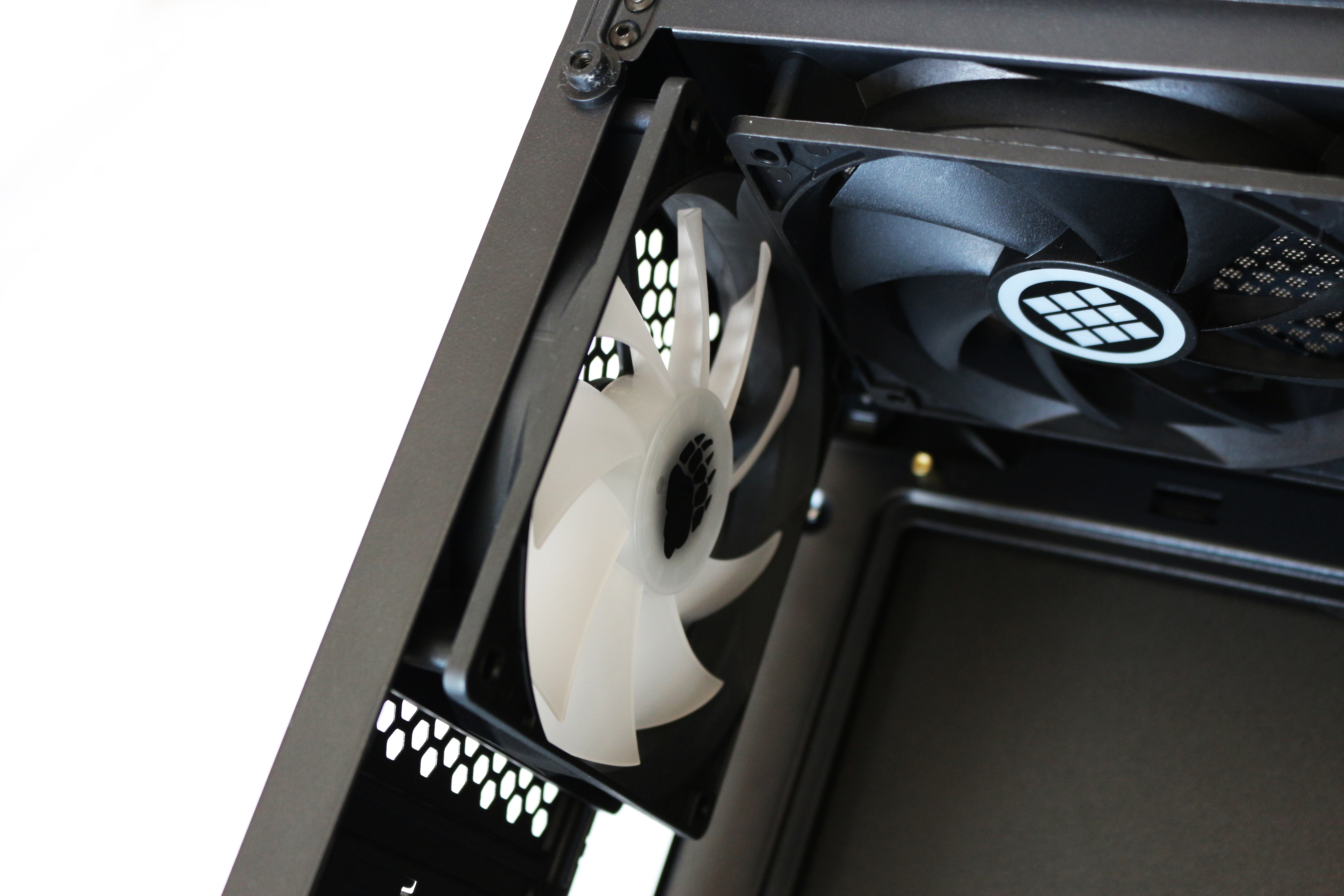 상단에는 두 개의 120mm 팬이 잘착되어 있고, 후면에는 120mm RGB LED 팬이 장착되어 있습니다.