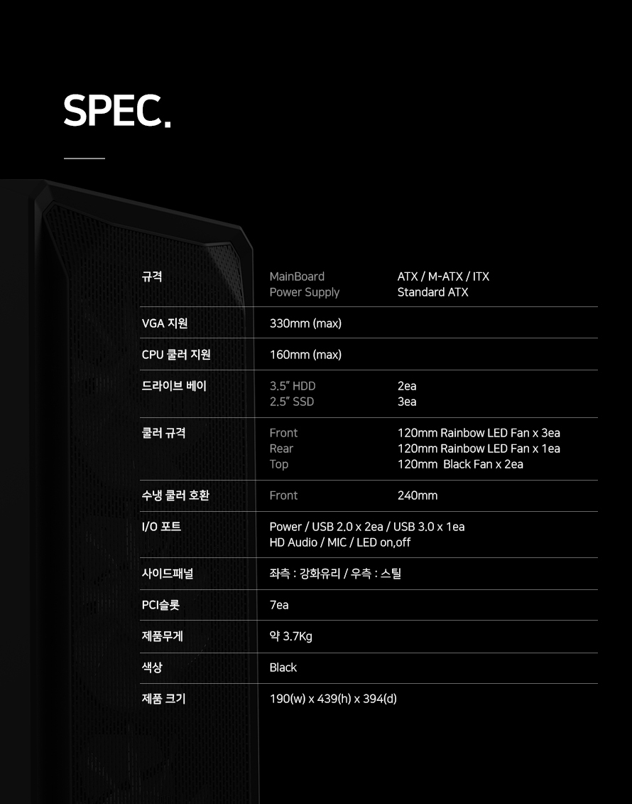 ATX부터 ITX까지 메인보드 규격에 대해서 폭넓은 지원을 하고있습니다. VGA의 길이는 최대 330mm로 3팬 그래픽카드들도 들어가는 크기입니다. CPU쿨러는 아쉽게도 160mm까지만 지원합니다. 공랭 끝판왕급 제품들은 165mm정도까지 하기에 5mm만 더 늘렸으면 좋았지 않았을까 하는 아쉬움이 남네요. 수냉쿨러는 전면에 240 사이즈만 장착이 가능합니다. HDD는 총 두개 SSD는 3개까지 장착이 가능하며, 제품의 무게는 3.7Kg으로 상당히 가벼운 편입니다. 제품 크기도 190 x 439 x 394로 미들타워치고는 상당히 작습니다.