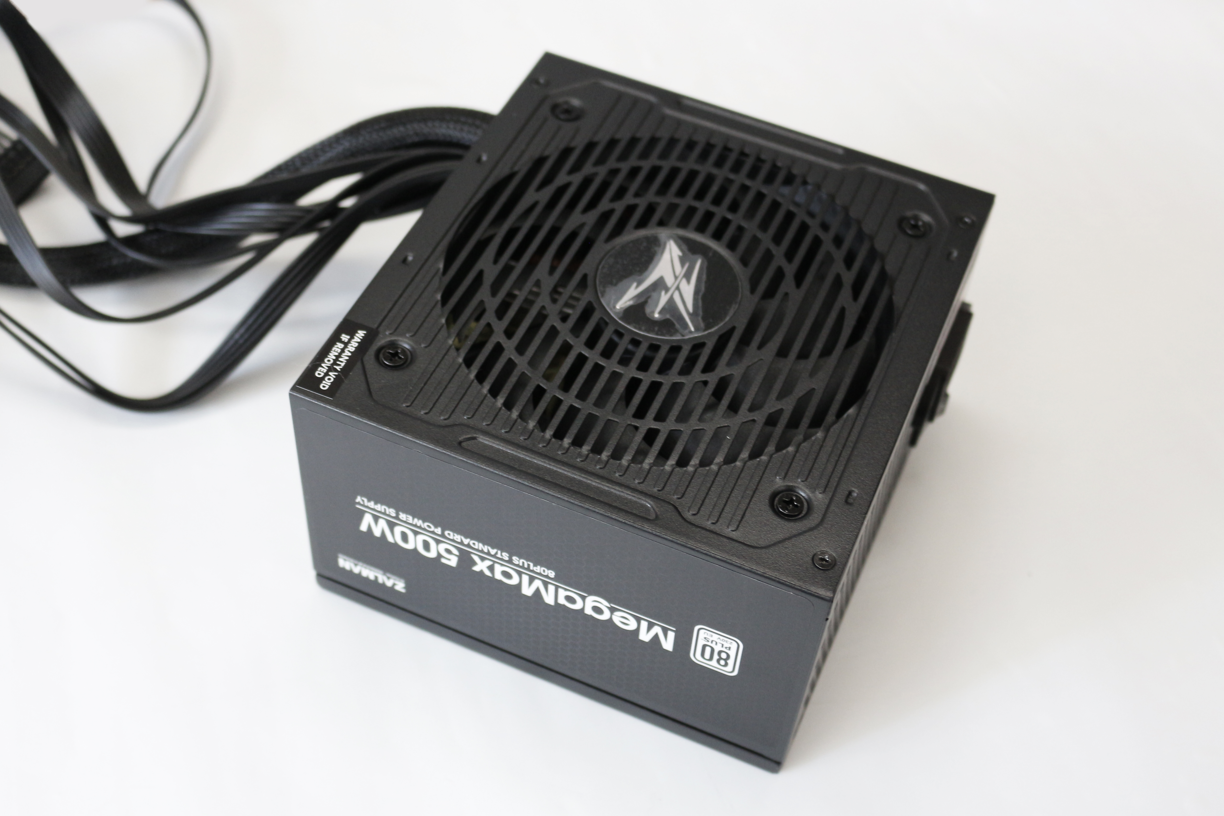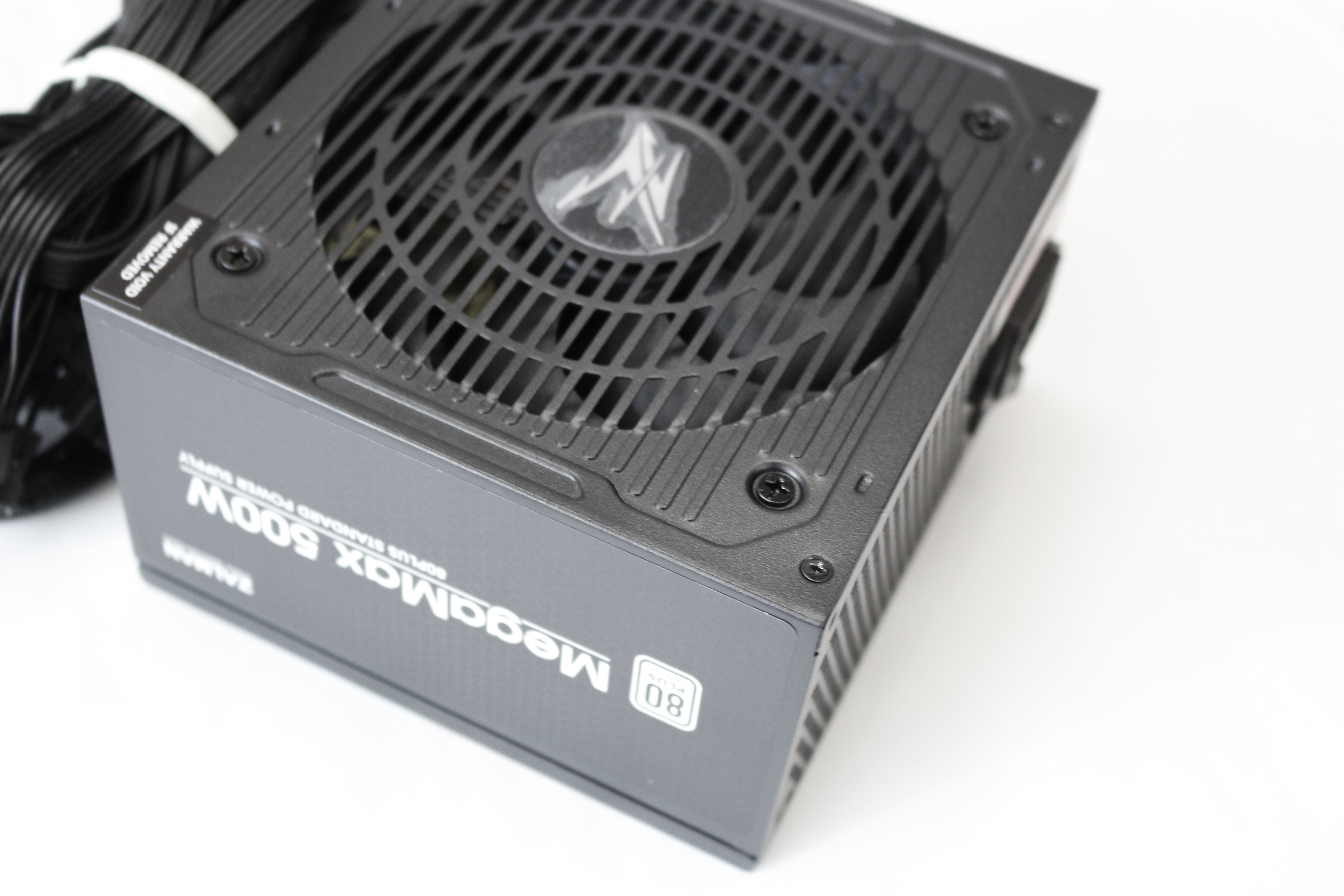 잘만 MegaMax 500W에서 가장 마음에 드는 점은 정말 군더더기 없는 외관입니다. 옆면은 검정 바탕과 MegaMax 500W라고 쓰여진 하얀 글씨, 하얀색 80PLUS 인증 마크로 지저분하지 않은 깔끔한 외관이고, 실제 케이스에 장착했을 때 정방향으로 보이도록 만든 것 또한 파워만을 본게 아닌 시스템 전체를 생각했다는 점에서 좋은 점수를 주고 싶습니다. 에어홀은 파워 본체와 일체형으로 보급형 제품이라 하기엔 아까울 정도로 디자인에 신경을 많이 쓴 느낌입니다. 추가로 중앙의 메탈 로고는 고급스럽고 세련된 느낌을 더해주네요.