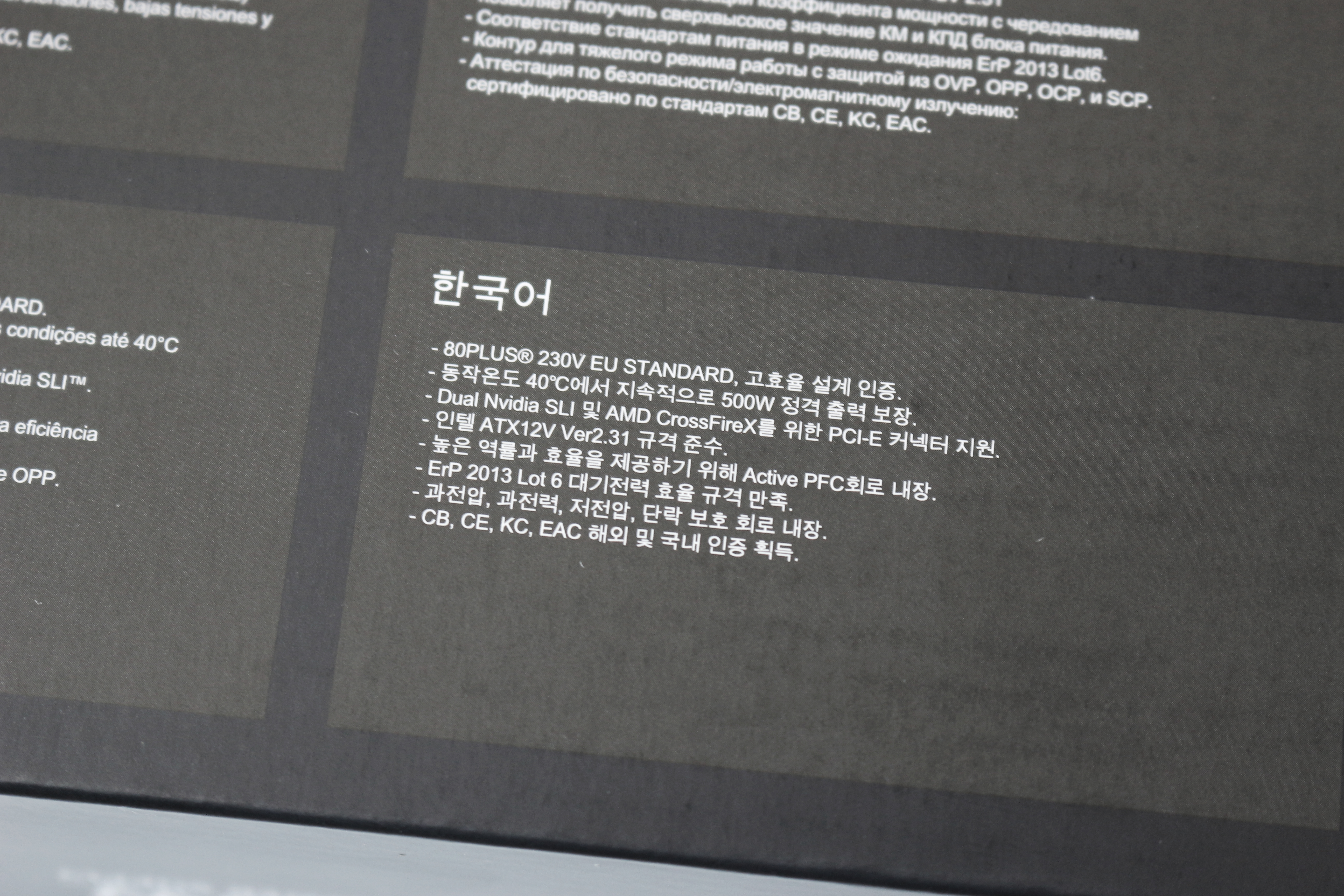 박스 하단에는 각 국가의 언어로 제품의 특징을 적어놨는데요, 국내 기업인 만큼 아래에 제품의 특징이 한국어로 적혀있습니다.