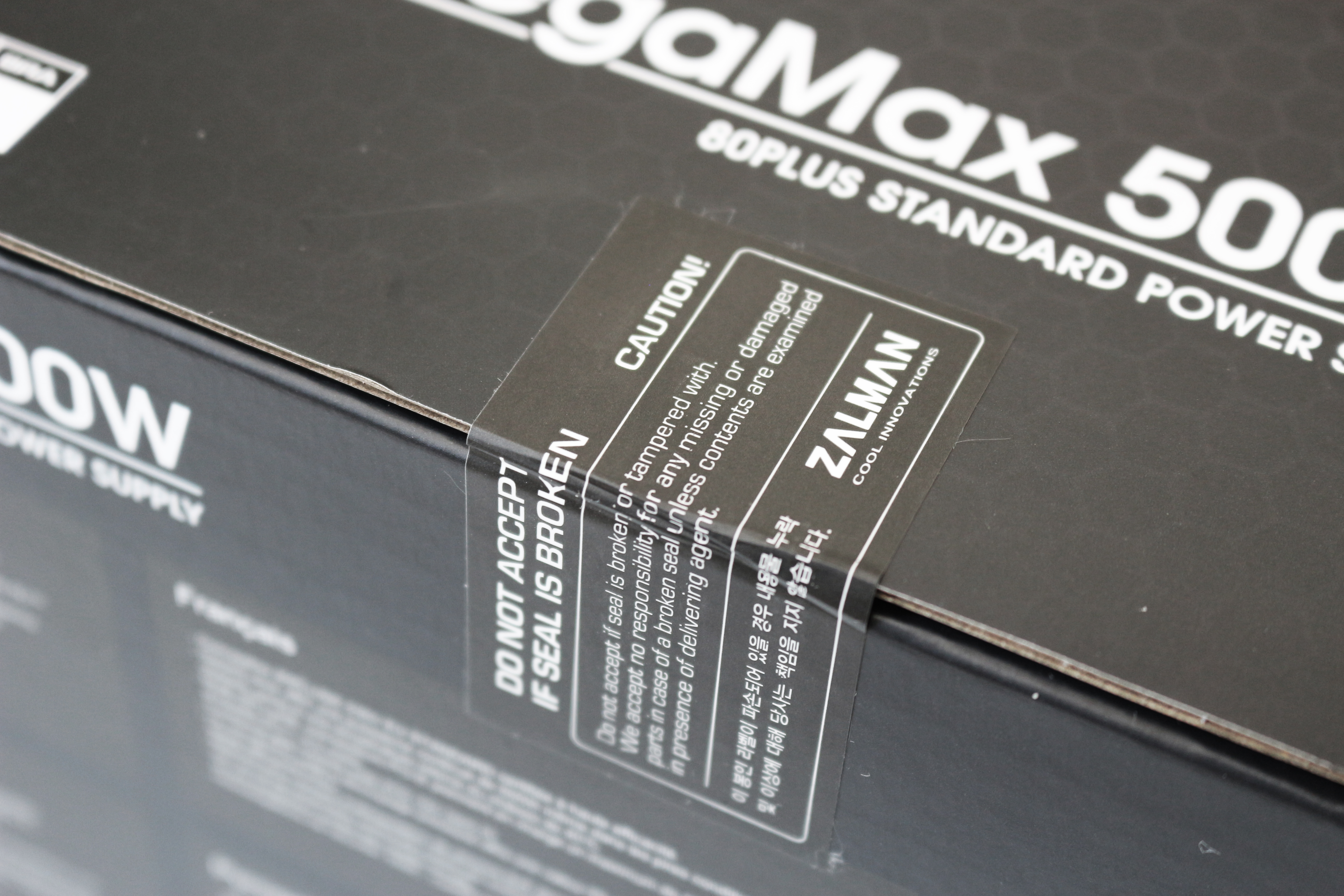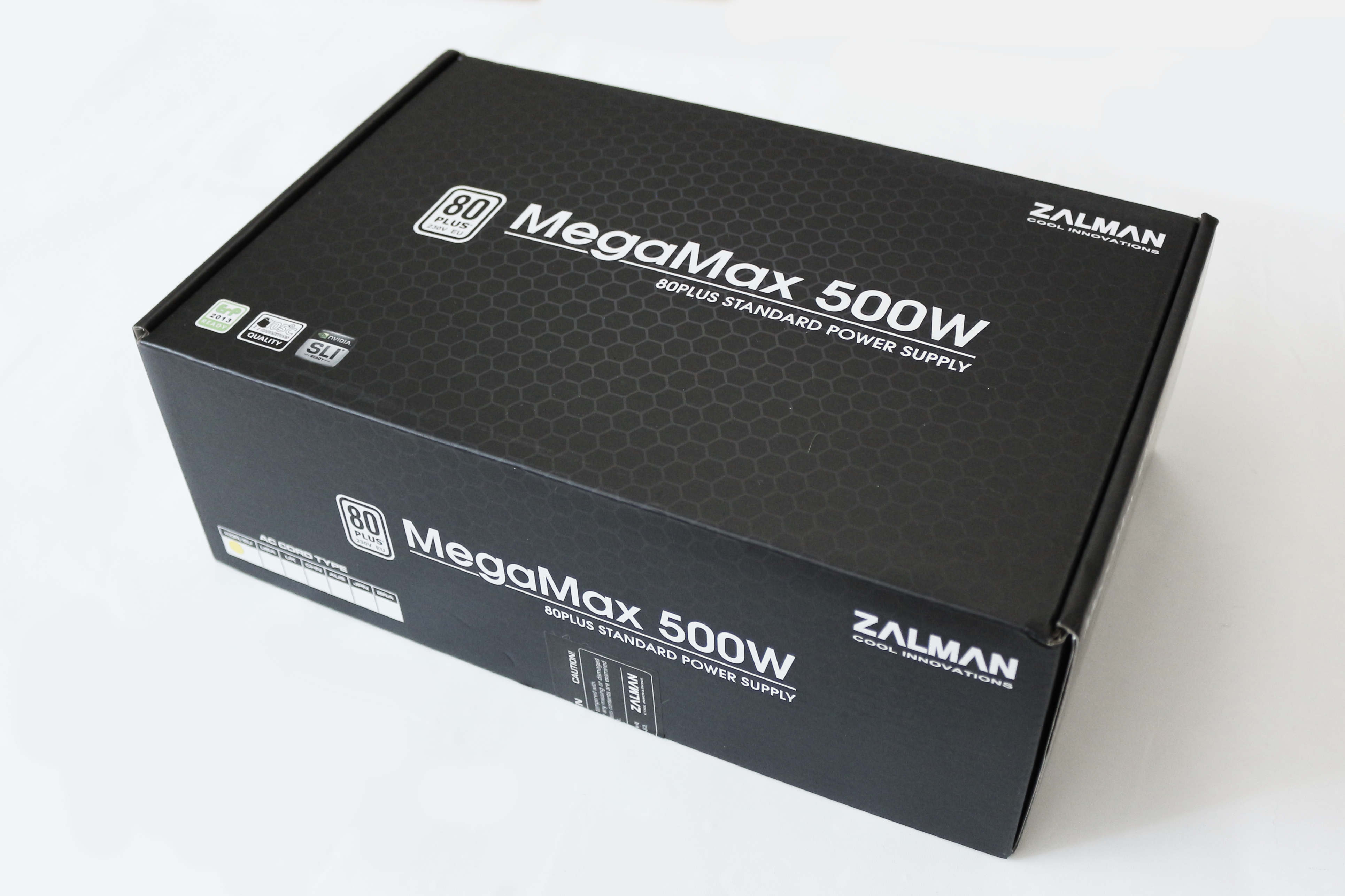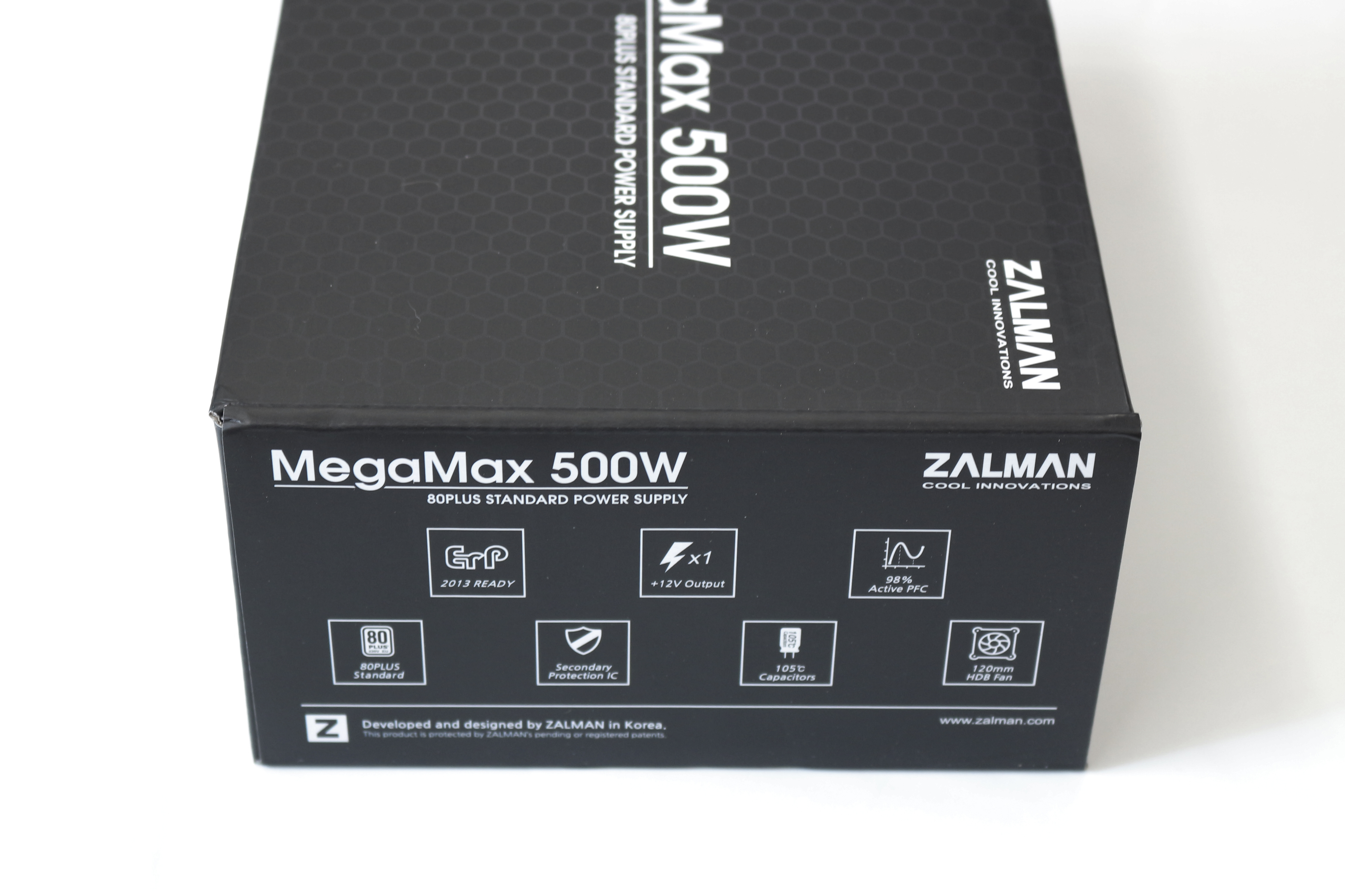 박스 상단과 전면에는 ZALMAN과 제품명인 MegaMax 500W가 쓰여져있고, 제품명 앞에는 80PLUS 인증을 받은 제품을 강조하듯 80PLUS 인증 마크가 그려져 있습니다.