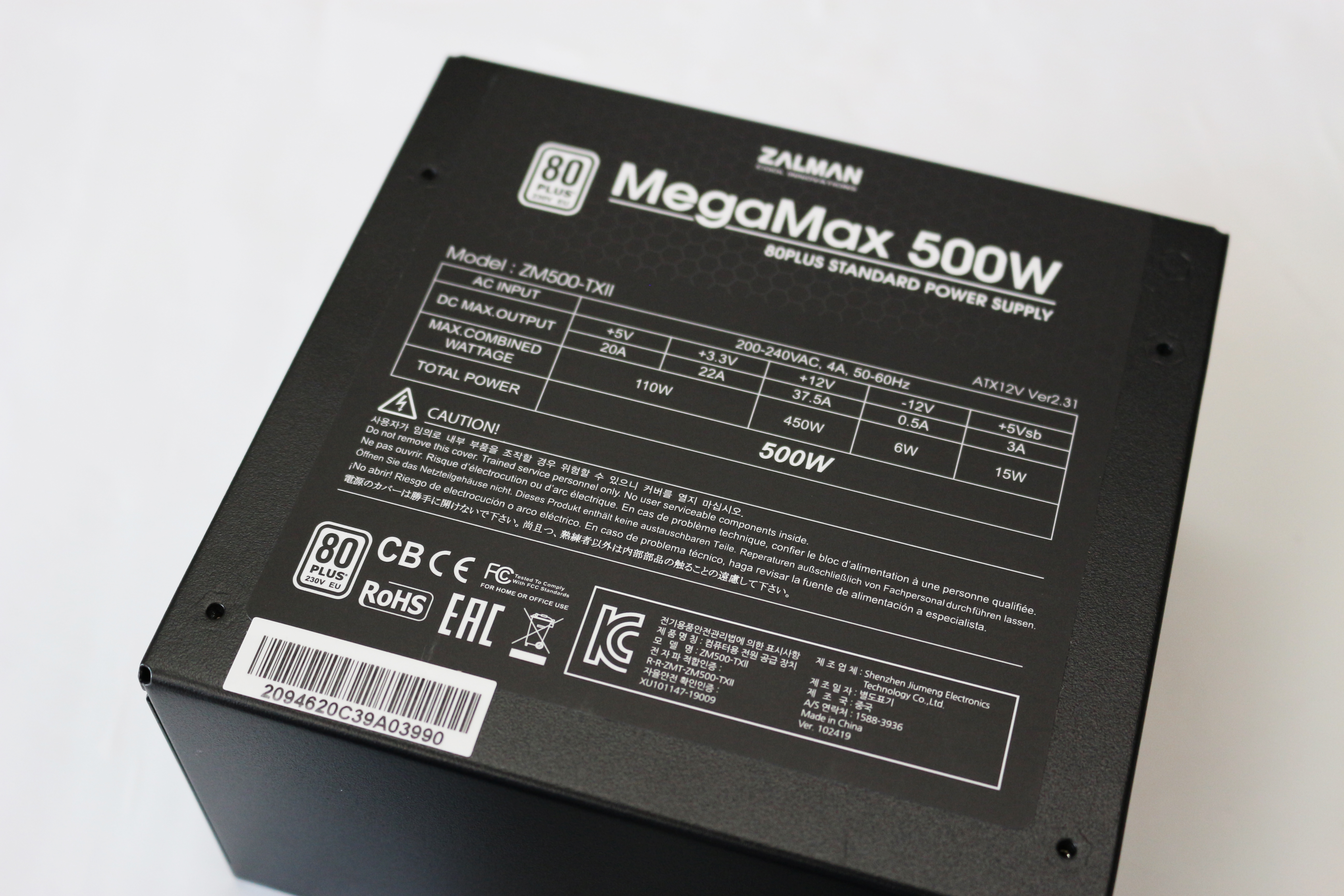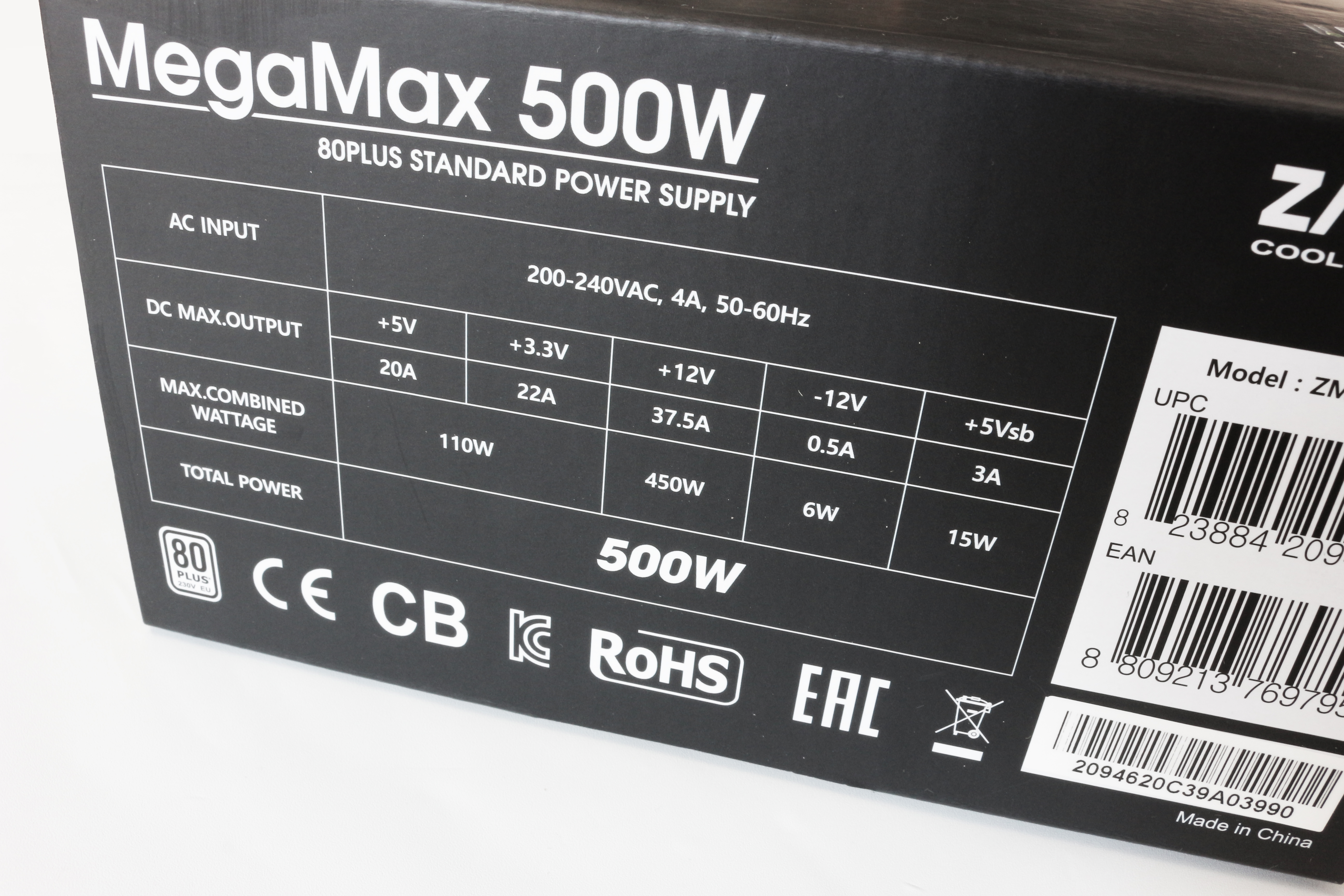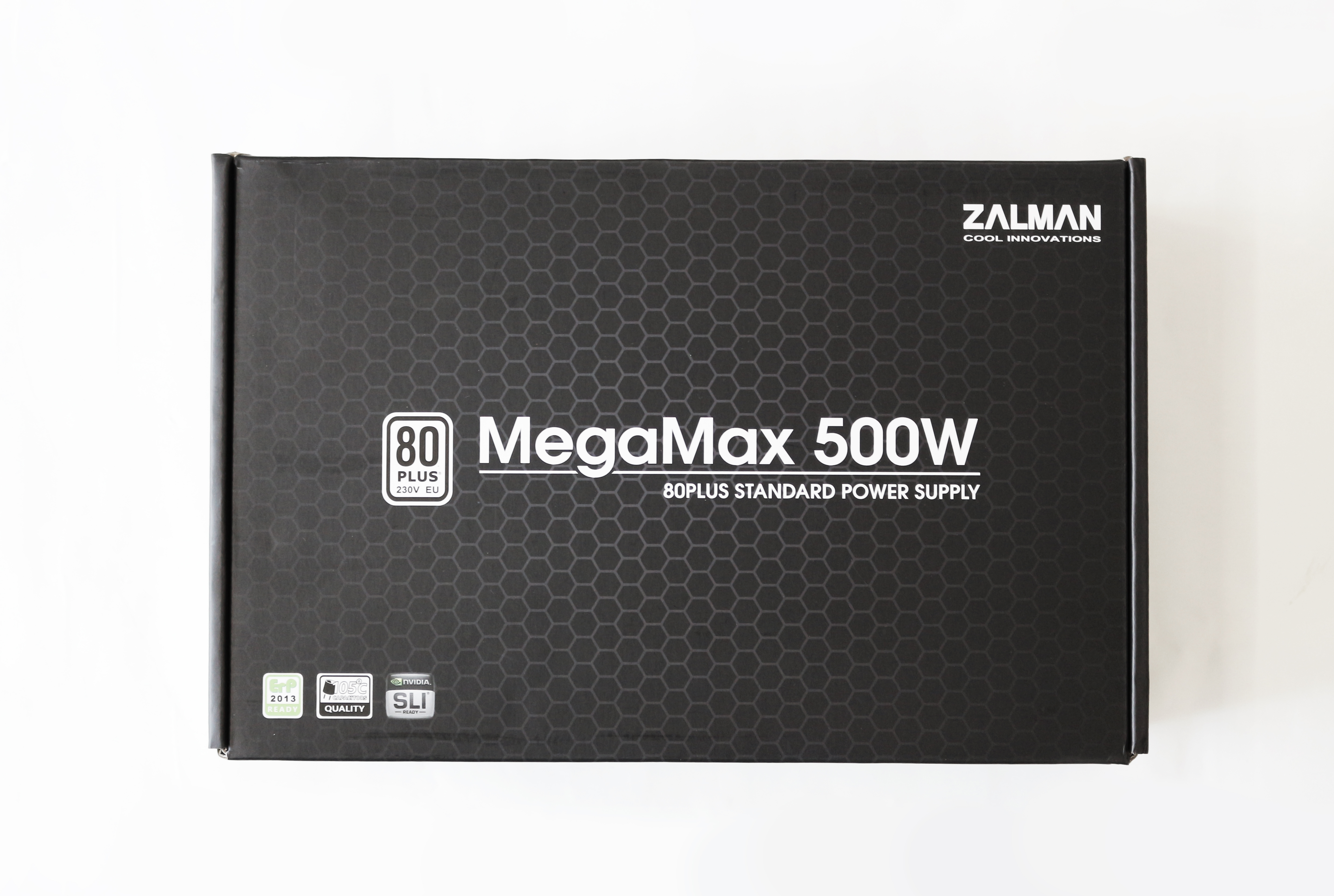 박스 상단과 전면에는 ZALMAN과 제품명인 MegaMax 500W가 쓰여져있고, 제품명 앞에는 80PLUS 인증을 받은 제품을 강조하듯 80PLUS 인증 마크가 그려져 있습니다.