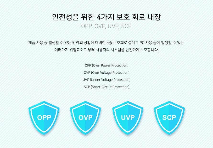 또한 OPP, OVP, UVP, SCP의 4가지 보호 회로를 구성하여 전력 공급에 문제가 생기더라도 시스템을 안전하게 보호할 수 있습니다. OPP, OVP, UVP, SCP는 각각 과전력 보호, 과전압 보호, 저전압 보호, 단락 보호입니다.