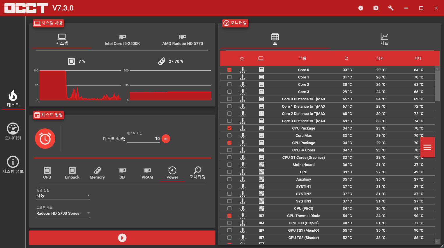 전압 측정을 위해서 테스트 시스템인 i5-2500K(4.5GHz)와 라데온 HD 5770을 가지고 OCCT 파워로 약 10분간 부하를 주었습니다.