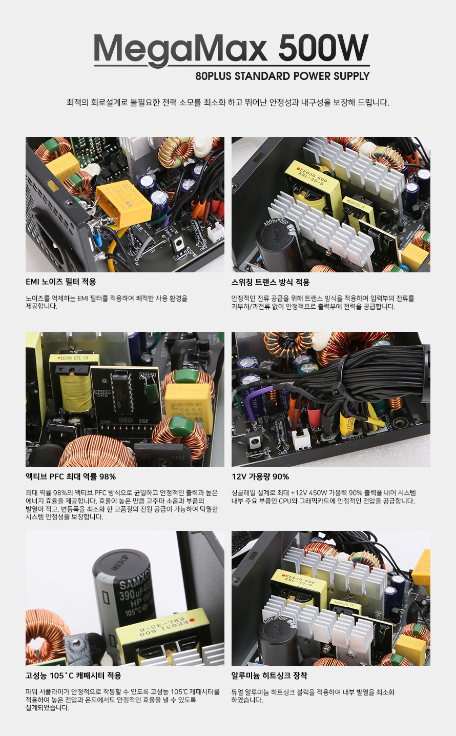 잘만 MegaMax 500W는 EMI 노이즈 필터, 고성능 캐패시터 등을 장착해 안정성과 내구성을 높였고, 최대 역률 98%의 액티브 PFC로 전력의 안정적인 출력이 가능합니다. 특히 파워에서는 12V 출력이 굉장히 중요한데, 싱글레일의 12V가 파워 정격의 90%의 출력이 가능하기에 CPU, GPU에 전력이 부족할 일은 없을 것 같네요.