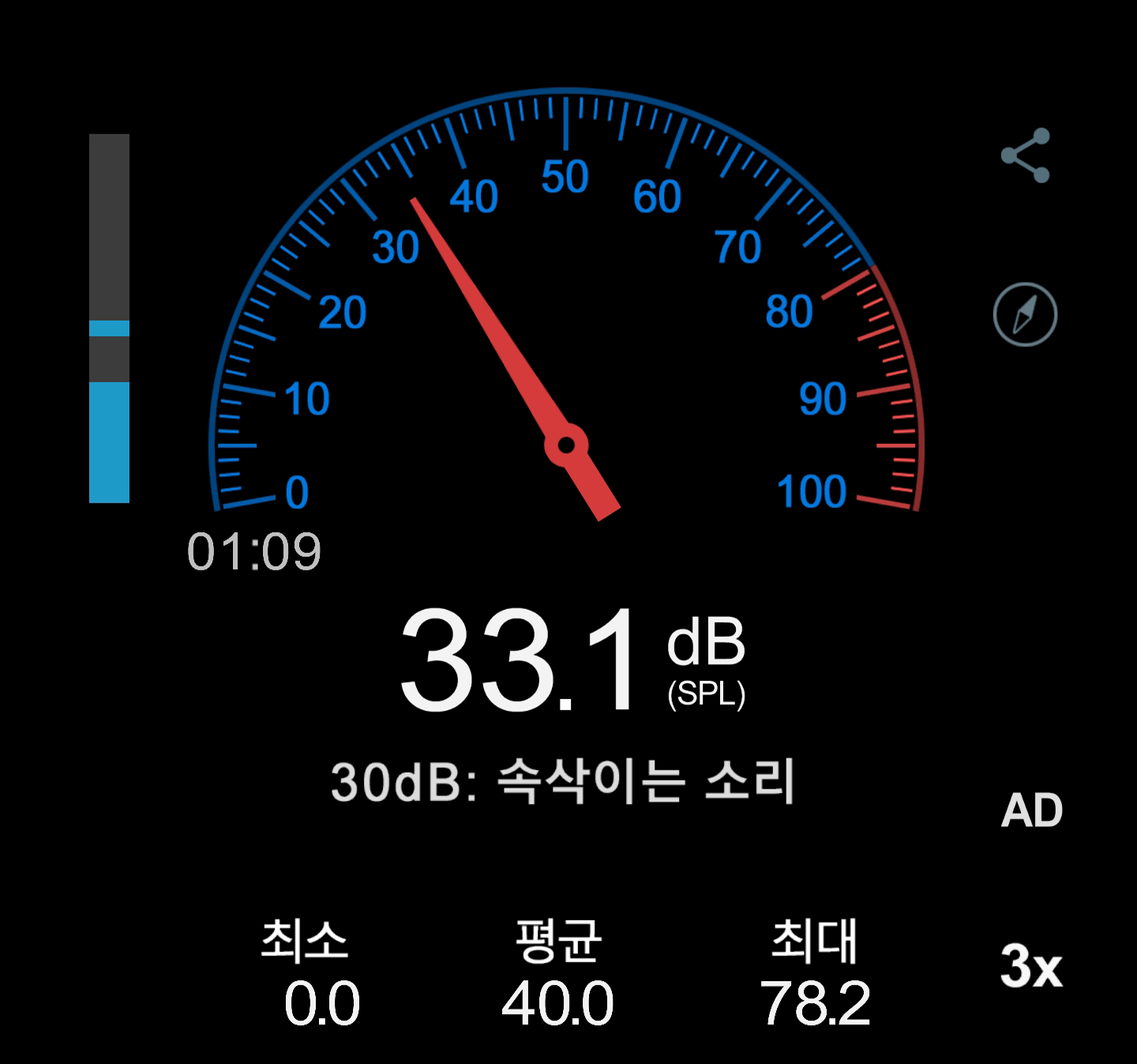 다음은 소음 테스트입니다. 약 20cm 거리에서 CPU, GPU 팬을 모두 강제 정지 시킨 후 스마트폰 앱을 이용해 소음도를 측정했습니다. 완벽한 무소음 환경은 아니기에 정확한 데이터가 아닐 수 있습니다.
