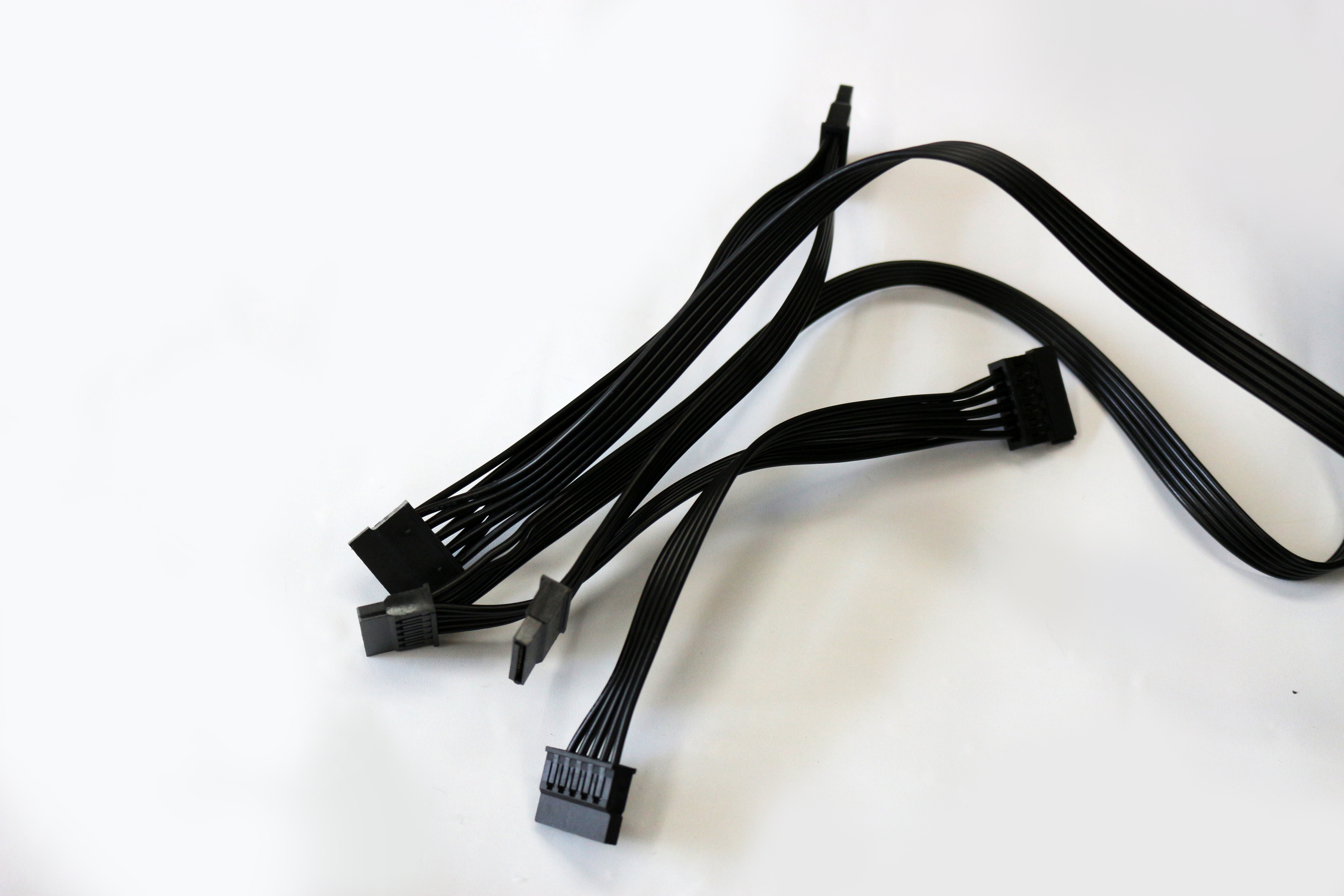 케이블은 메인보드 24핀 하나, CPU 보조전원 8(4+4)핀+4핀, PCIE 전원 6+2핀 두개이고, SATA 전원은 총 6개, FDD하나 IDE 세개로 구성되어 있습니다. 500W 보급형 파워치고는 CPU 보조전원과 SATA 전원이 많은 편이네요. 케이블은 블랙 플랫케이블로 튜닝과 선정리에 유리합니다.