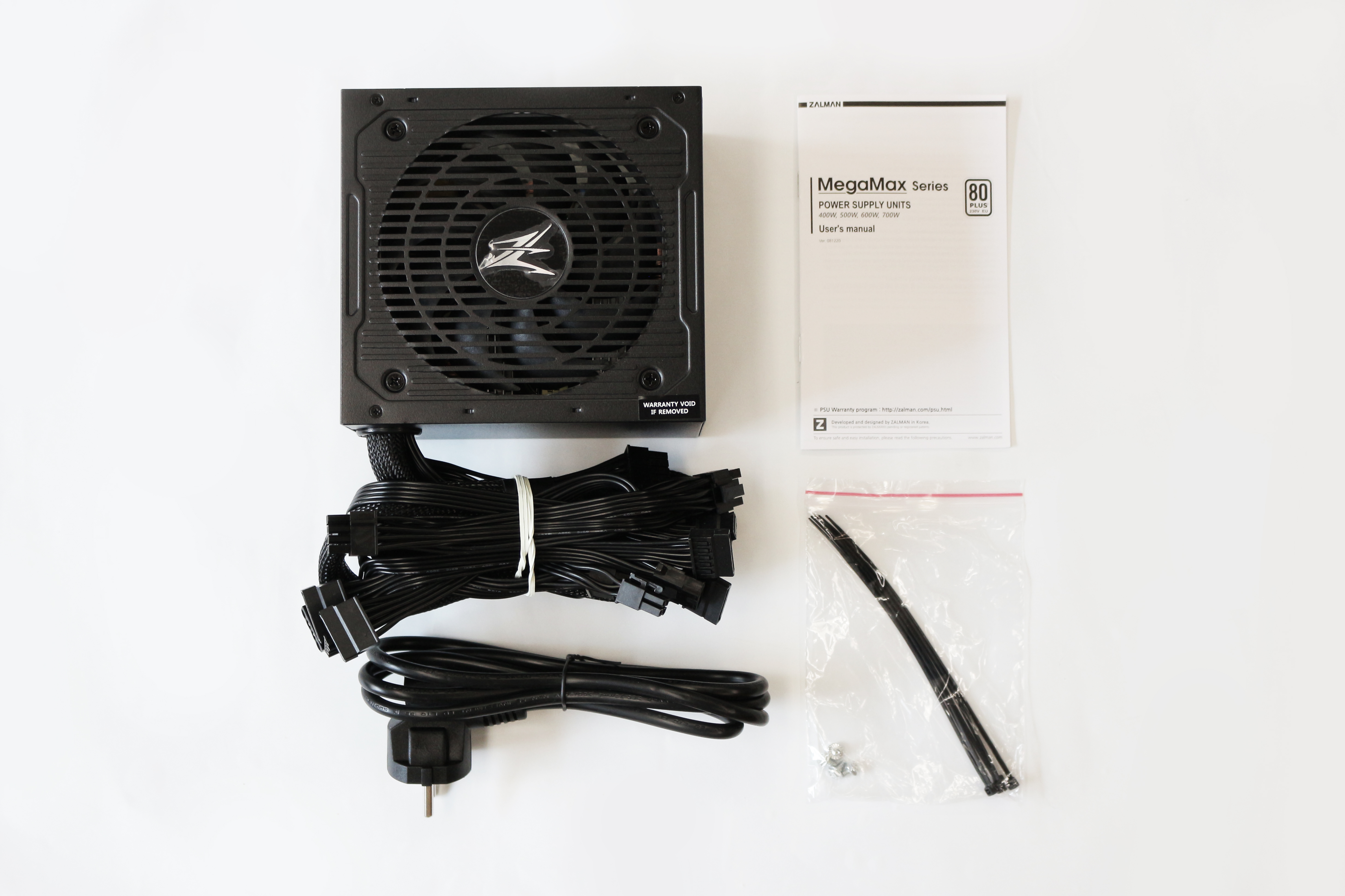 다시 한번 쓰는 이야기지만 개인적으로 이 제품의 사이드 로고가 가장 마음에 드네요. 요즘은 사이드 패널이 대부분 강화유리이고 튜닝을 중요시 하는 시대인데, 아직도 많은 보급형 파워들이 로고나 글씨가 뒤집혀 조립됩니다. 나중에 조립하고나면 그냥 가리는게 낫다고 생각할 정도로 별로에요. 반면에 잘만 MegaMax는 조립 후를 고려해 로고가 그려져있고 깔끔한 모양과 색깔이라 강화유리 케이스에도 잘 어울릴것 같습니다.