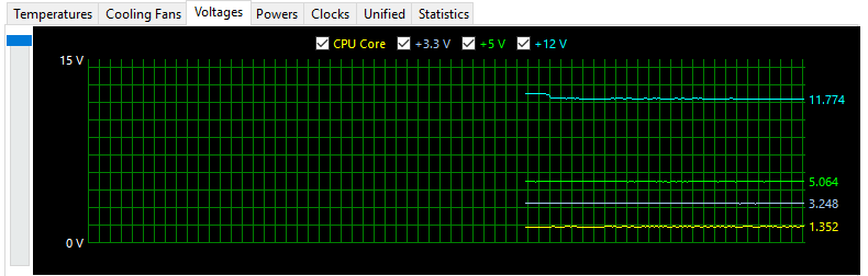 아이들시에는 12.302V, 5.040V, 3.296V였던 전압이 로드가 걸린 후에는 11.774V, 5.064V, 3.248V가 되었습니다.