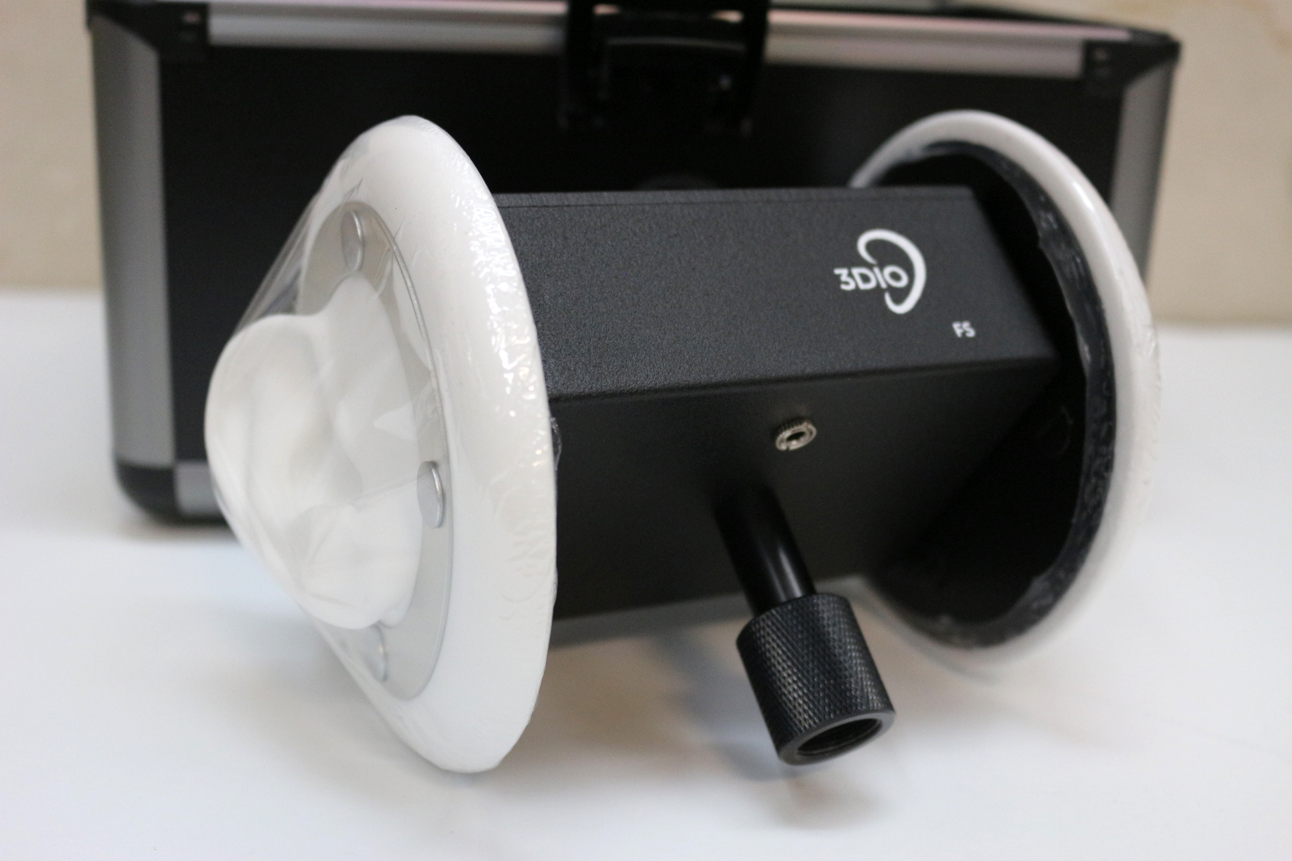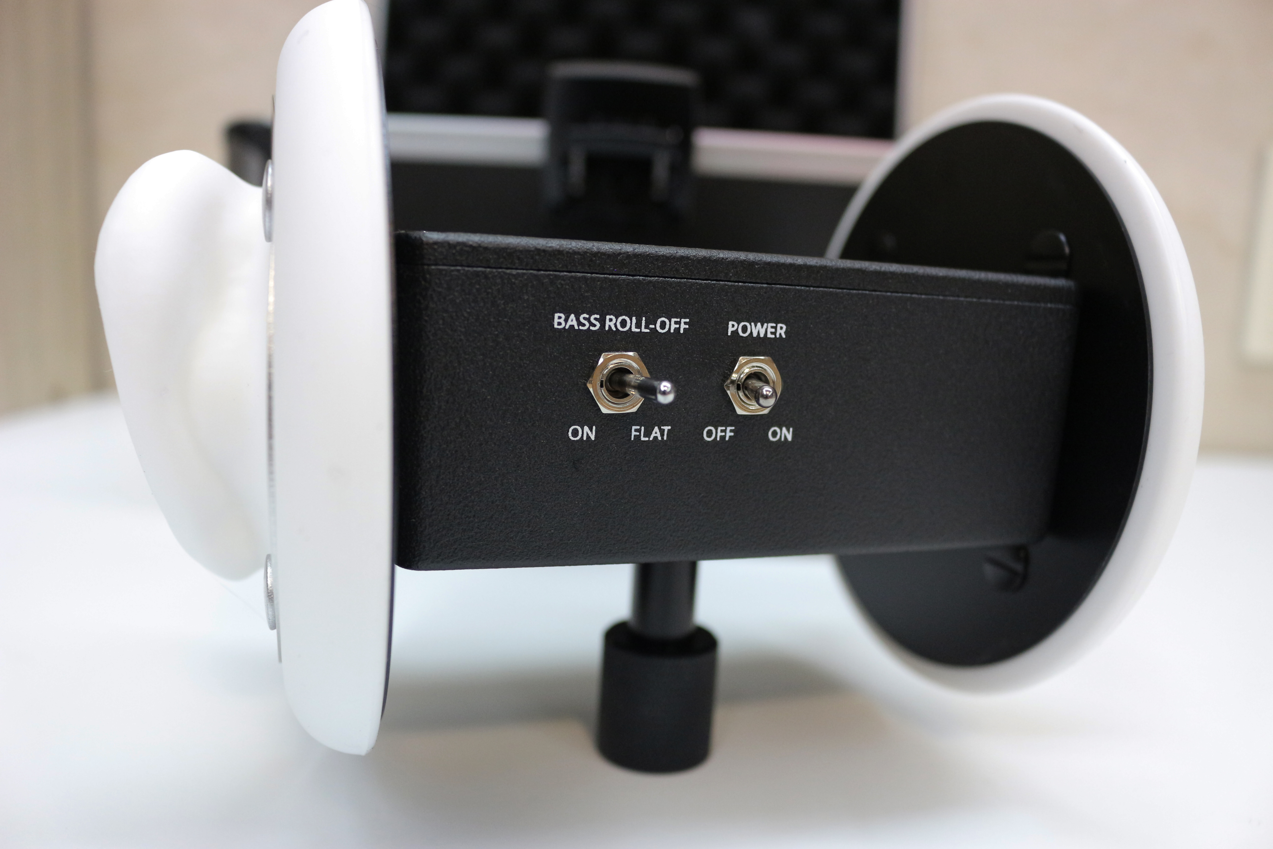 마이크 본체 정면에도 3DIO 로고가 그려져있습니다. 반대쪽에는 BASS ROLL-OFF 스위치와 POWER 스위치가 있습니다. POWER 스위치는 말 그대로 마이크의 파워를 ON/OFF하는 스위치입니다. BASS ROLL-OFF는 저음역대를 깎는, 그러니까 저음역대의 소리를 작게 만드는 스위치입니다. ON으로 두면 저음역대를 깎아냅니다.