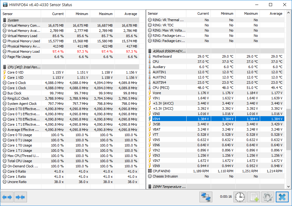 바이오스에서 DRAM 전압 1.4V, IO전압 1.25V를 넣어줬습니다. DRAM의 실인가전압값은 1.384V였습니다. 테스트이기에 전압다이어트는 딱히 하지 않았으나, 메인 데스크탑에서 4000MHz를 1.36V로 사용하고 있으니 그쯤까지는 내려가지 않을까 싶습니다.