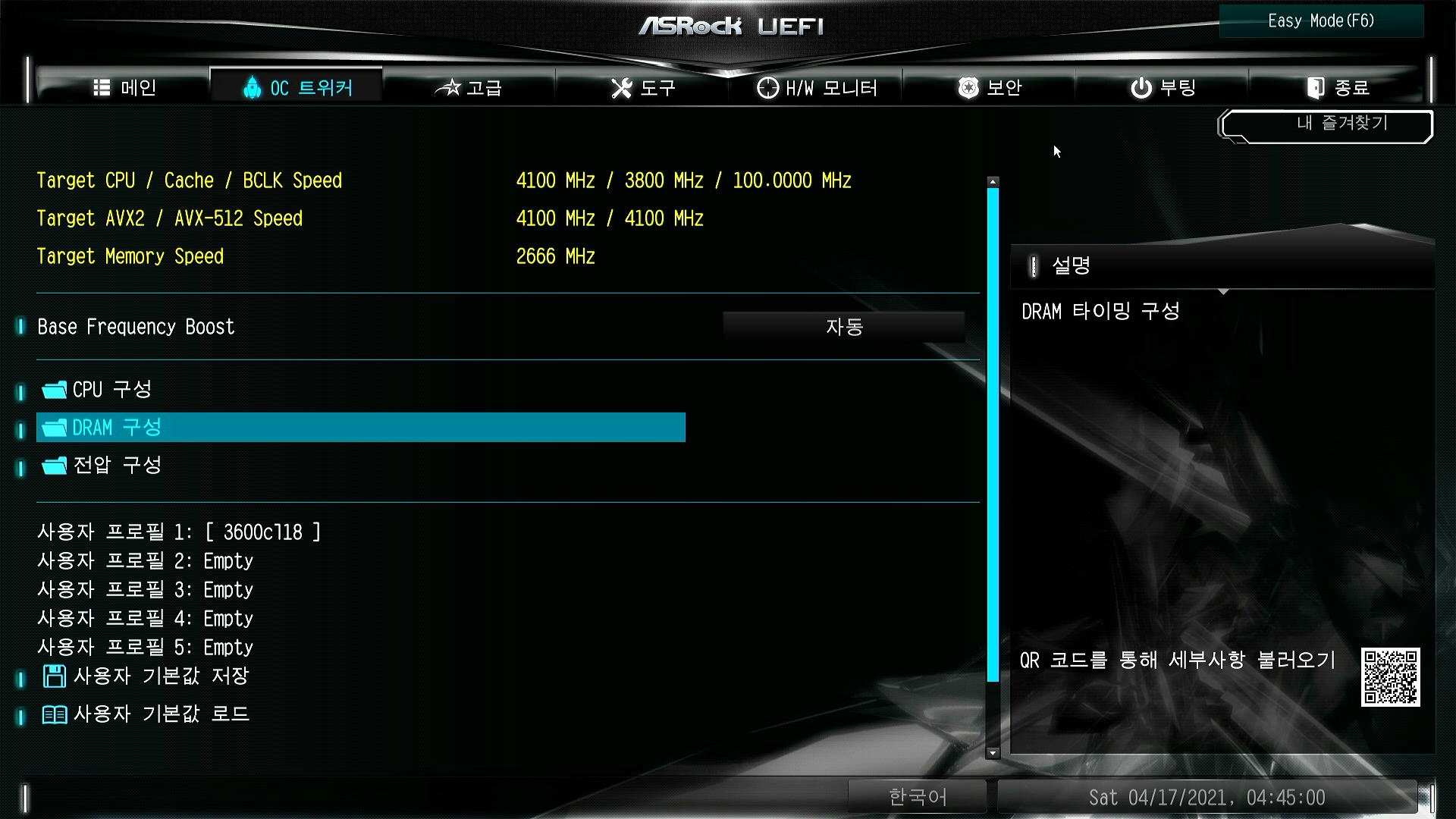그 다음 DRAM 주파수를 변경해줍니다. 시금치라면 요즘은 3600MHz CL18정도가 국민오버로 떠오르는 것 같더라구요.