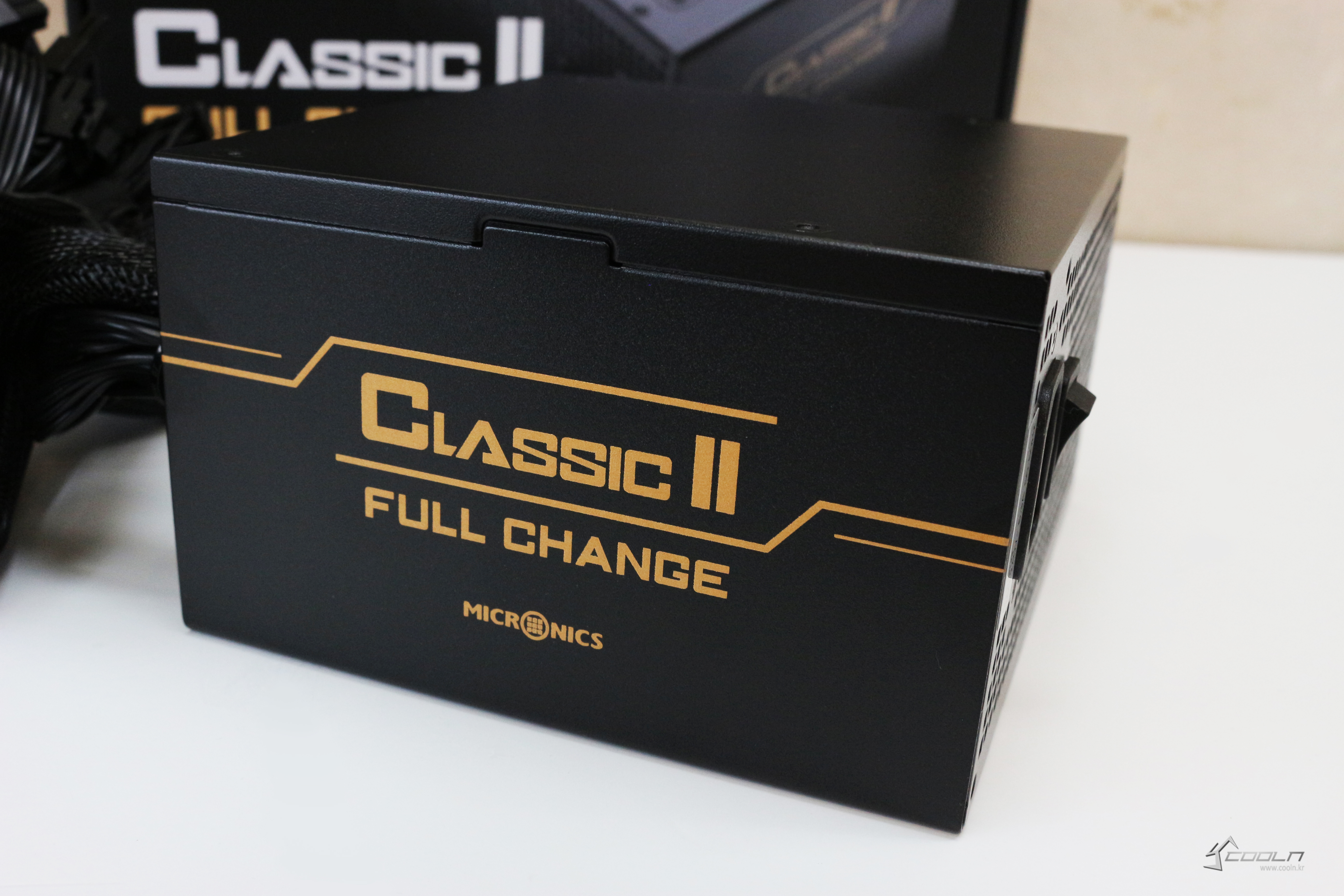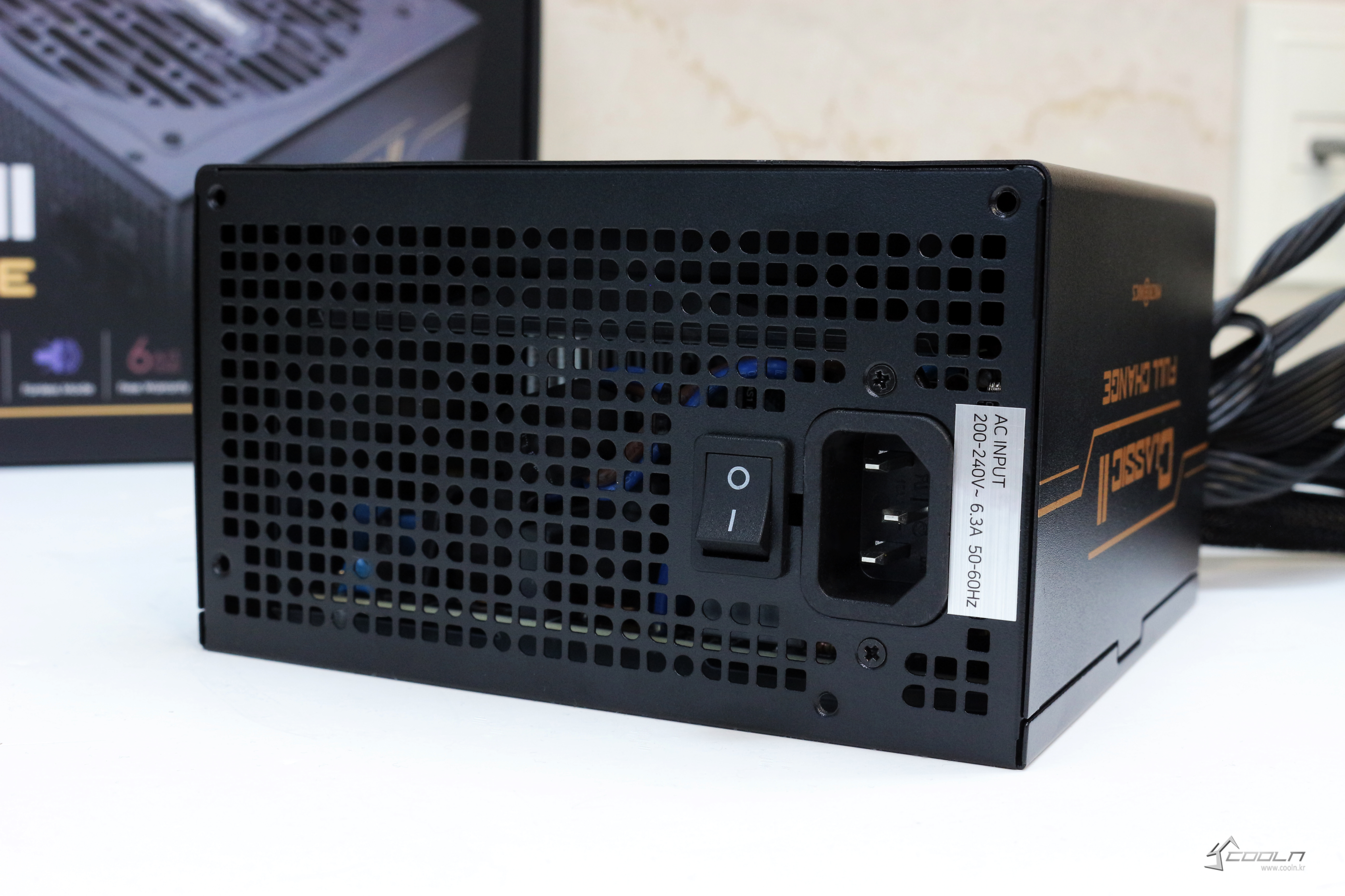 파워의 옆면에는 CLASSIC II FULL CHANGE라고 적혀있습니다. 이 부분이 스티커가 아니라 철판에 직접 도색되어 있는데 이 때문에 고급형 제품이란 느낌을 받을 수 있습니다. 게다가 케이스에 장착하면 정방향으로 보이도록 되어있는데요, 아쉬운 점은 강화유리 케이스에 맞도록 왼쪽에 적혀있는게 아니라 일반적으로 파워를 조립하는 방향에서 보이도록 되어있습니다. 그러니까 강화유리 케이스에서 사용한다고해서 CLASSIC II FULL CHANGE란 글씨를 볼 수 있는게 아니라는 겁니다. 이 부분은 설계 미스인지 아니면 일부러 그런건지 잘 모르겠네요. 파워 뒤쪽면에는 파워 ON/OFF 스위치와 파워 케이블을 꽂는 부분이 있습니다.