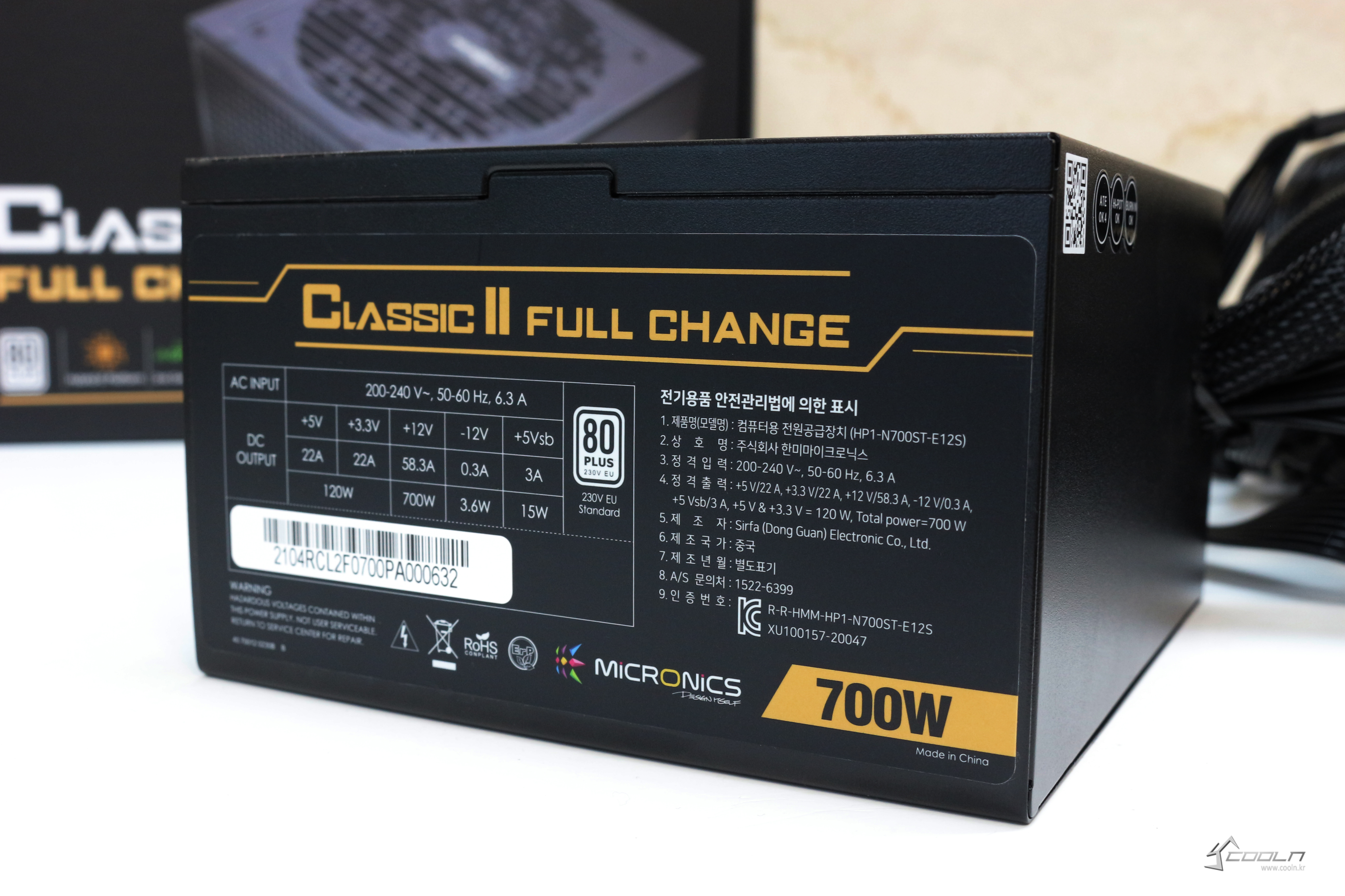 패키지 뒷면 또한 마이크로닉스 Classic II 풀체인지에 적용된 다양한 기술이 적혀져 있습니다. 왼쪽 면에 적힌 거에 더해해, 팬에는 Long Life Bearing이 사용되었고 105도까지 버티는 고급 캐패시터가 사용되었으며 싱글레일이라는 것도 알 수 있습니다. 아랫면에는 DC OUTPUT이 적혀있는데 12V에서 700W가 사용 가능하다는 것을 확인할 수 있습니다. 최근 고성능 시스템에서 12V의 가용량이 상당히 중요한데 가용량 100%라는 것은 그만큼 안정적인 사용이 가능하다는 의미입니다.