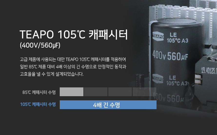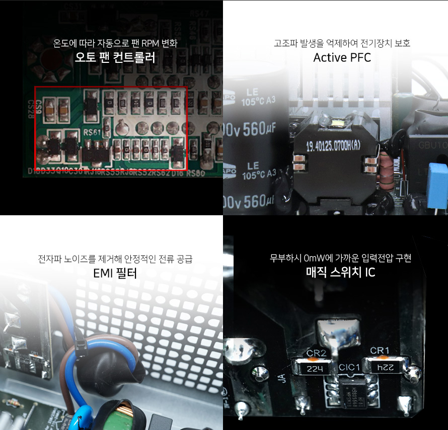 여기에 다양한 보호회로를 적용하여 어디선가 문제가 생긴다해도 시스템을 안전하게 보호할 수 있습니다. 또한 파워내부에는 105도 고급 캐패시터를 사용하였고, EMI필터, 액티브 PFC 등으로 더 안정적이고 신뢰하며 사용할 수 있습니다.