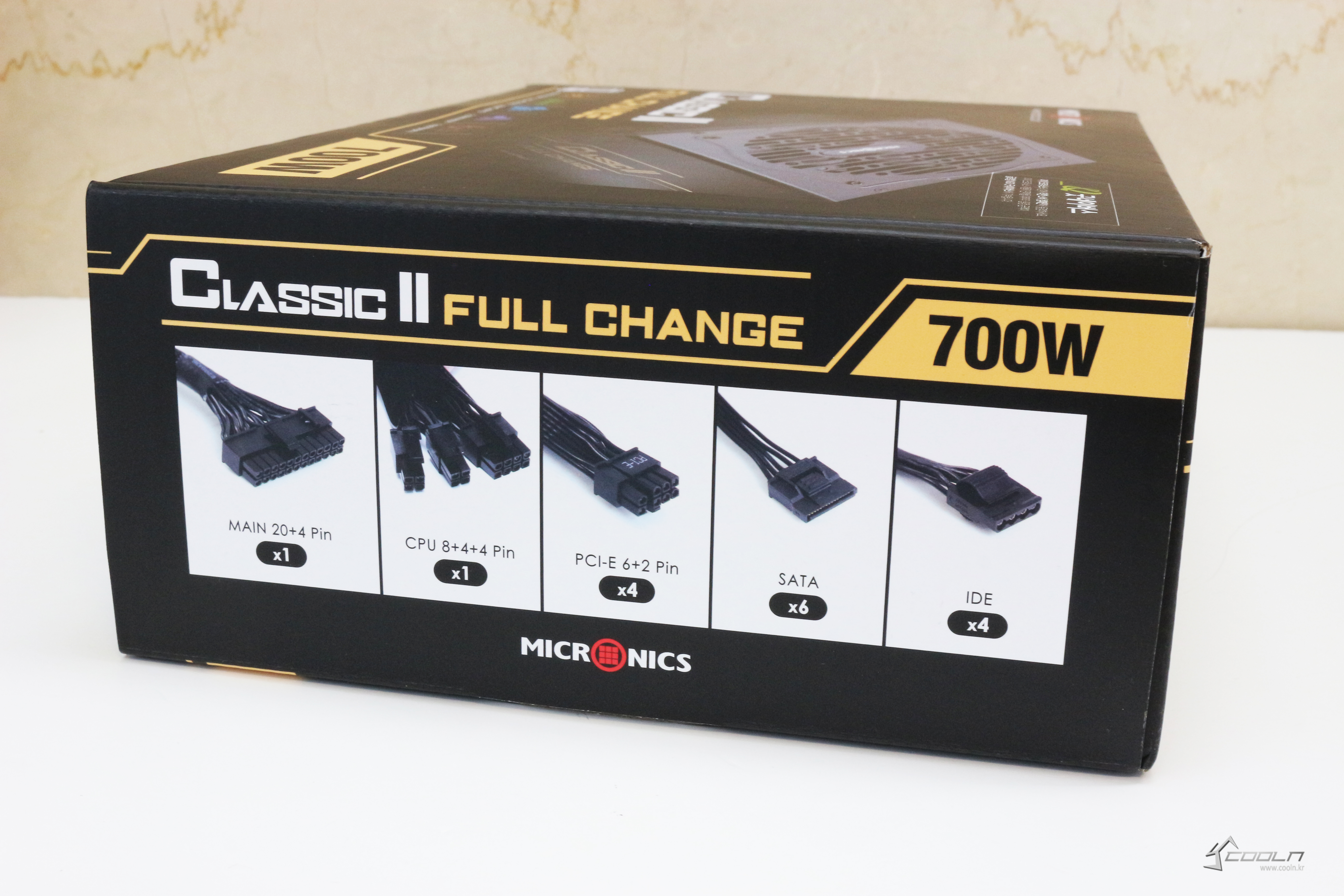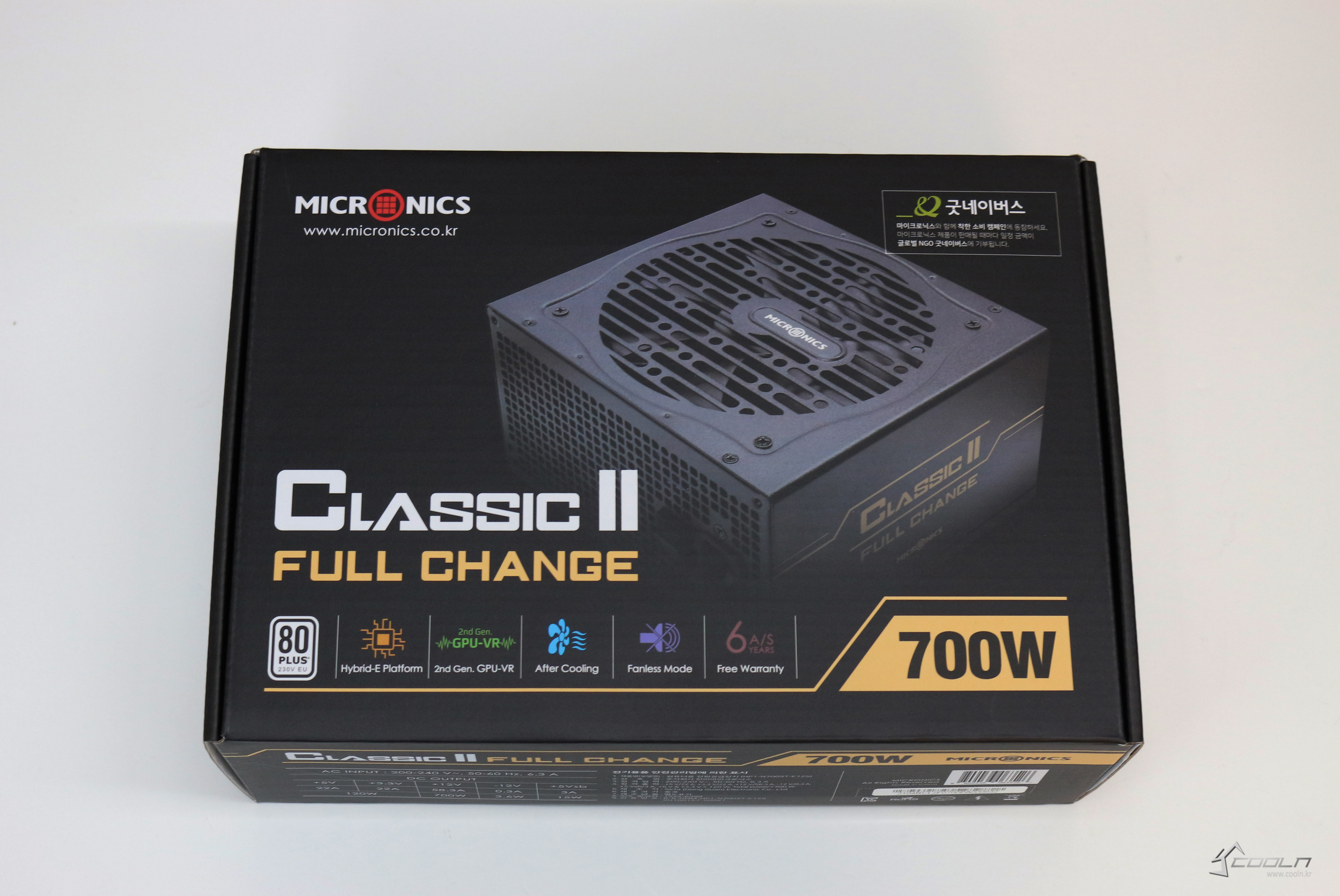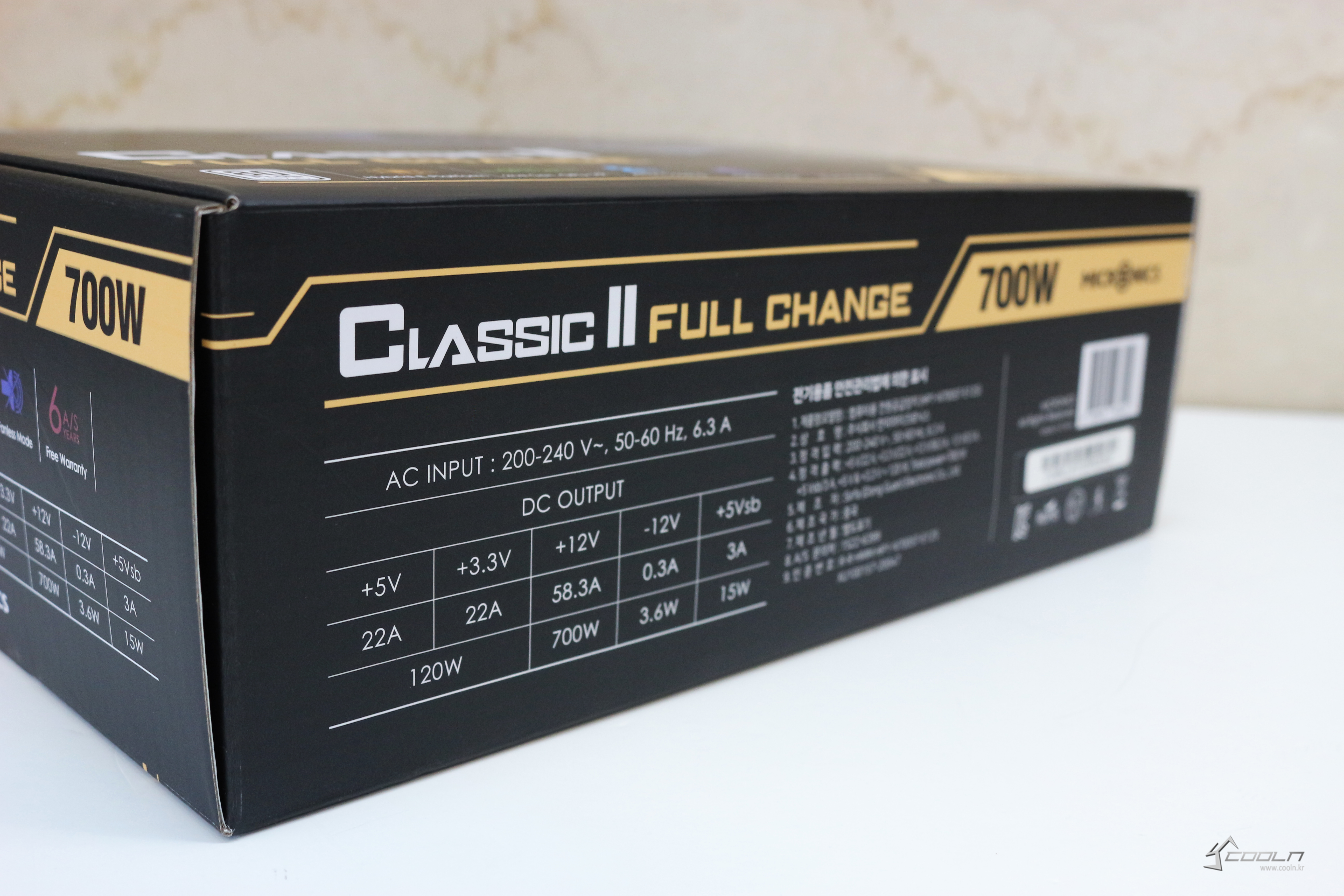 패키지 상단에는 CLASSIC II FULL CHANGE라고 제품명이 적혀있습니다. 오른쪽 아래에는 700W라는 글씨가 크게 적혀있고, 왼쪽 아래에는 80PLUS 인증과 몇가지 기능이 그림과 함께 적혀있습니다. 패키지 왼쪽면에도 같은 그림이 있는데요, 하나씩 살펴보면 Hybrid-E Platform, 2nd Gen GPU-VR과 같은 마이크로닉스의 기술력이 들어갔고, 시스템 종료 후 파워의 잔열을 식혀주는 After Cooling과 전력 사용량이 적을 때 소음을 줄이기 위한 팬리스모드, 그리고 마지막으로 6년의 워런티가 적용되어 있다는 걸 알 수 있습니다. 패키지 오른면에는 파워 케이블의 종류가 개수가 적혀있습니다.
