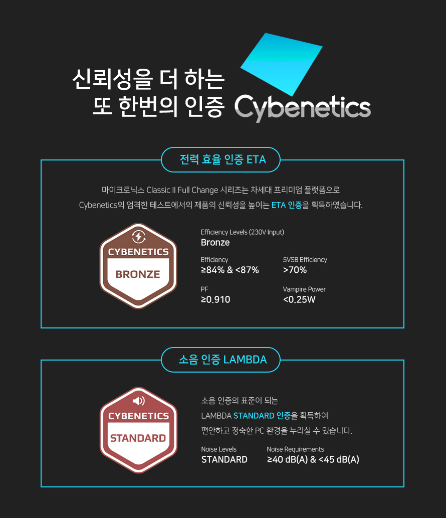 마이크로닉스 Classic II 풀체인지는 80PLUS 인증 뿐만 아니라 CYBENETICS 인증 또한 받았습니다. 흔히 알려져있지는 않지만 CYBENETICS 또한 80PLUS와 비슷한 파워 인증 마크입니다. 일반적으로 CYBENETICS는 고급 파워에만 인증을 활용하고 있는데요, 인증 비용도 결국엔 파워 가격에 영향을 주기 때문에 가격경쟁이 중요한 보급형 파워에는 잘 들어가지 않고 있습니다. 이 CYBENETICS도 80PLUS처럼 효율 인증이 있지만 그와 다른 것은 소음인증이 있다는 점입니다. 즉, 소음도에 따라 점수를 부여한다는건데, 마이크로닉스 Classic II 풀체인지는 소음에서 스탠다드 인증을 받았습니다.