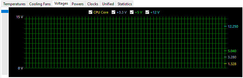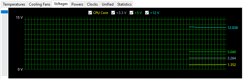 12V, 5V, 3.3V의 전압이 아이들시에는 각각 12.250V, 5.040V, 1.328V였고 로드시에는 각각 12.038V, 5.040V, 3.264V 였습니다. 전압 강하가 상당히 준수합니다. 5V는 완전히 똑같고, 3.3V는 딱 한단계 낮아진 수준입니다. 가장 중요한 12V도 2V가 안되는 전압 강하로 굉장히 좋은 수치를 보여줍니다.