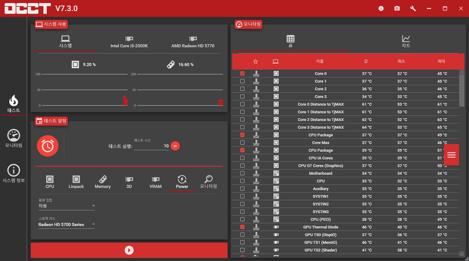 전압 측정을 위해 OCCT 파워를 사용했습니다. 시스템은 i5-2500K 4.5GHz, Radeon HD5770으로 구성되어있습니다.