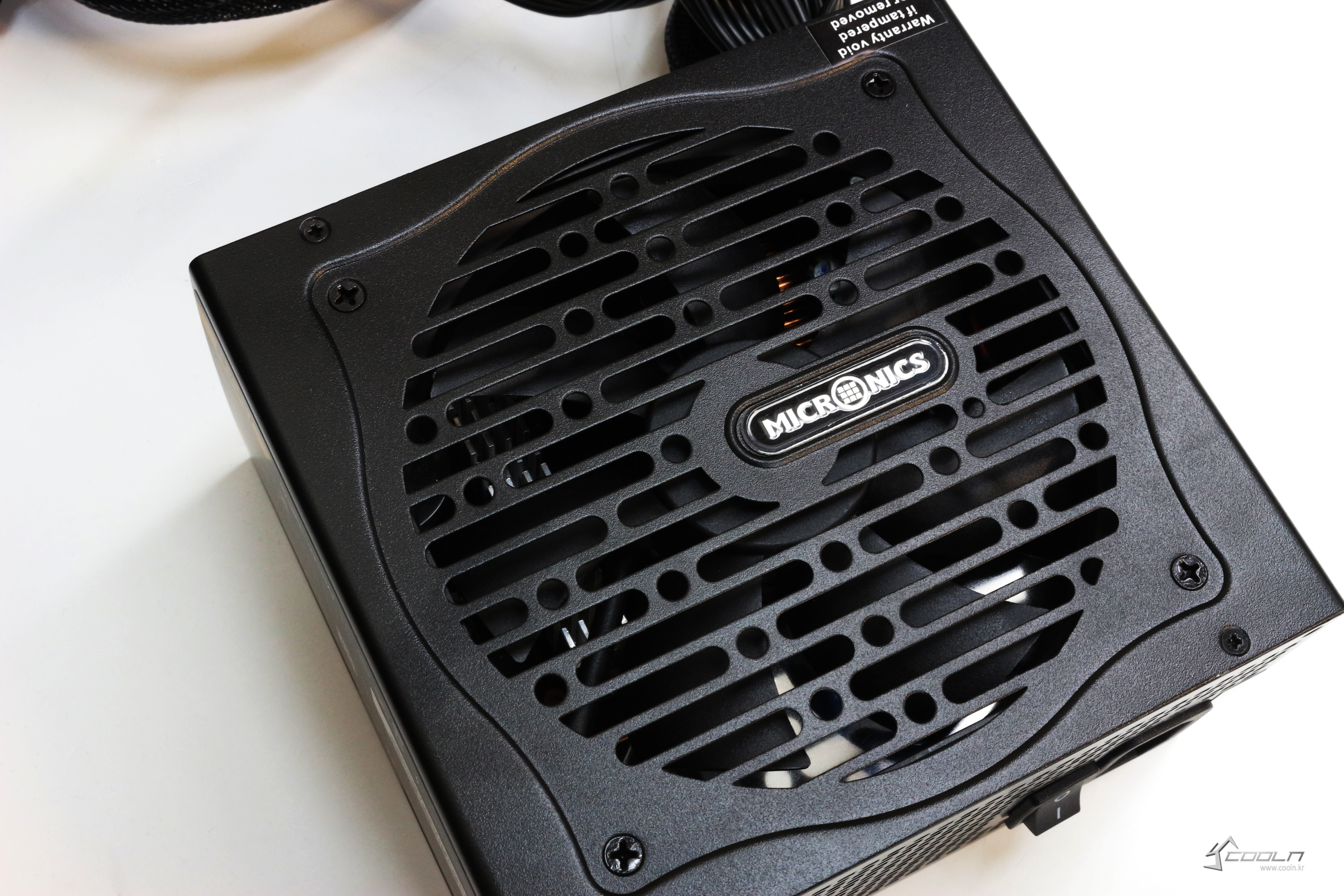 상단에서 보면 마이크로닉스라는 글씨이자 로고가 적혀있는데요, 비대칭이면서도 거슬리지 않을 정도로 이쁘게 되어있습니다. 이것만 보아도 디자인을 꽤나 신경을 쓴 것 같다는 생각이 듭니다. 케이블이 나오는 쪽에는 워런티 스티커가 붙어있습니다. 이 스티커를 제거하면 무상수리를 받을 수 없으니 훼손되지 않게 주의하셔야 합니다.