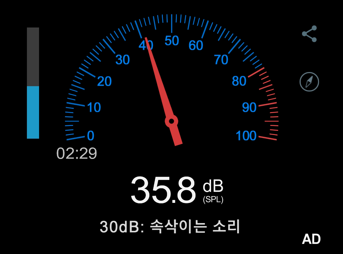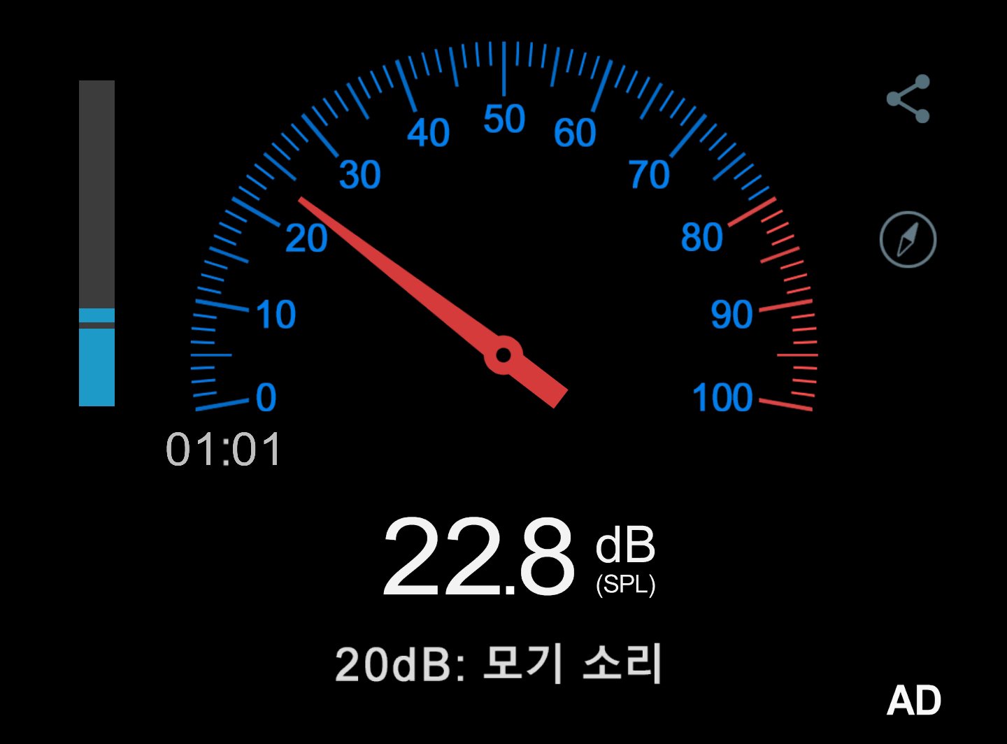 아이들시에 소음은 팬이 안돌아가므로 당연히 주변 소음만 들어갑니다. 팬이 돌아갈 때에는 약 35~38dB정도였습니다.