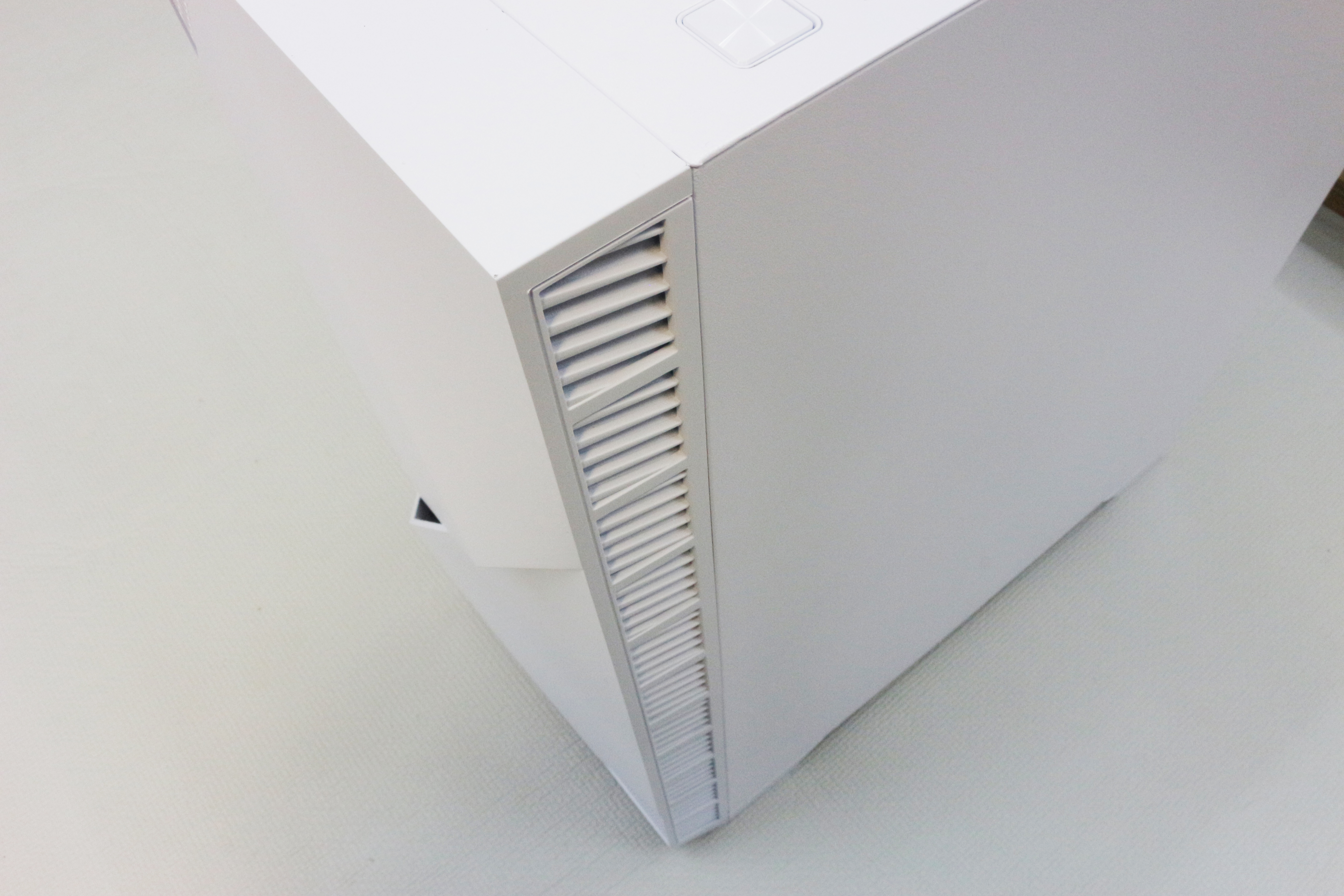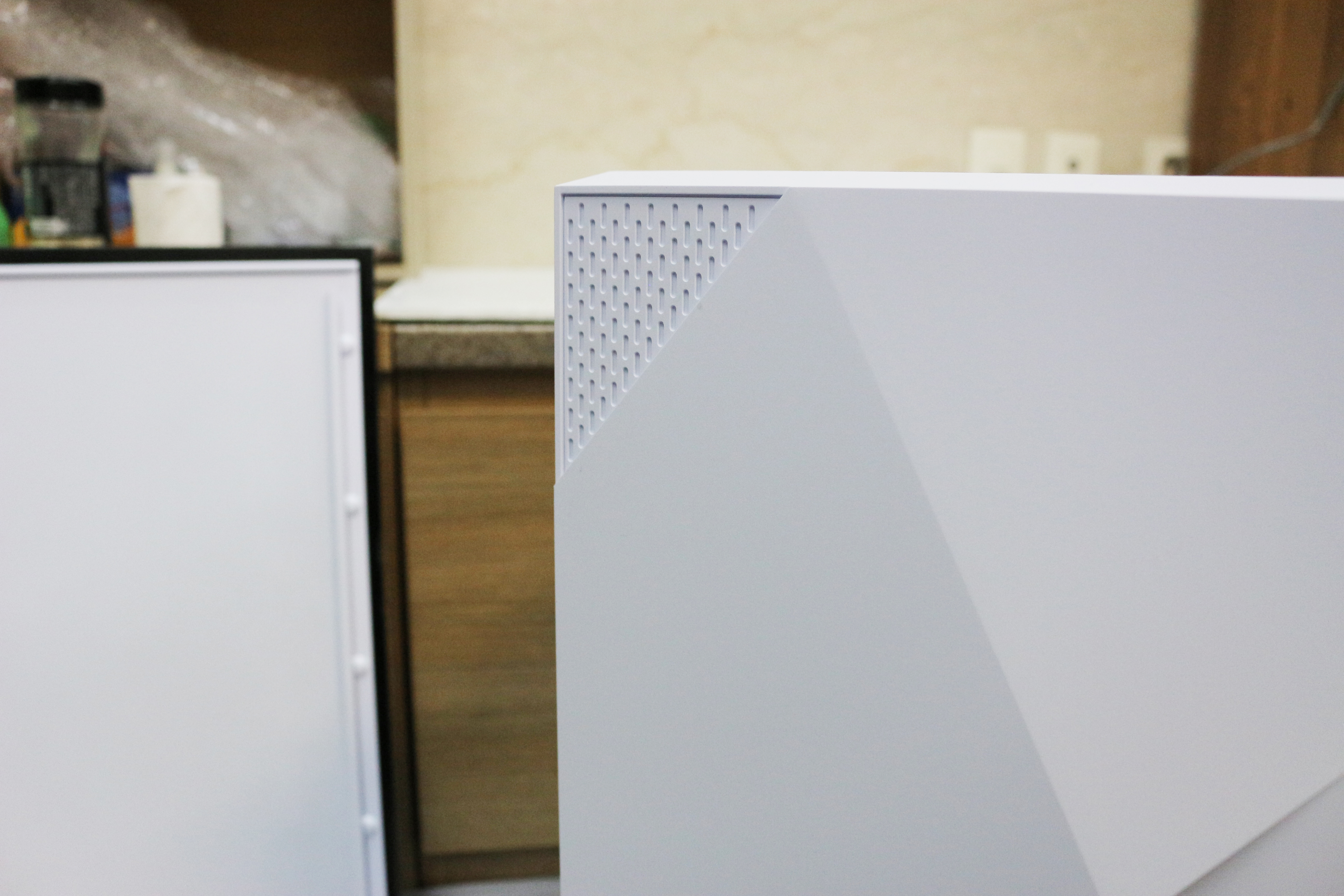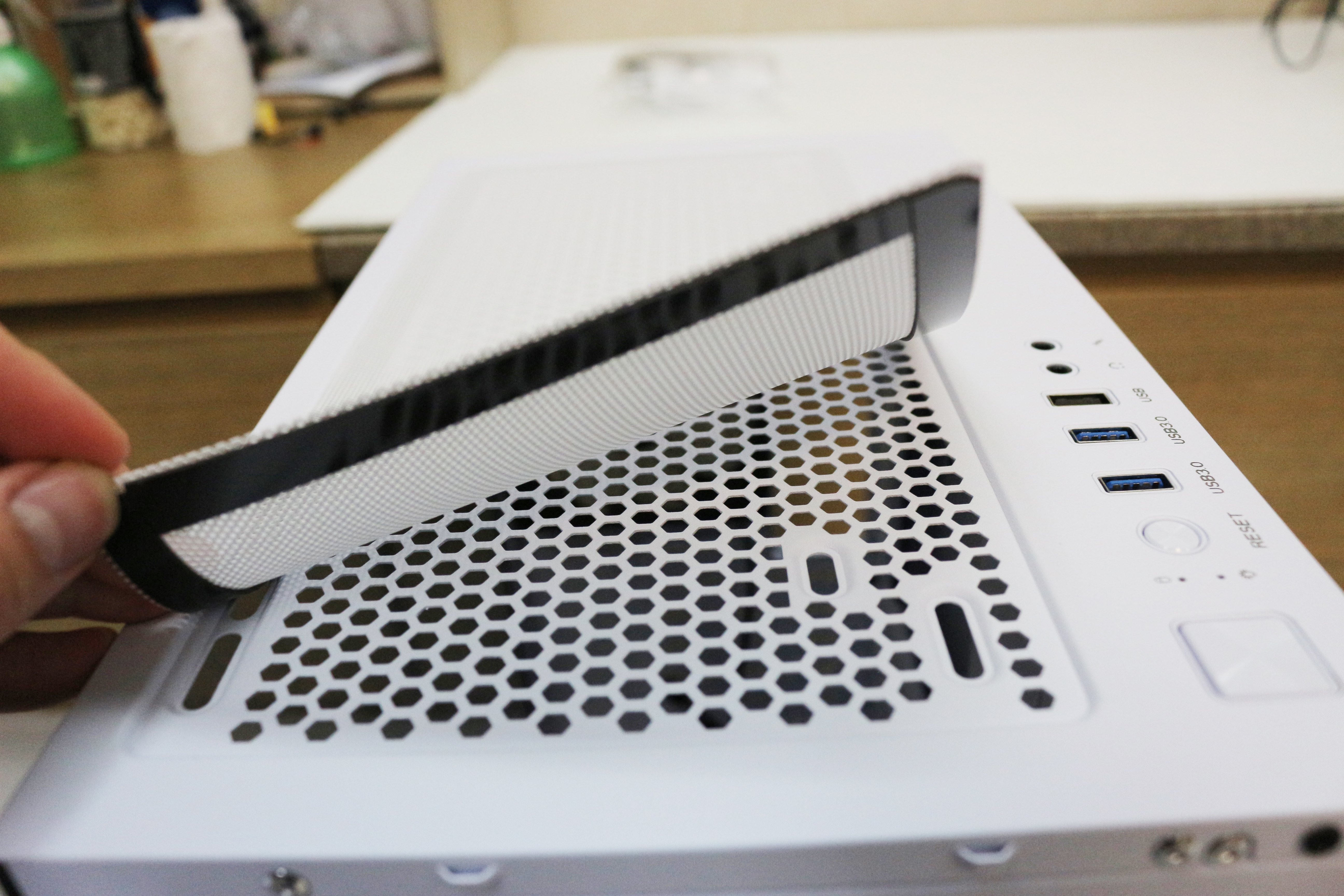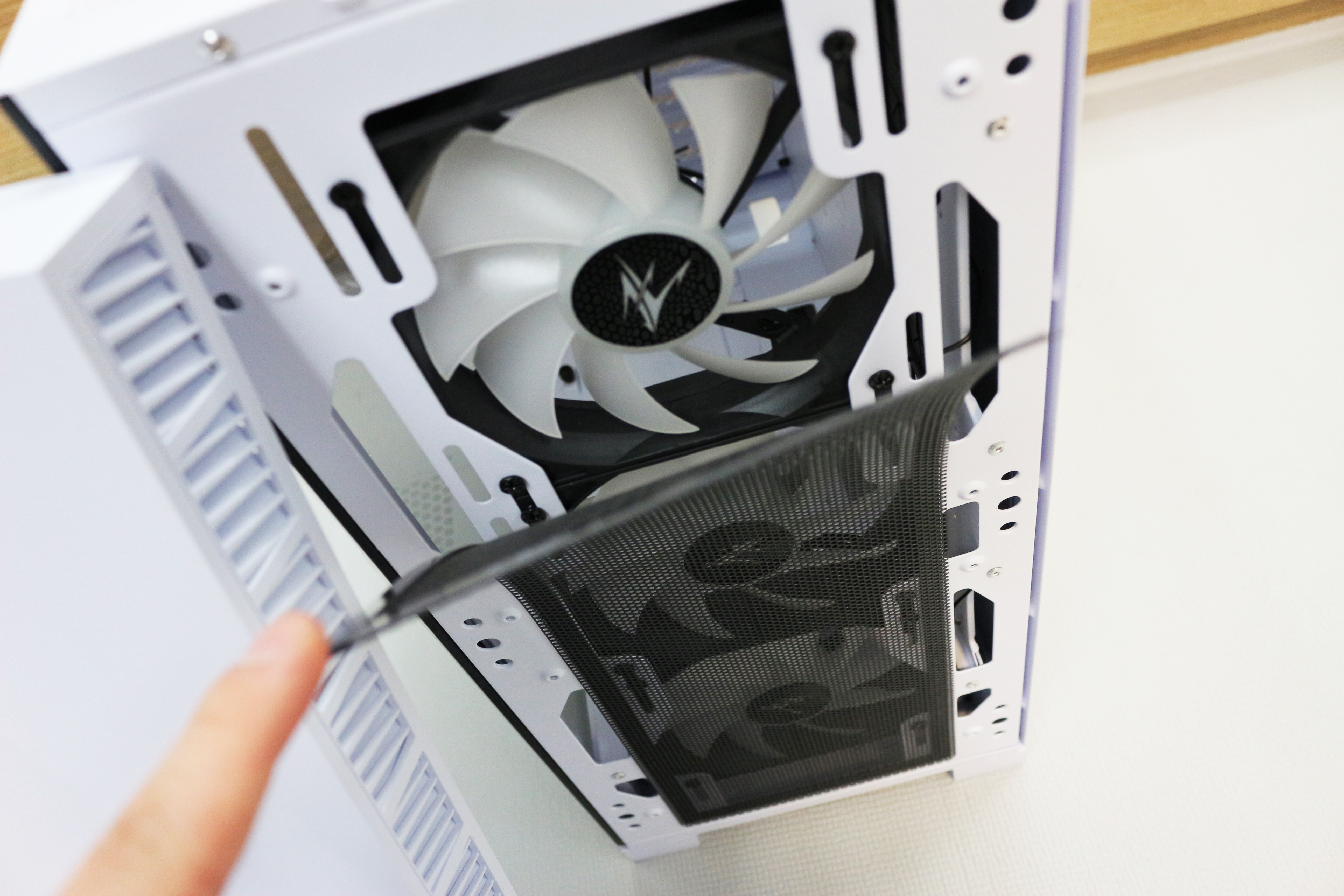전면은 얼핏보면 모서리 부분이 에어홀처럼 보이는데 아쉽게도 에어홀이 아닙니다. 대신 측면부에 에어홀이 있어 충분한 쿨링이 가능합니다. 또한 전면 중앙의 사선부분에도 약간의 공간이 있어서 공기가 드나들기 충분합니다. 전면패널은 분리가 가능한데, 전면 패널을 분리하면 팬이 보이고 앞에 자석으로된 탈부착식 매쉬가 보입니다. 간단한 자석 탈부착식이라 먼지를 털어내기 용이한것 같네요.