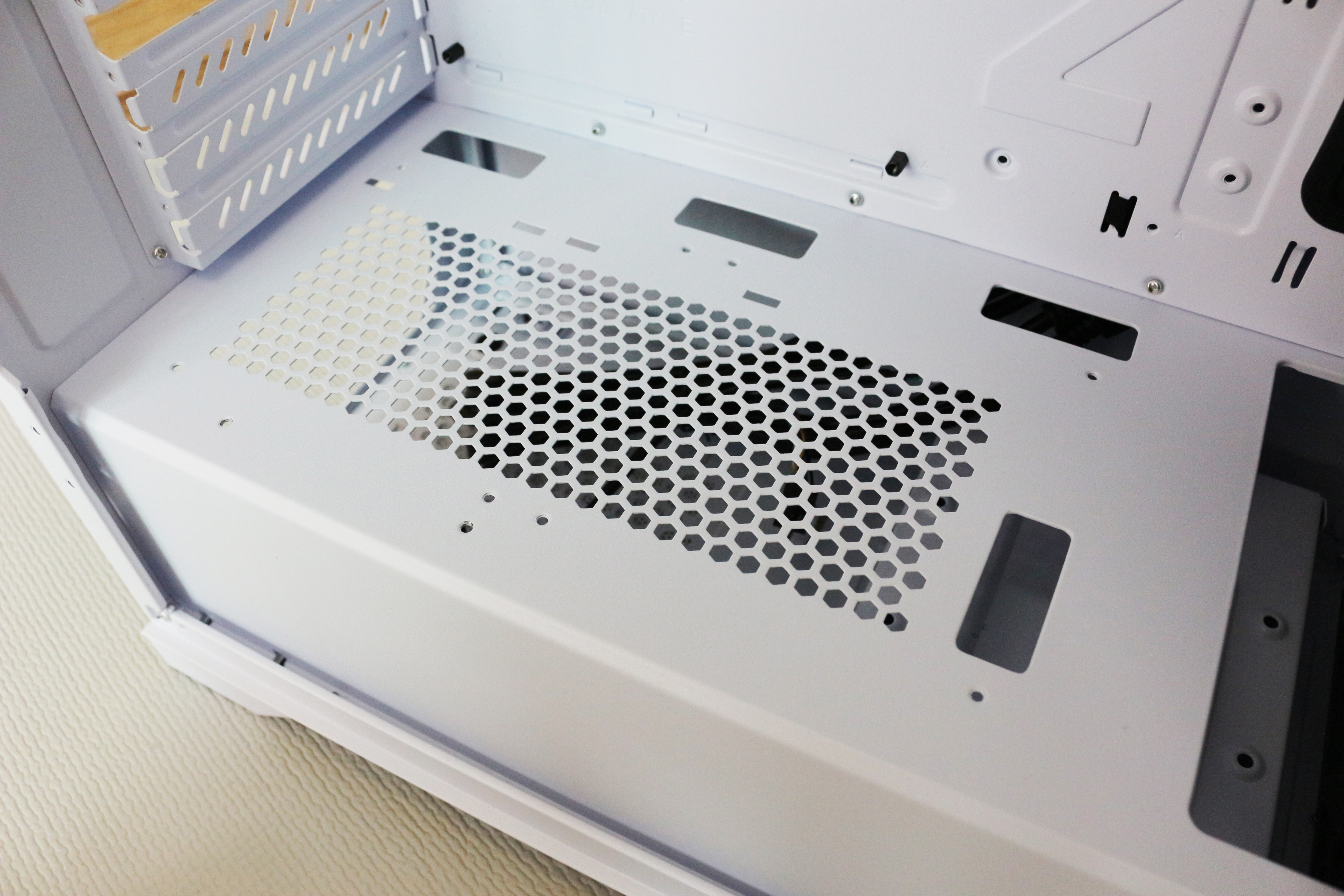 최근 트렌드에 맞게 내부 튜닝을 위한 강화유리 측면 패널을 사용했습니다. 후면에는 후면팬 에어홀과 7개의 PCI슬롯, 파워 장착부가 보입니다. 상단은 자석으로 된 탈부착식 매쉬 커버가 있습니다. 매쉬 커버를 들어보면 벌집모양의 에어홀과 280 라디에이터까지 장착 가능한 나사홀이 보입니다. 조금 특이하게 전면 I/O 단자들은 전면쪽에 있지 않고 오른편에 나열되어있습니다. 공간활용에 있어서는 조금더 유리한것 같네요. 그리고 하단 파워 장착부에도 매쉬가 있습니다.