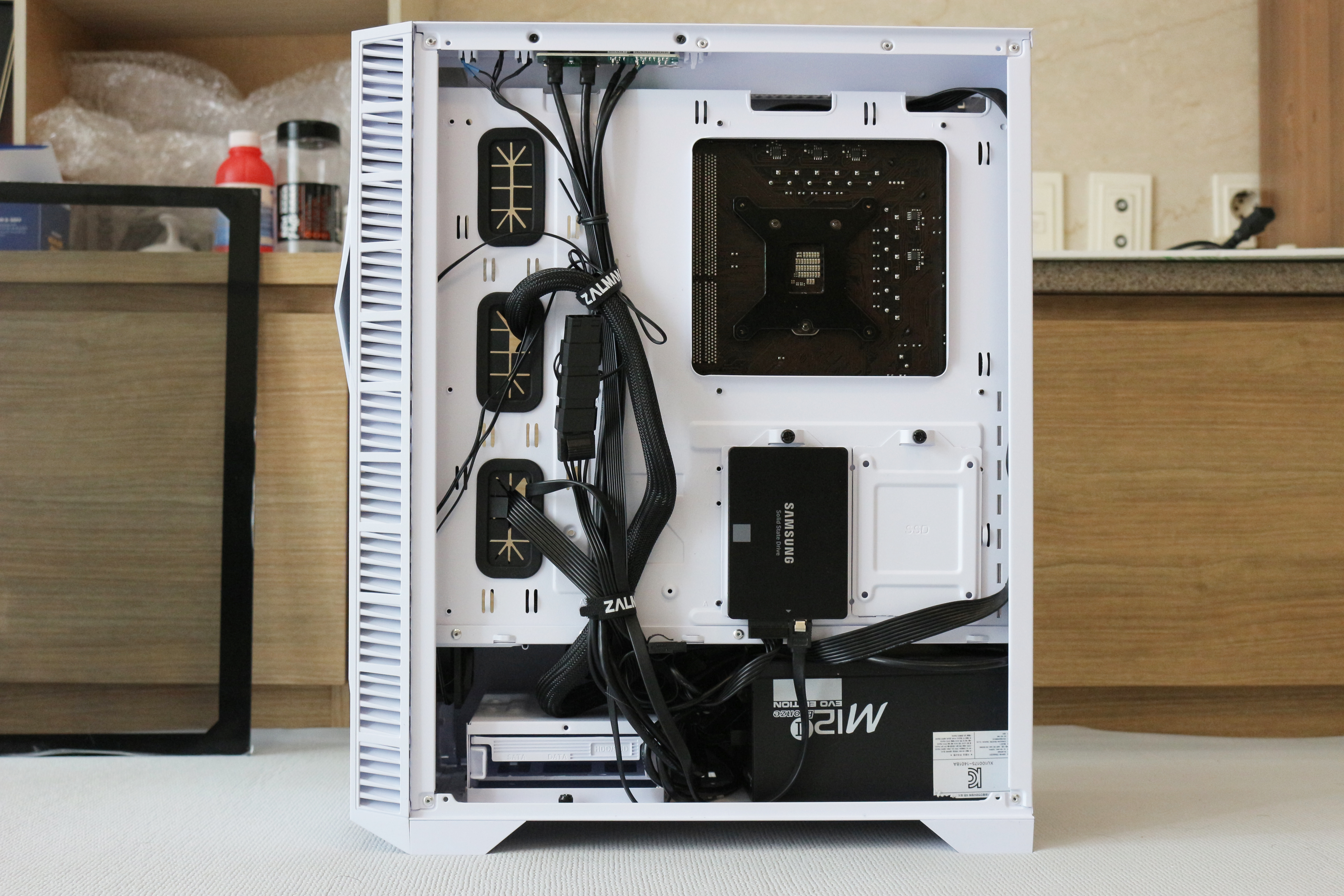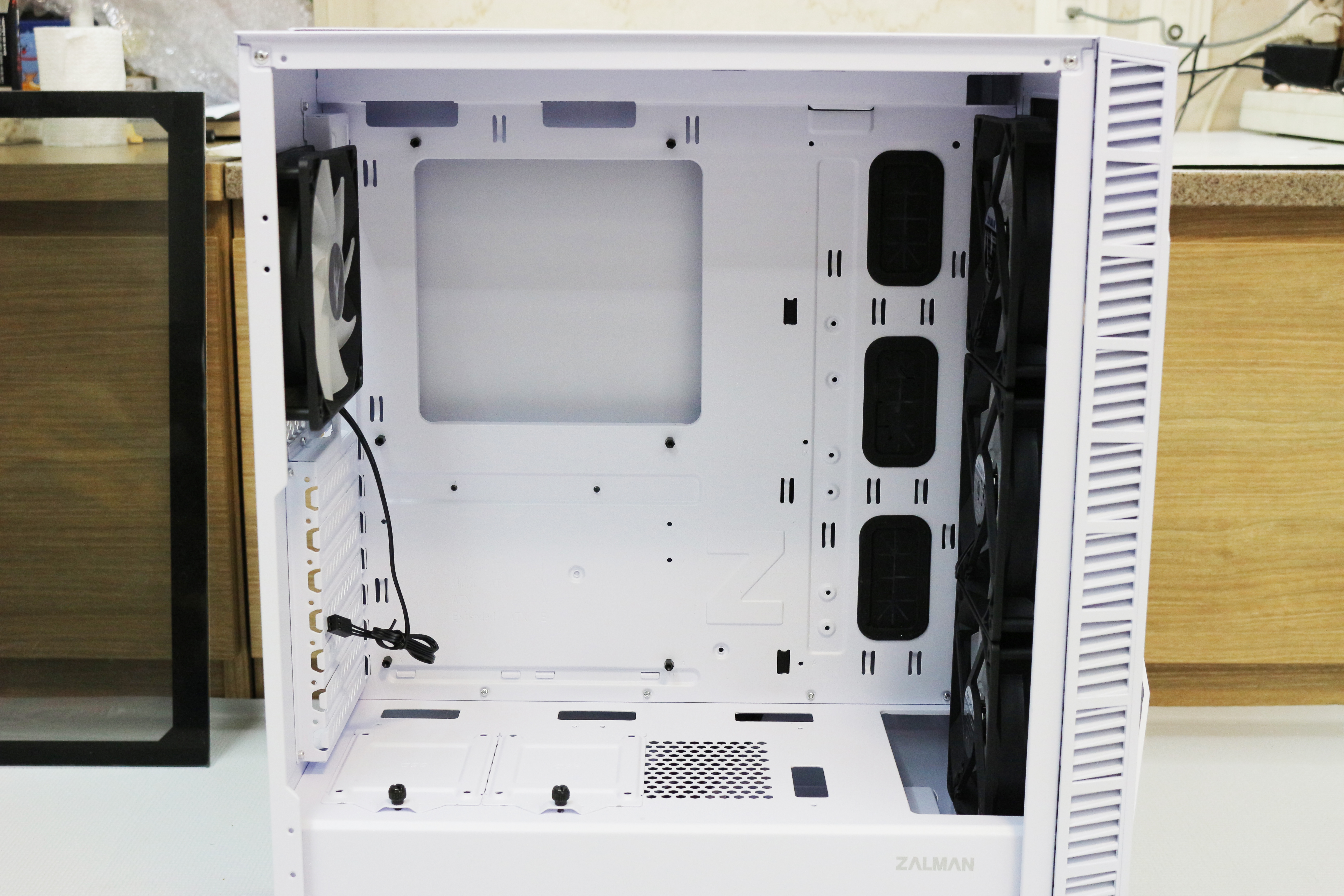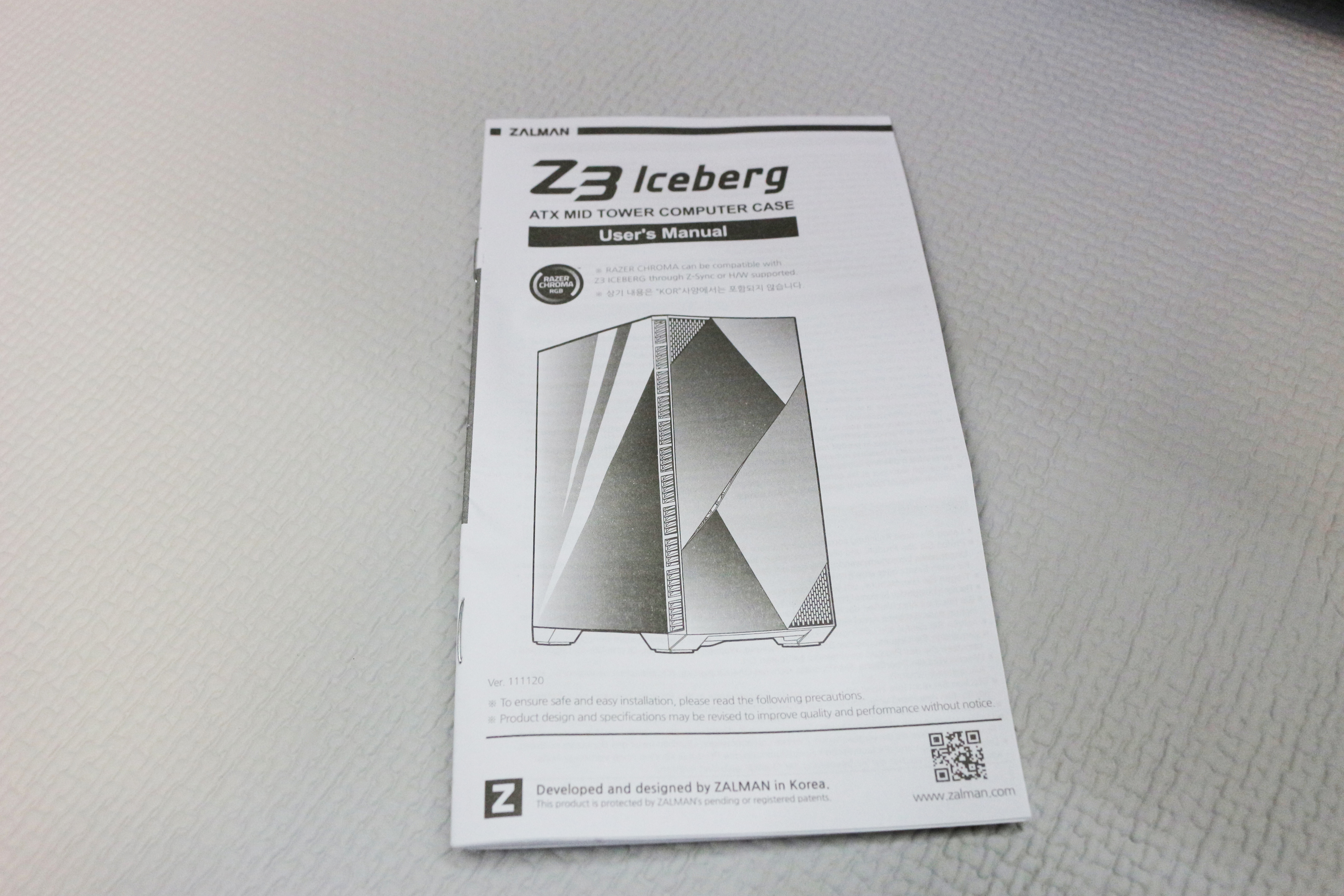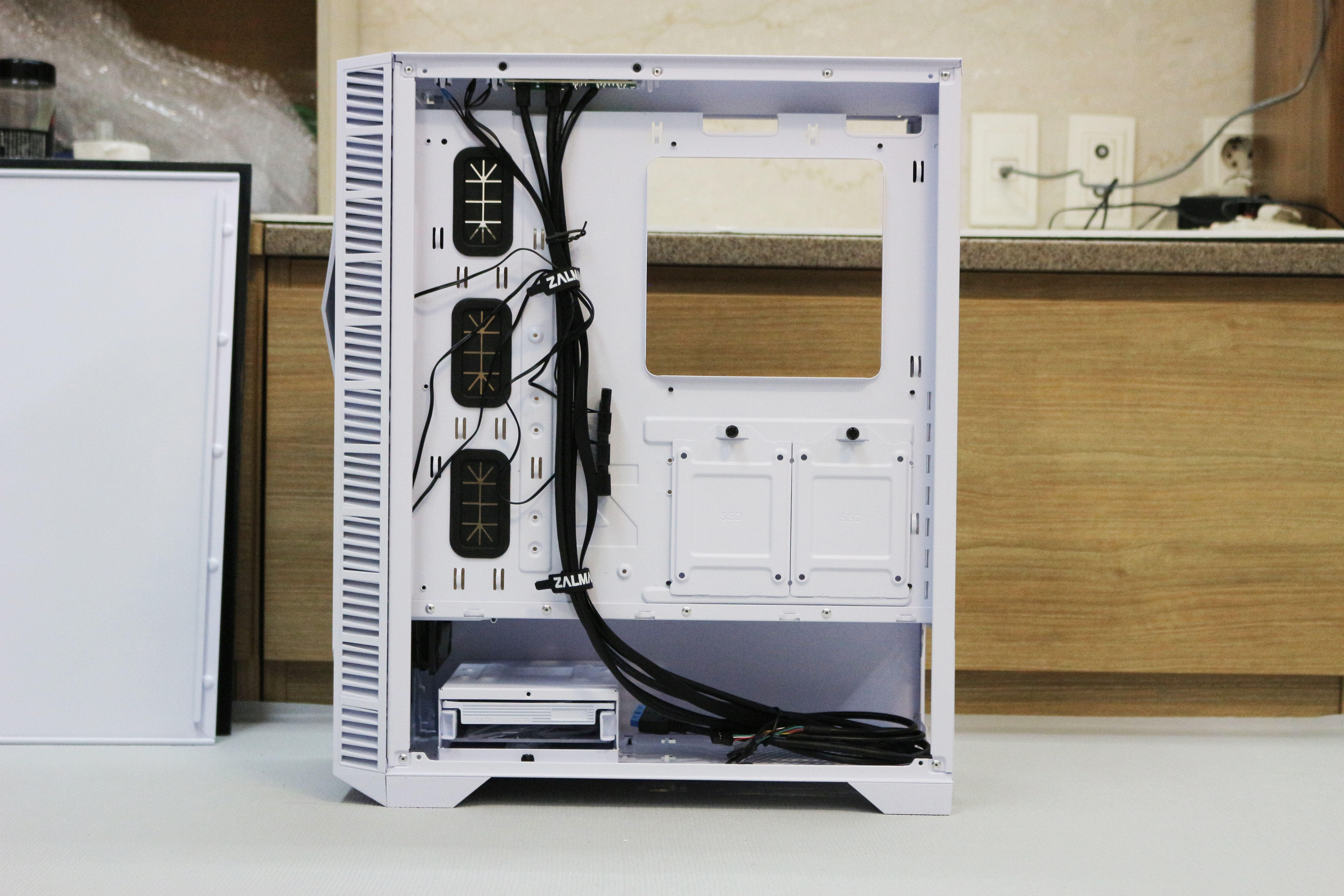 잘만 Z3 아이스버그는 ATX까지 들어가는 미들타워 케이스입니다. 전면쪽에는 팬 3개가 장착되어있고 옆면에 선정리 홀이 있습니다.