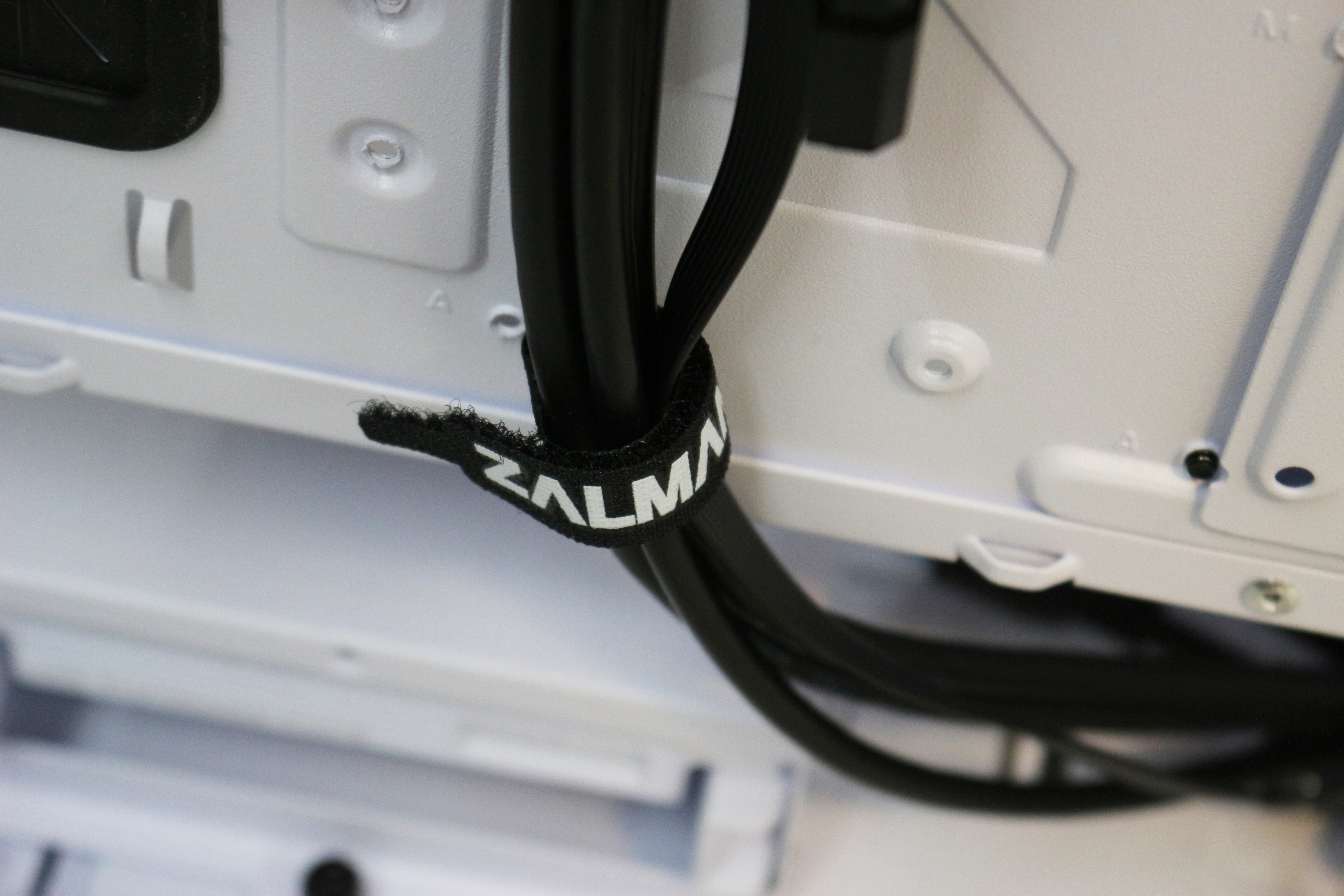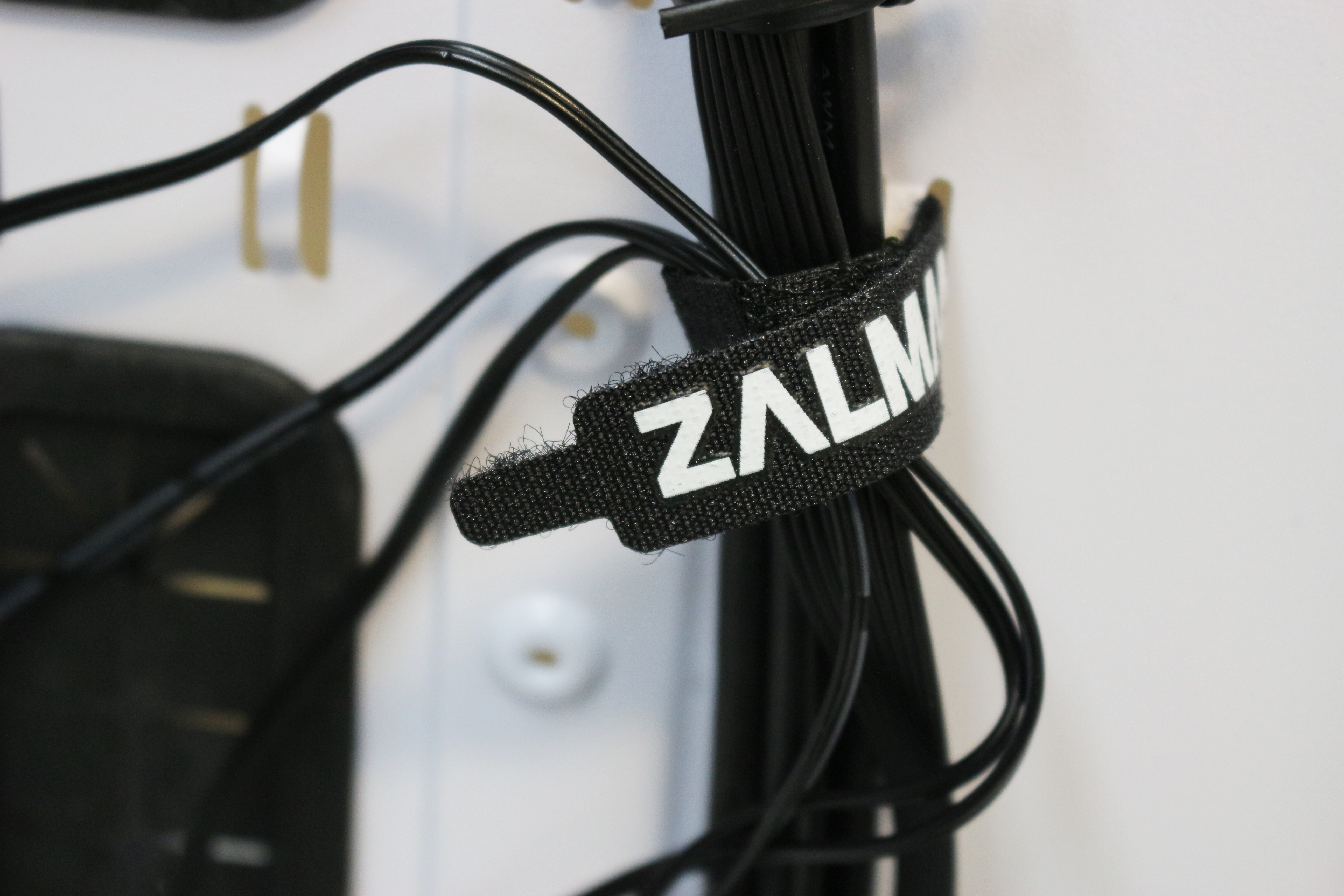 우측면 패널을 열면 전면 I/O 단자에서 나온 선들이 있는데, 잘만 로고가 있는 이쁜 찍찍이로 선정리가 되어있습니다. 보통 찍찍이는 중저가 케이스들에는 잘 없고 10만원 이상의 고가 제품들에만 들어가는데, 이 부분이 정말 좋았습니다. 욕심이지만 한 개를 추가로 줬으면 더 좋지 않았을까하는...