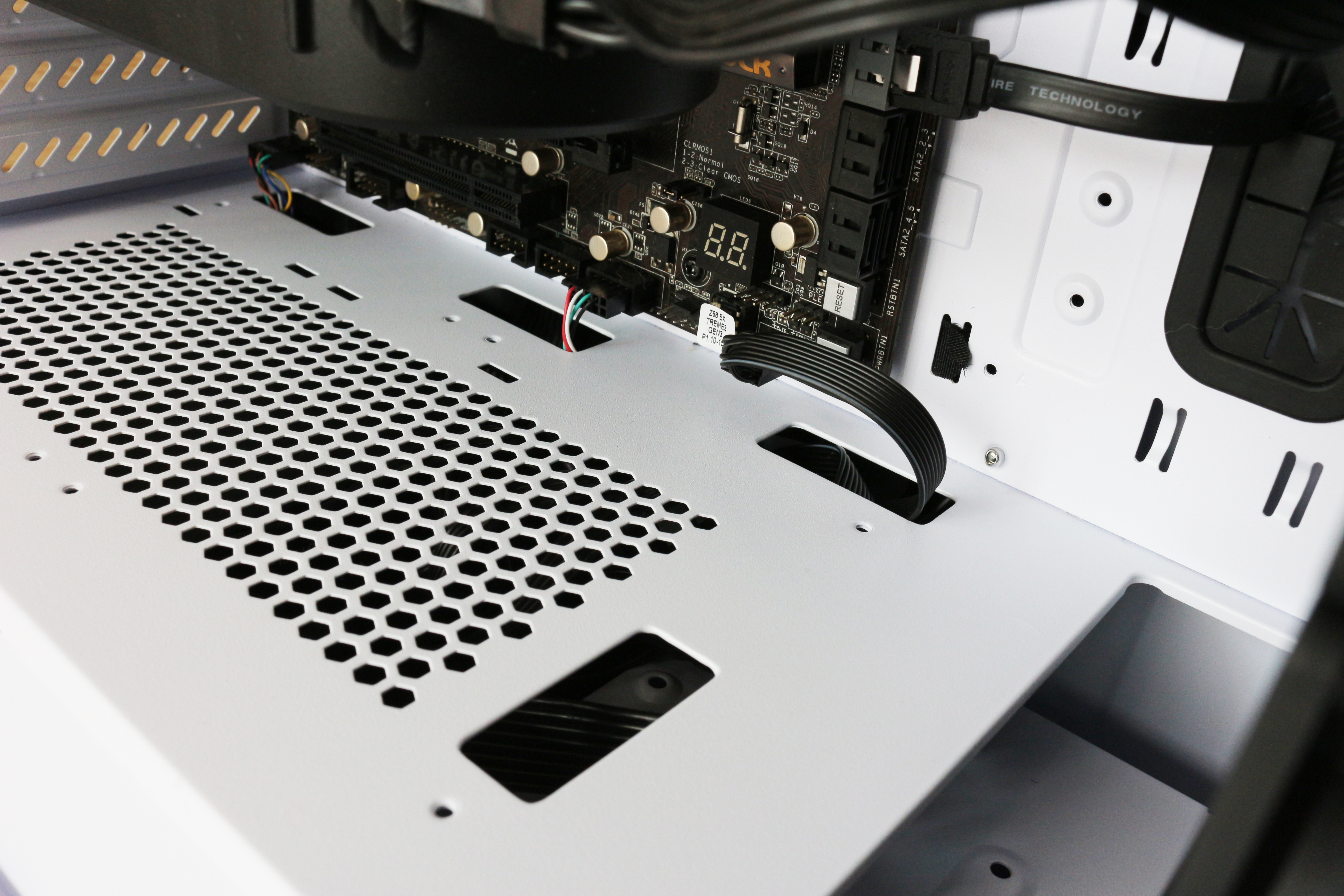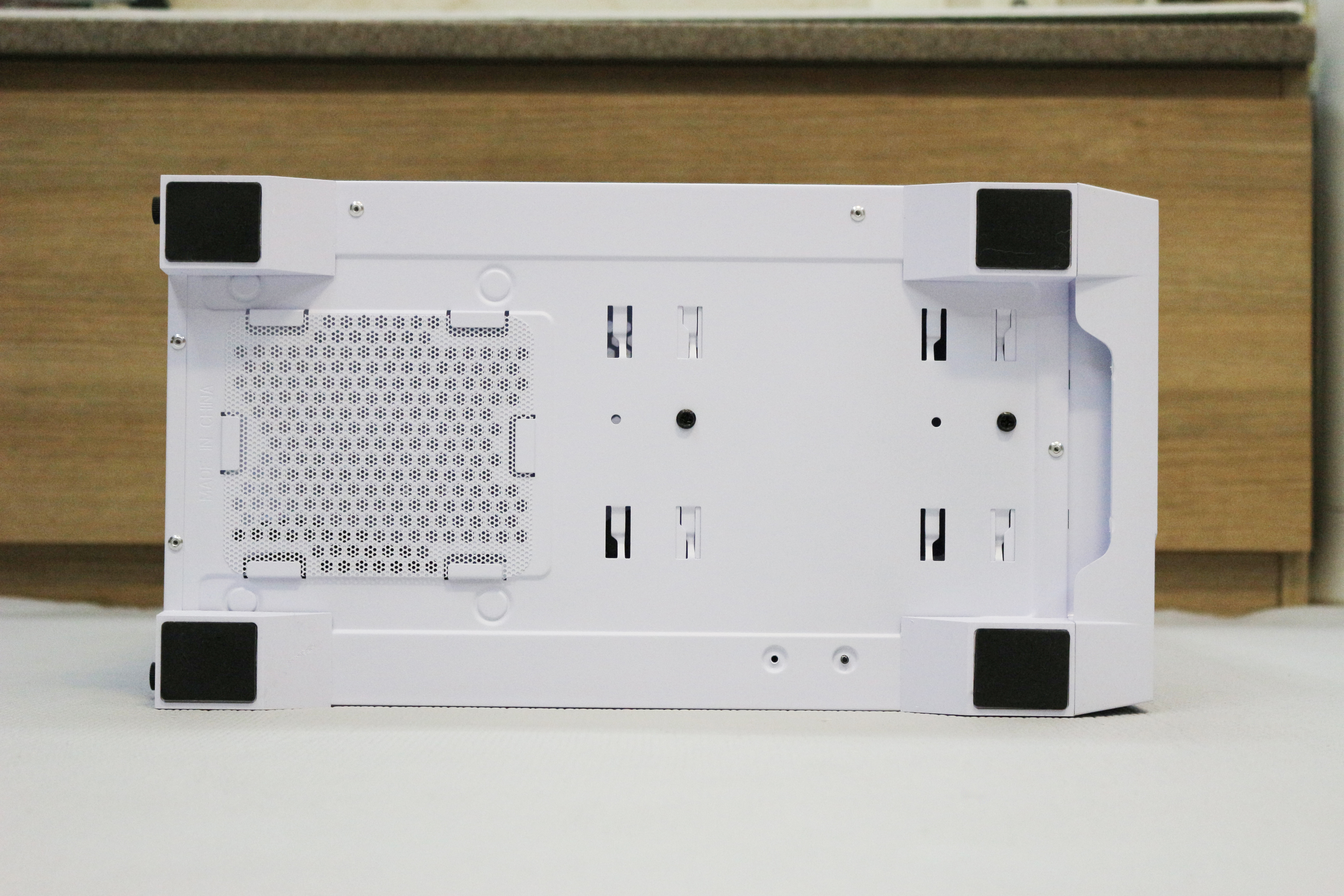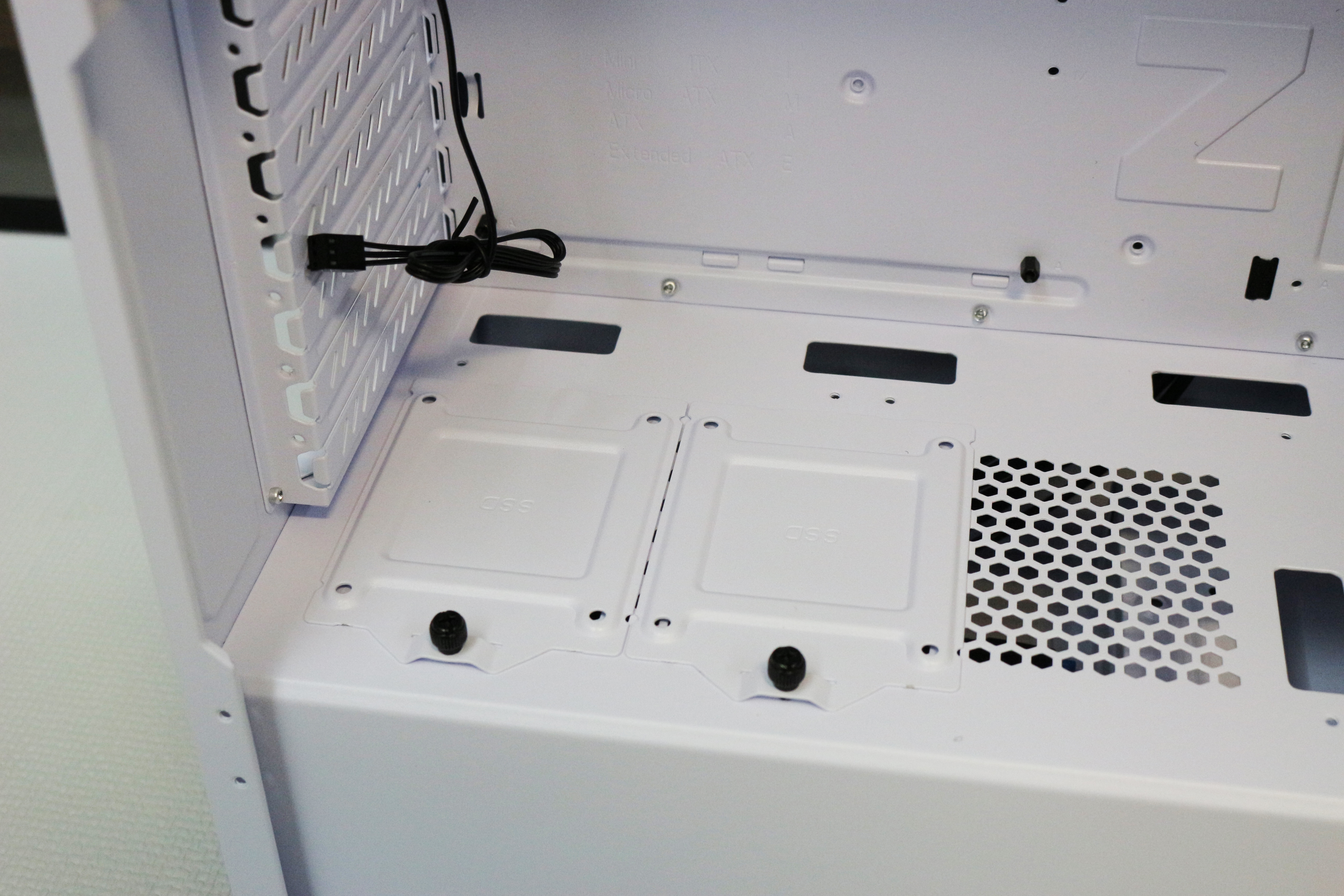 하단에도 안쪽으로 선정리 홀이 많이 있습니다. 그리고 파워 챔버쪽에는 SSD 장착부가 있는데 이 부분을 드러내면 120mm 쿨링팬 두개 장착이 가능한데, 하단 쿨러는 시스템 전체 흡기에도 도움이 되고 특히나 요즘같이 발열이 많은 그래픽카드에게 쿨링에 아주 큰 역할을 해줄 수 있습니다.