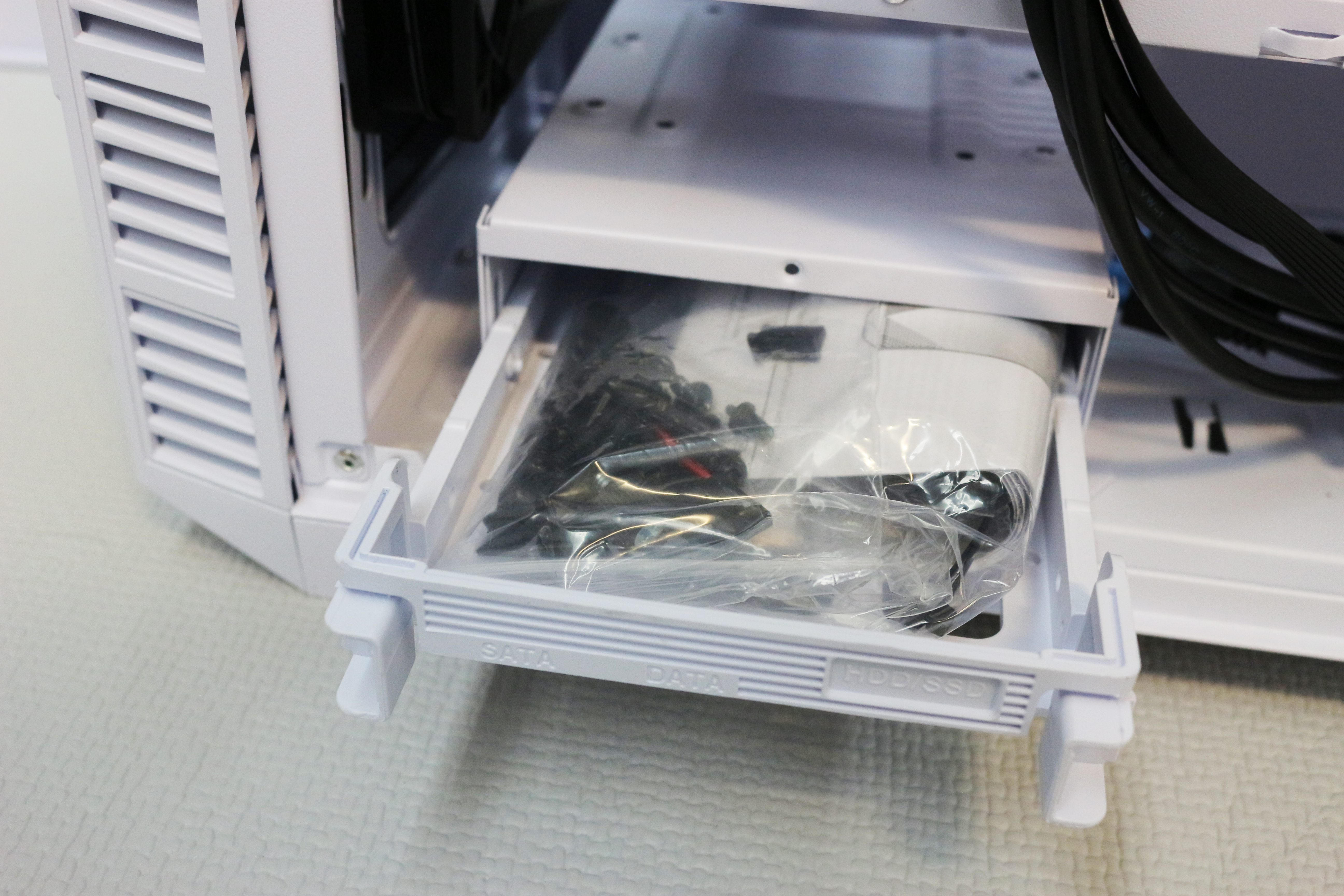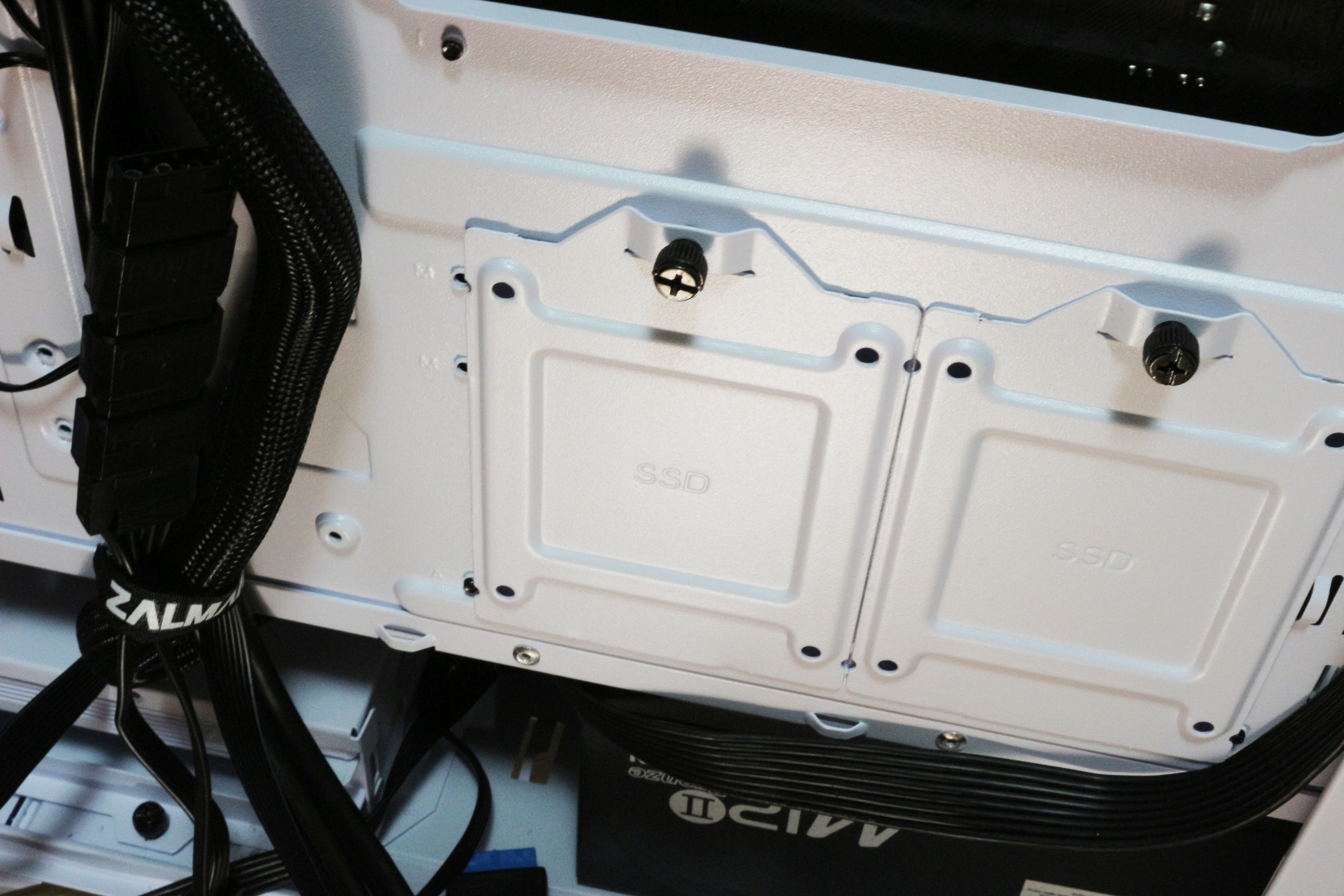 조립하는데 다른 케이스에서 보지 못한 처음보는 특이한 부분이 몇가지 있었는데 먼저 SSD 장착부입니다. SSD 장착 가이드가 일반적으로 위에서 아래로 끼우는 방식이 아니라 특이한 형태라 사진처럼 아래로 내려야 분해가 가능합니다. 아까 파워챔버쪽에있는 가이드도 마찬가지 방식입니다.
