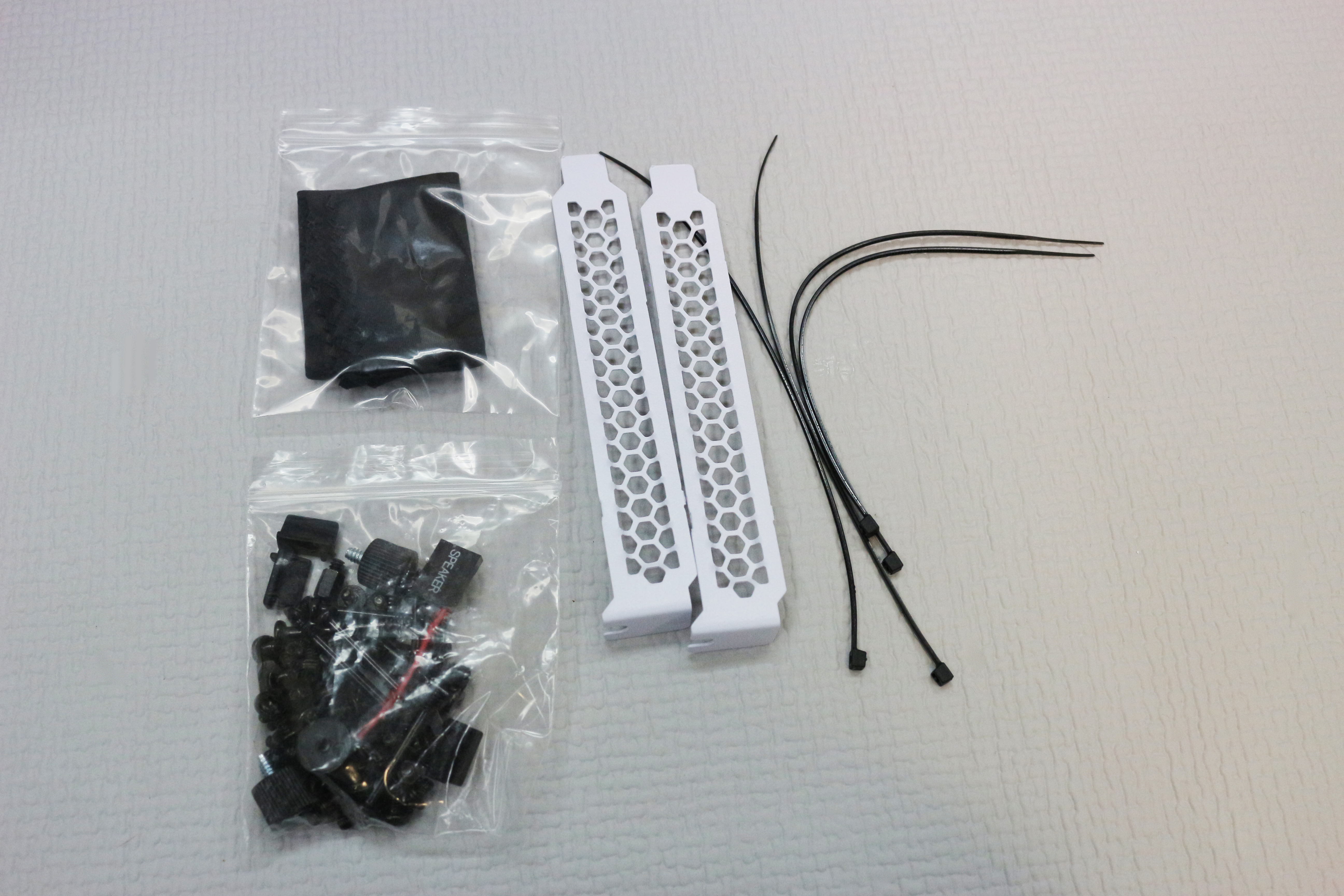 파워 장착부 앞쪽에는 하드를 장착하는 하드베이가 있습니다. 하드베이가 굉장히 특이하게 생겼는데 이부분을 열어보면 구성품인 나사와 설명서 PCI슬롯 커버 케이블 타이가 있습니다. 케이블타이는 한개 더있었는데 강아지가 물어가버렸어요....