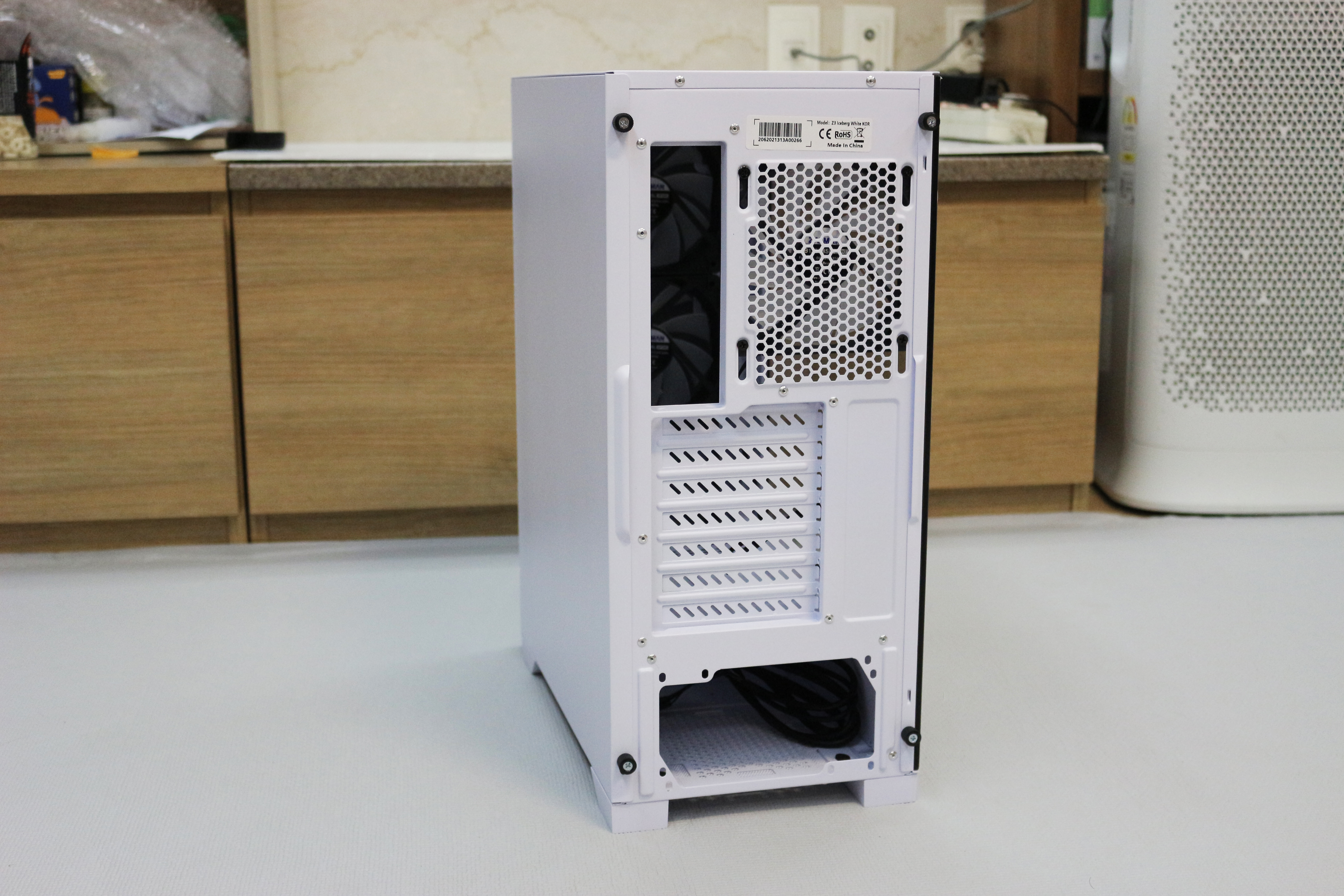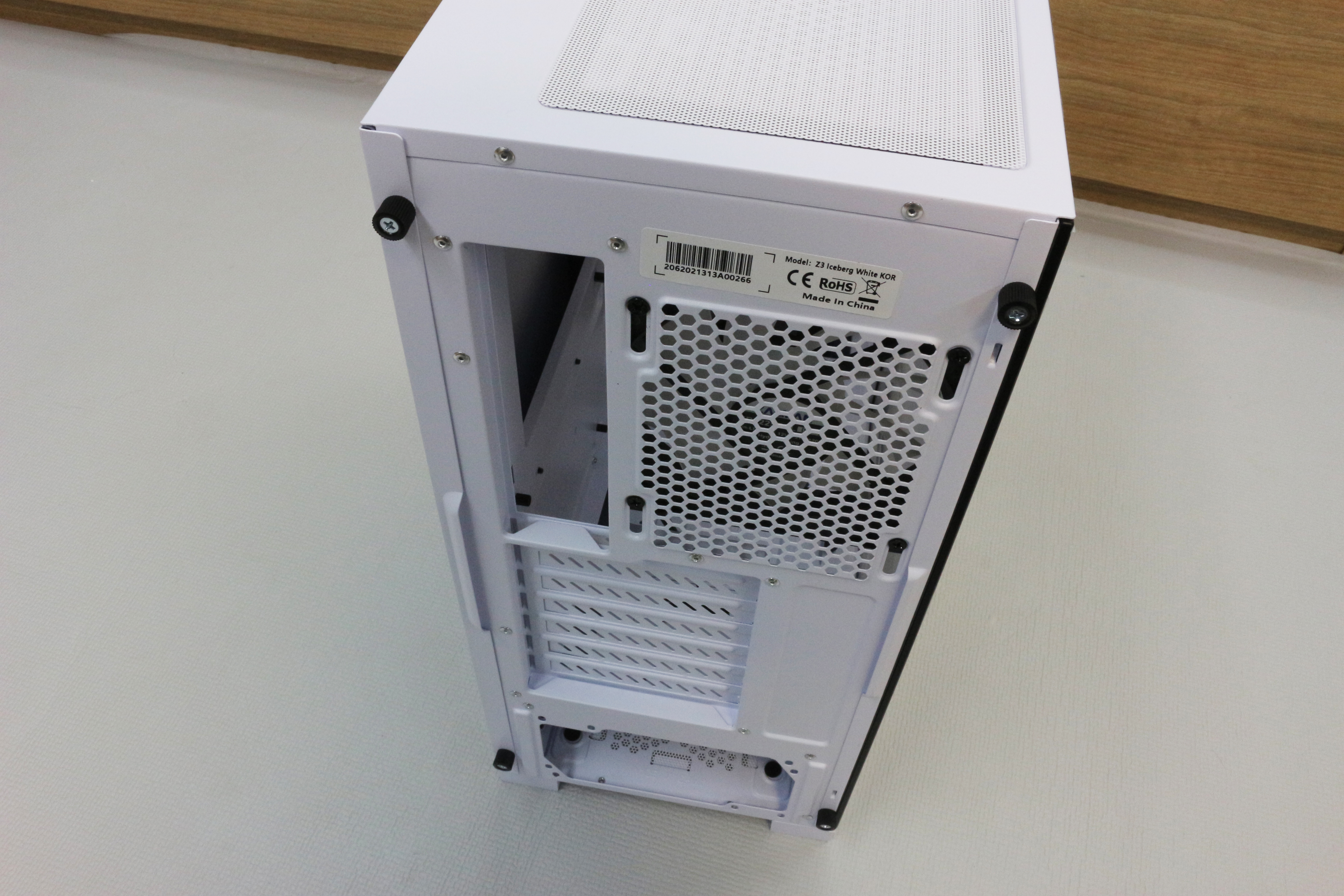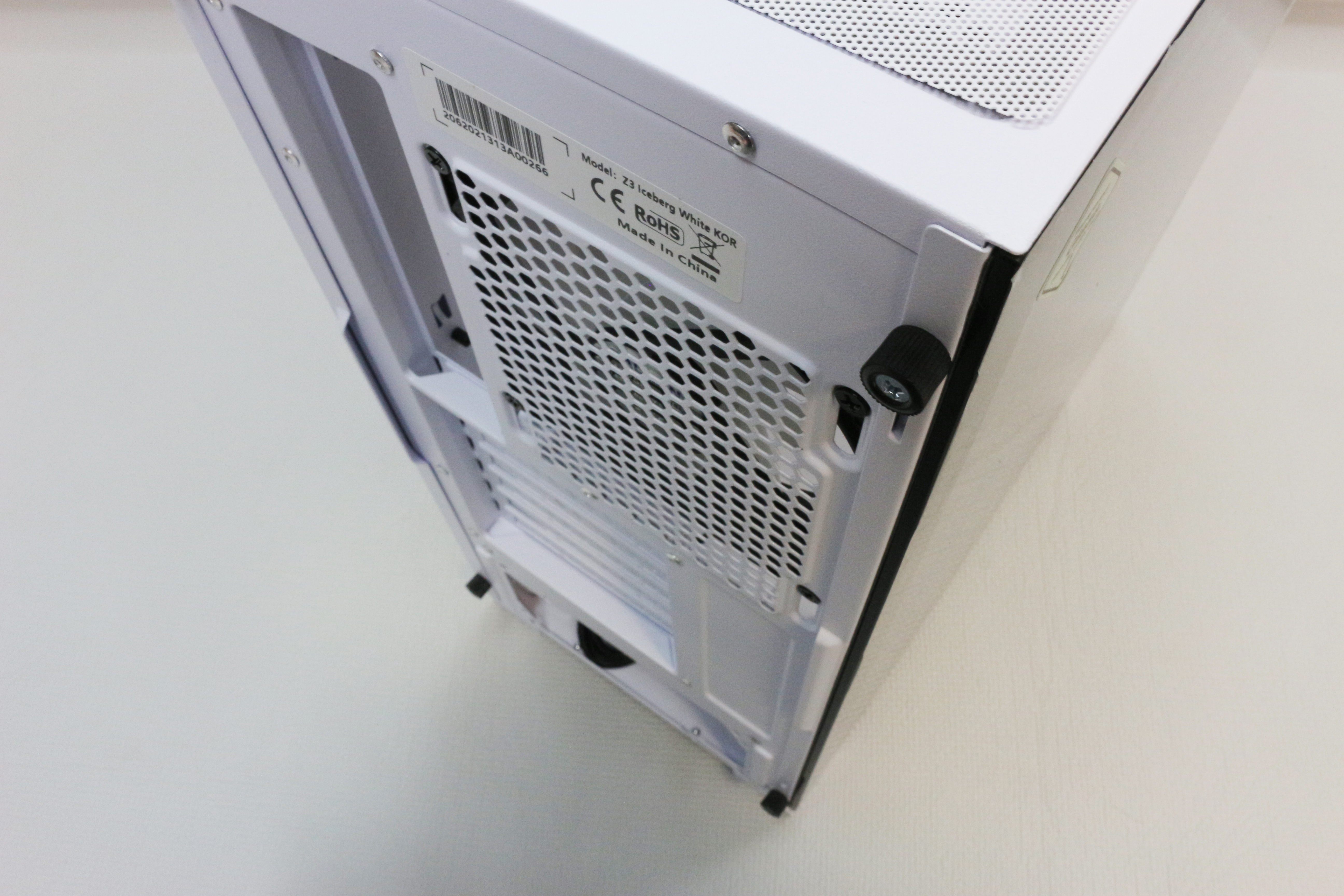 잘만 Z3 아이스버그의 특징은 후면에서 볼 수 있는데, 좌측 강화유리 패널을 고정하는 나사가 강화유리를 뚫고 지나가는 방식이 아니라 후면에서 고정하는 방식입니다. 이렇게 고정하니 강화유리를 뚫어서 나사를 고정하는 방식보다 조금더 안정적이여 보입니다.