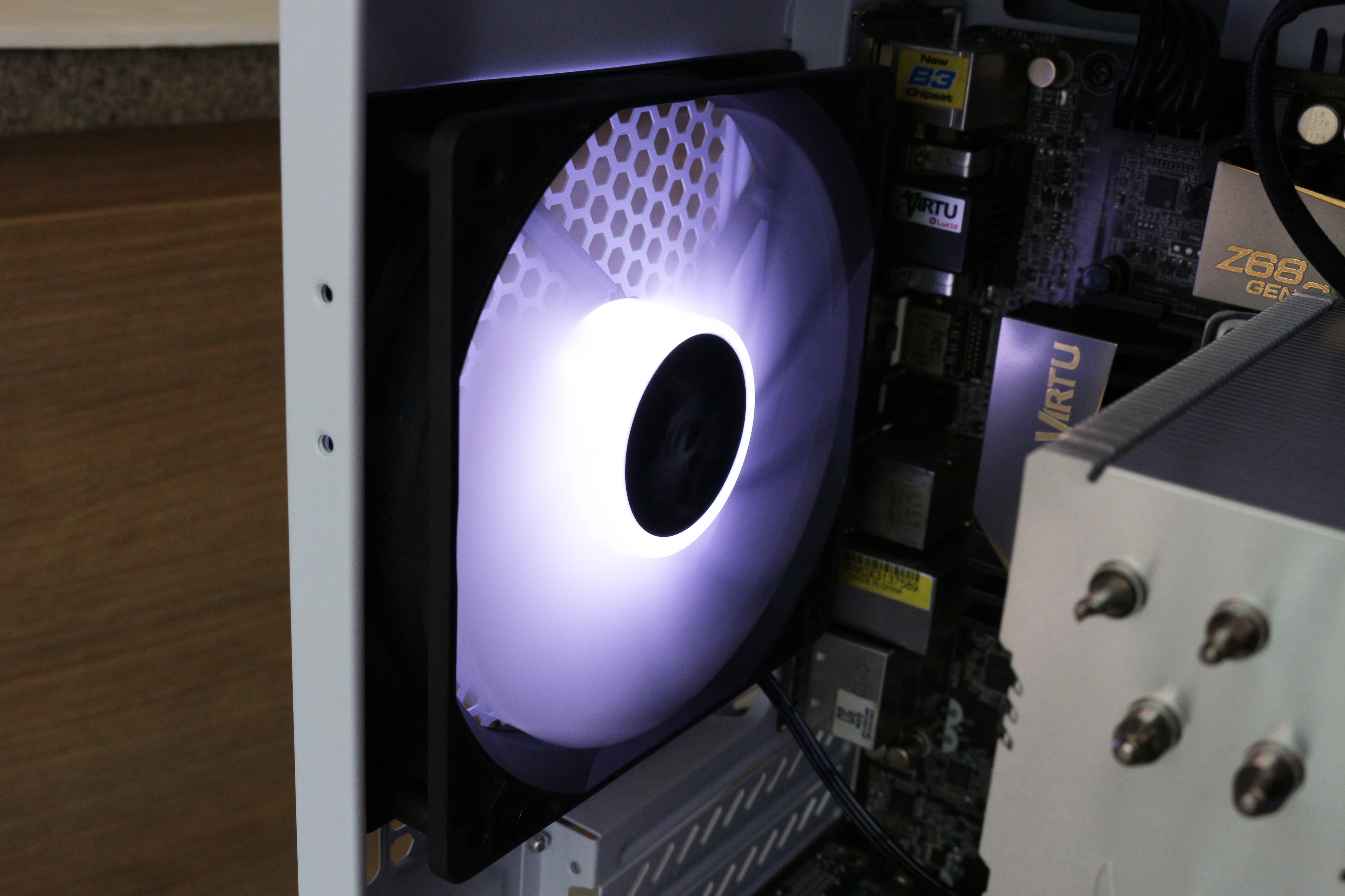 팬은 모두 화이트 LED입니다. 광량은 눈부실정도는 아니지만 충분히 밝습니다. 어두운 곳에서 봤다면 전면의 중앙 사선부분에 LED가 새어나와 더 이쁠것 같네요. 또 화이트 시스템을 맞출 분들에게는 좋을 것 같습니다. 특히 화이트 수냉 쿨러 사용하신다면 상단에 라디에이터를 넣고 사용한다면 너무 이쁠것 같아요. 저는 아쉽게도 화이트 수냉쿨러를 가지고있지 않아서 사용하지 못해봤네요. 후에 이 케이스에 조립하게 된다면 꼭 사용해보고 싶네요.