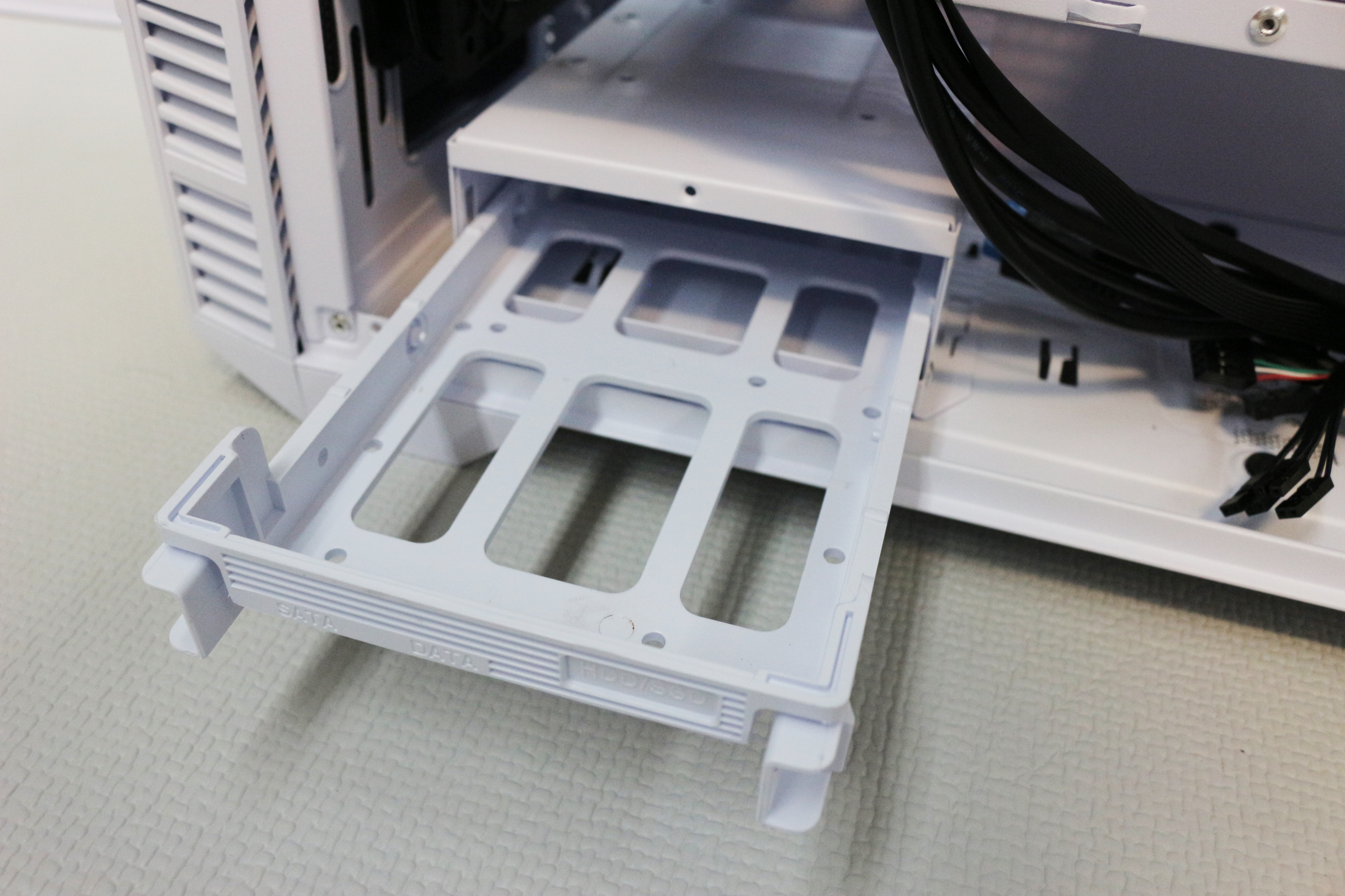 둘째로 하드 가이드인데 일반적으로는 ㄷ자 형태로 옆면과 아랫면만 있는데, 이 하드 가이드는 뒤쪽도 둘러져 있습니다. 아무래도 잘 안보일때 SATA 선과 전원을 연결하기 용이하게 해놓으려고 한것 같은데, 개인적으로는 저것때문에 하드를 더 장착하기 어려웠던것 같습니다. 하드 가이드에 하드를 장착하려면 가이드를 벌려야하는데 저렇게 뒤쪽에서도 잡고있으니 벌려지지가 않았어요.