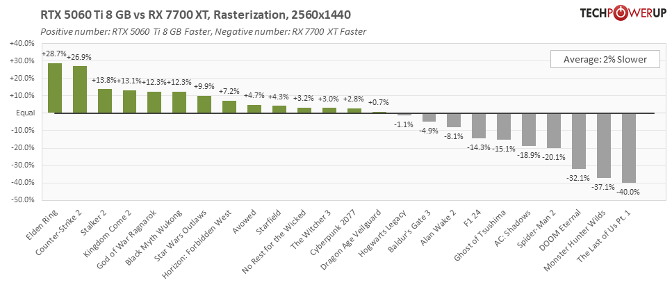12GB VRAM을 가진 Radeon RX 7700 XT가 항상 더 빠른 것은 아닙니다. 일부 게임에서는 5060 Ti 8GB가 더 나은 결과를 보일 수 있습니다.