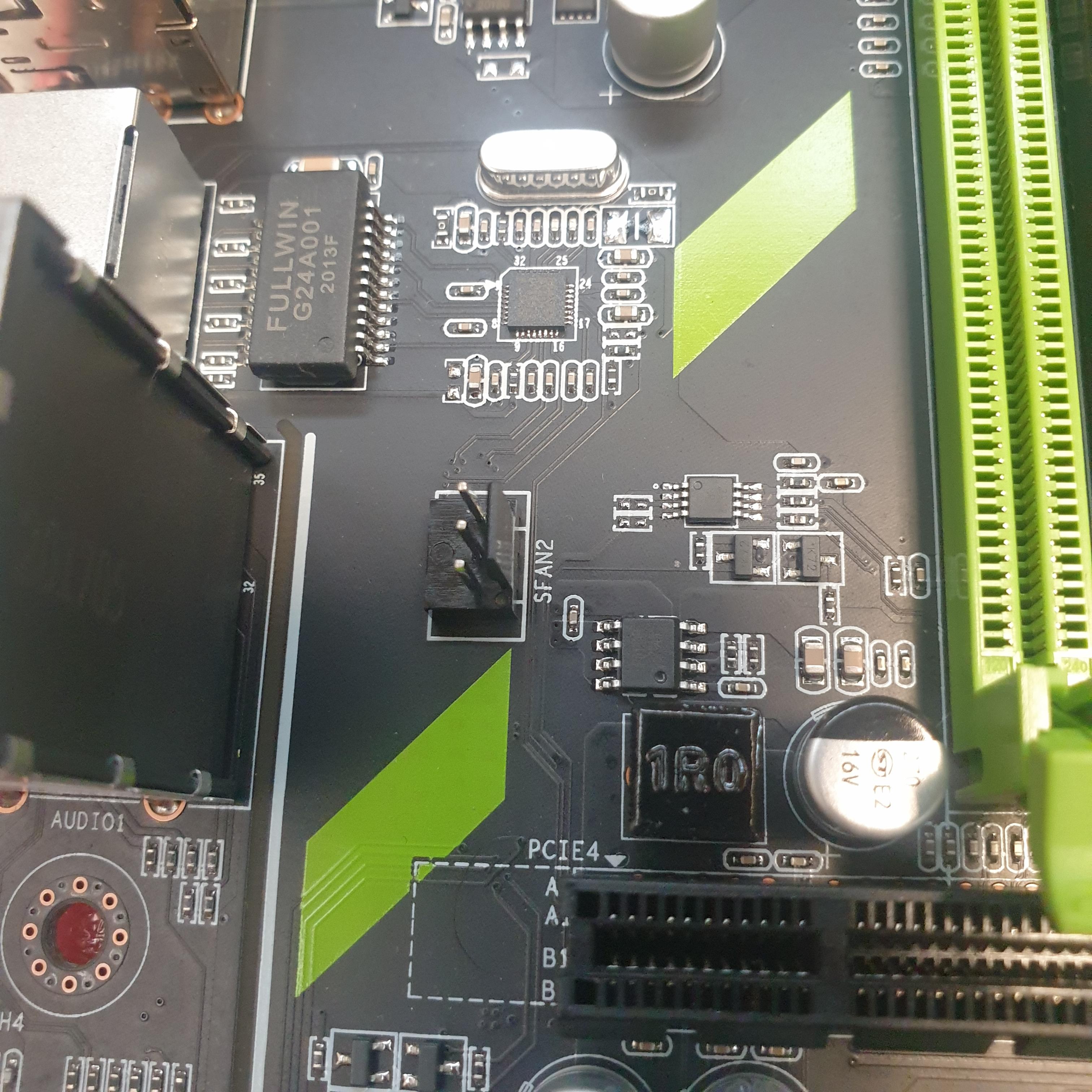 오른쪽 메모리슬롯 상단 우측에 CPU FAN 단자가 있고, CPU 소켓 아랫 부분에는 SYSTEM FAN 4핀 단자가 있습니다. I/O와 왼쪽 메모리슬롯 사이에는 SYSTEM FAN 3핀 단자가 있습니다.